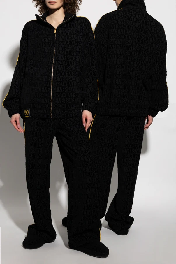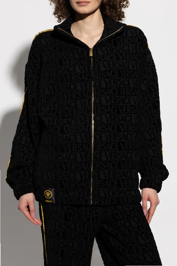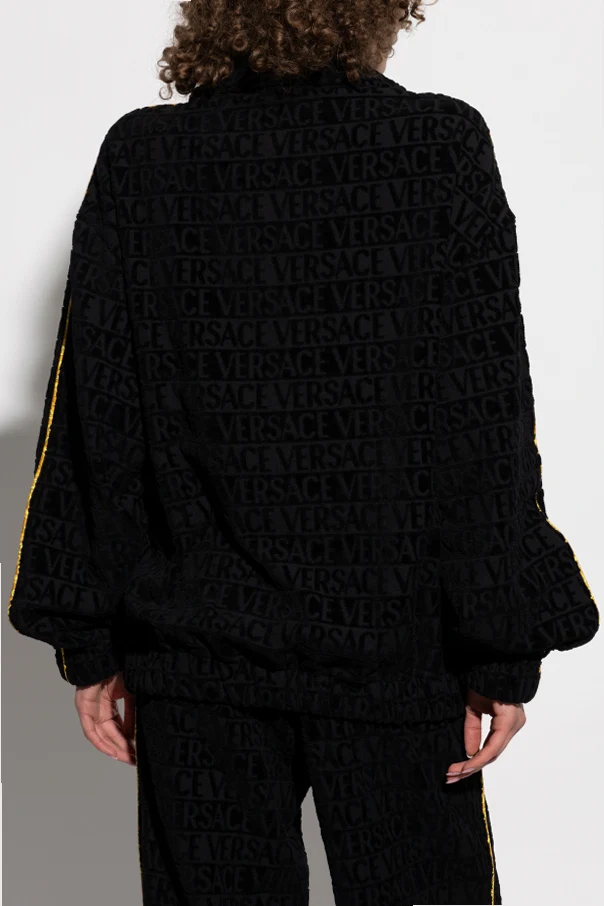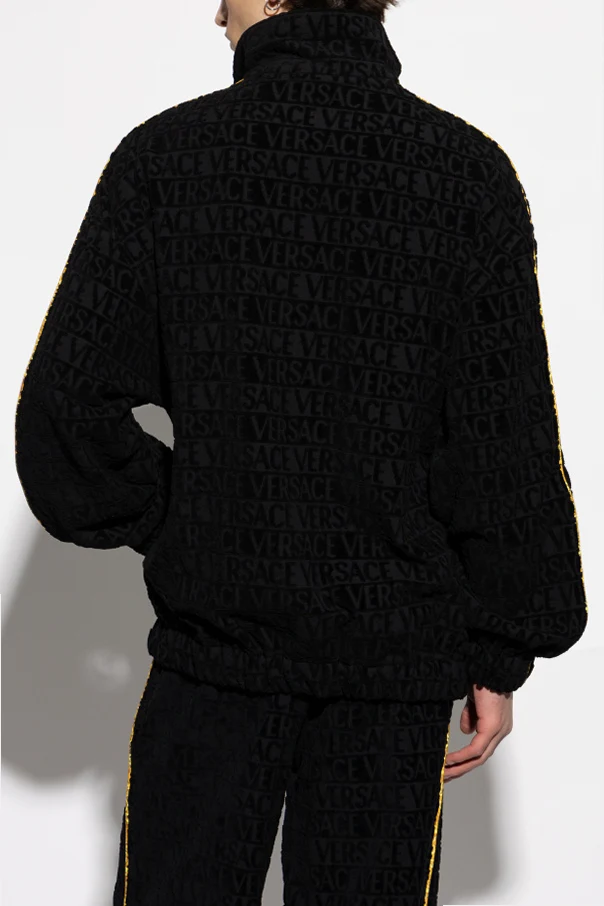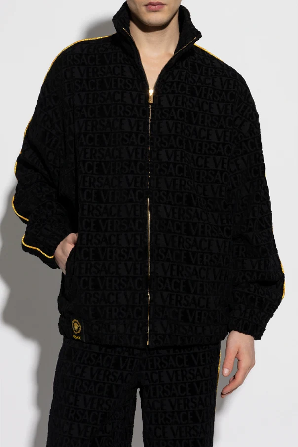 Der durchgehende Reißverschluss und der hohe Kragen unterstreichen seine Funktionalität, während das sich wiederholende Muster mit dem Schriftzug "VERSACE" dem Design einen einzigartigen Charakter verleiht. Unten links befindet sich ein Aufnäher mit dem ikonischen goldenen Lorbeerkranz und dem Medusakopf, der das Prestige der Marke symbolisiert.