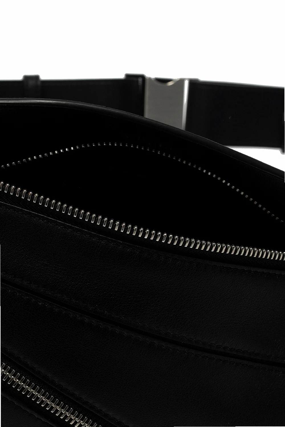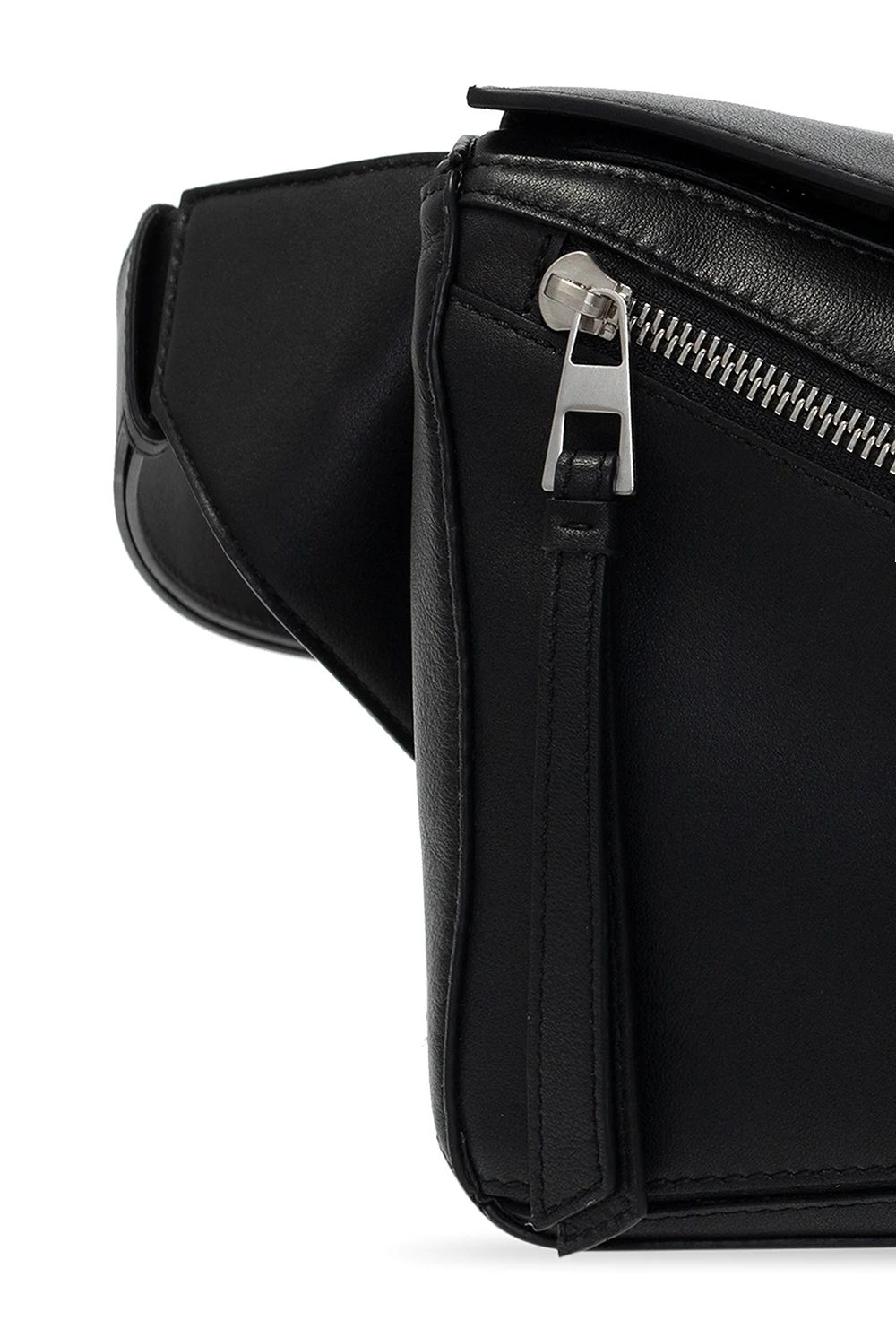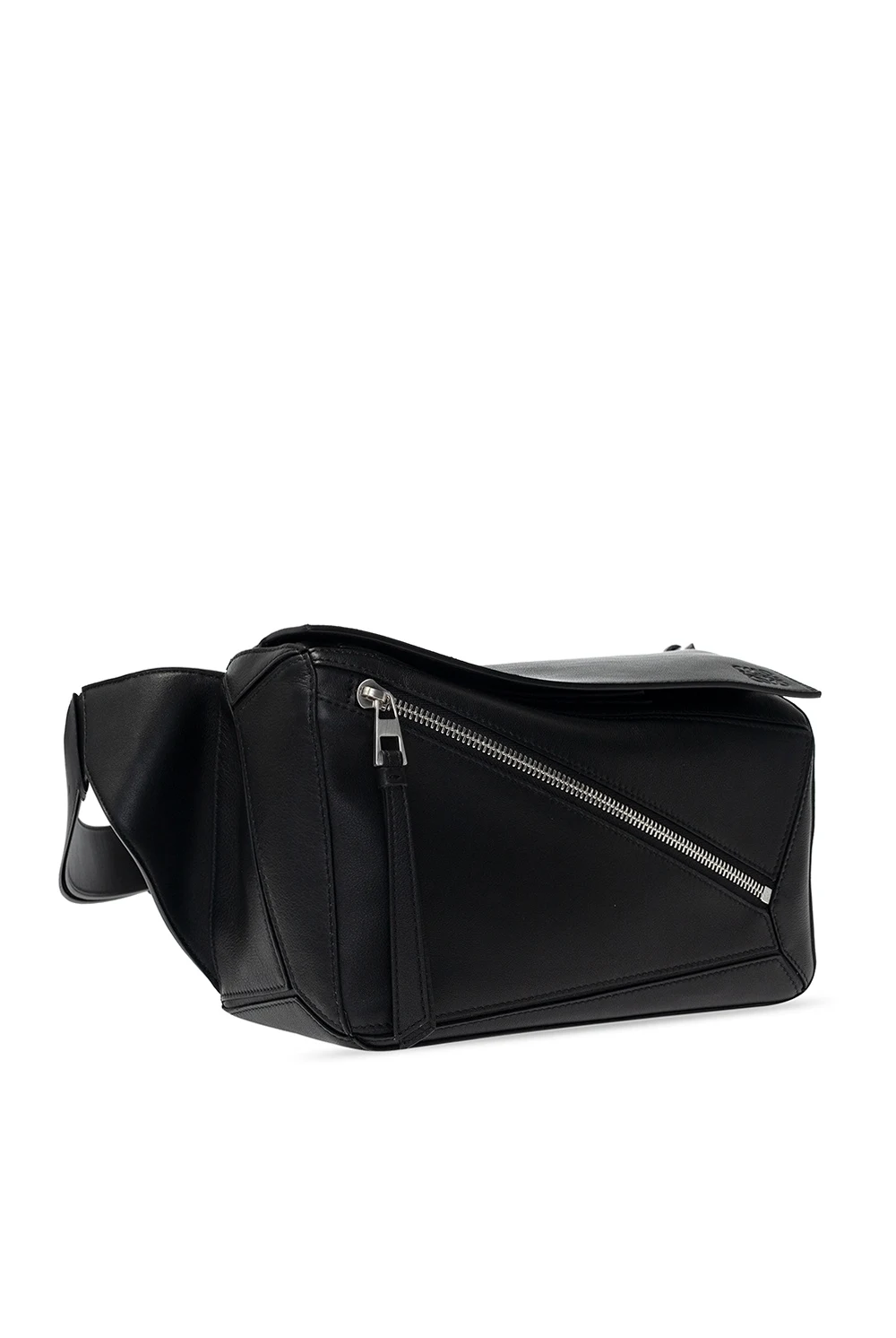 Black ‘Puzzle’ belt bag from Loewe. Size large. Crafted from calf leather, this model fastens with a zip and is enriched by an embossed logo. It is complete with a front zip pocket, adjustable strap with a silver-tone buckle, cotton lining and one internal compartment with one slip pocket.