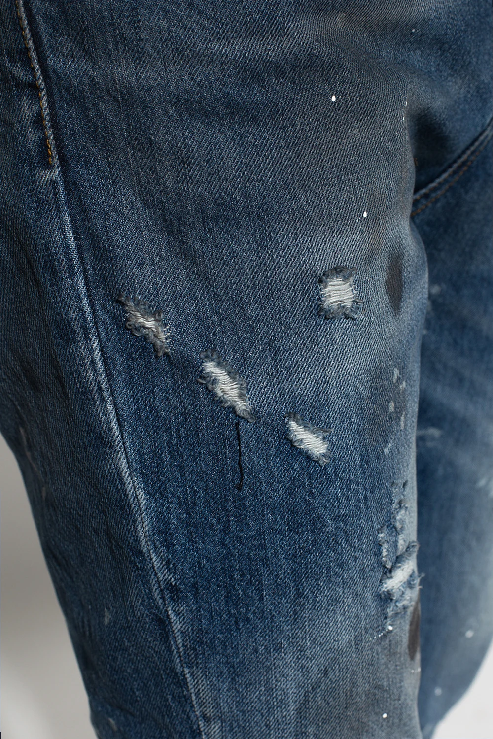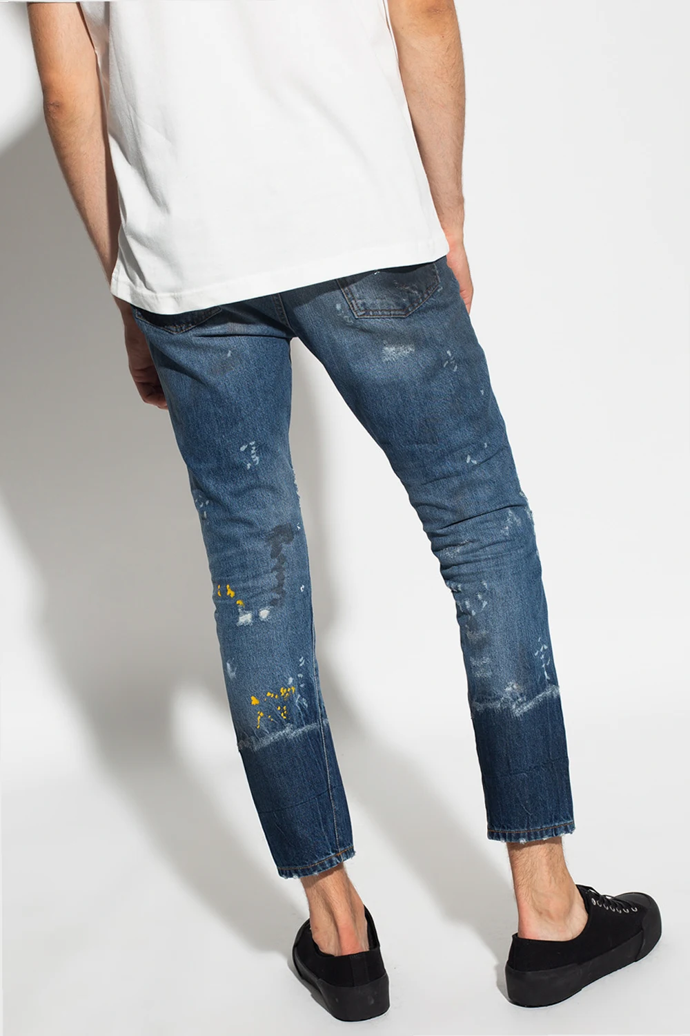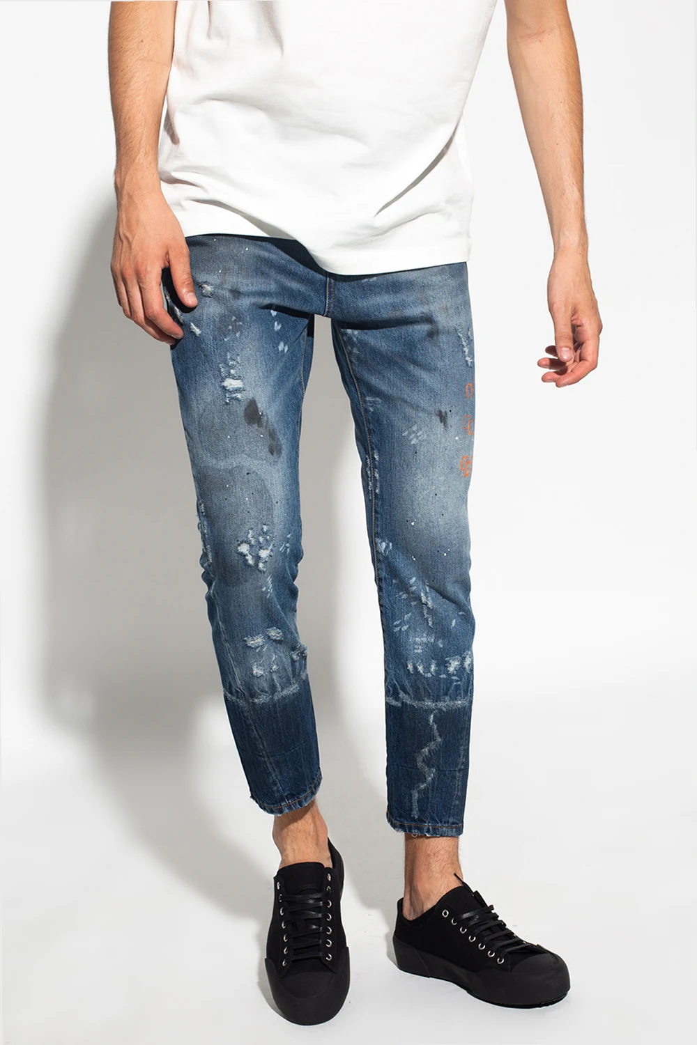 Navy distressed jeans from John Richmond. Made of cotton, this pair falls down with tapered legs and features a worn effect, five pockets and a logo-embossed patch at the back.