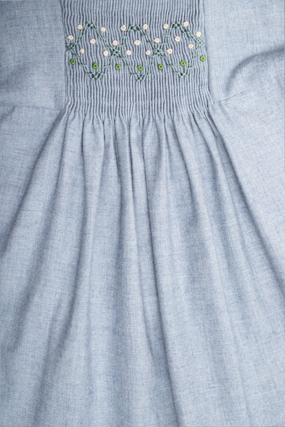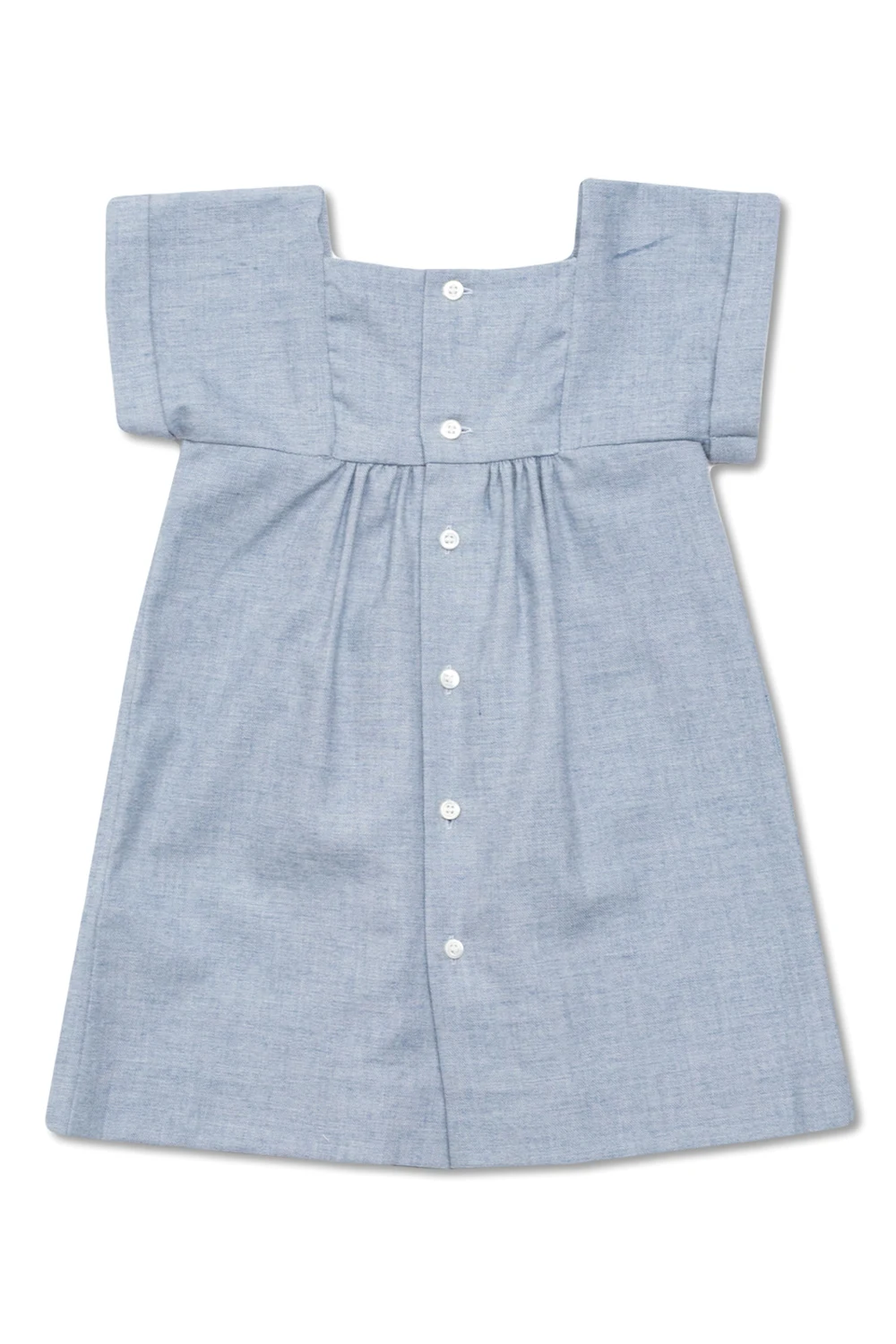 Blueish-grey dress from Bonpoint. Crafted a from cotton and wool blend, this style showcases an embroidered floral motif, back button fastenings, short sleeves with turn-up cuffs and a flared hem.