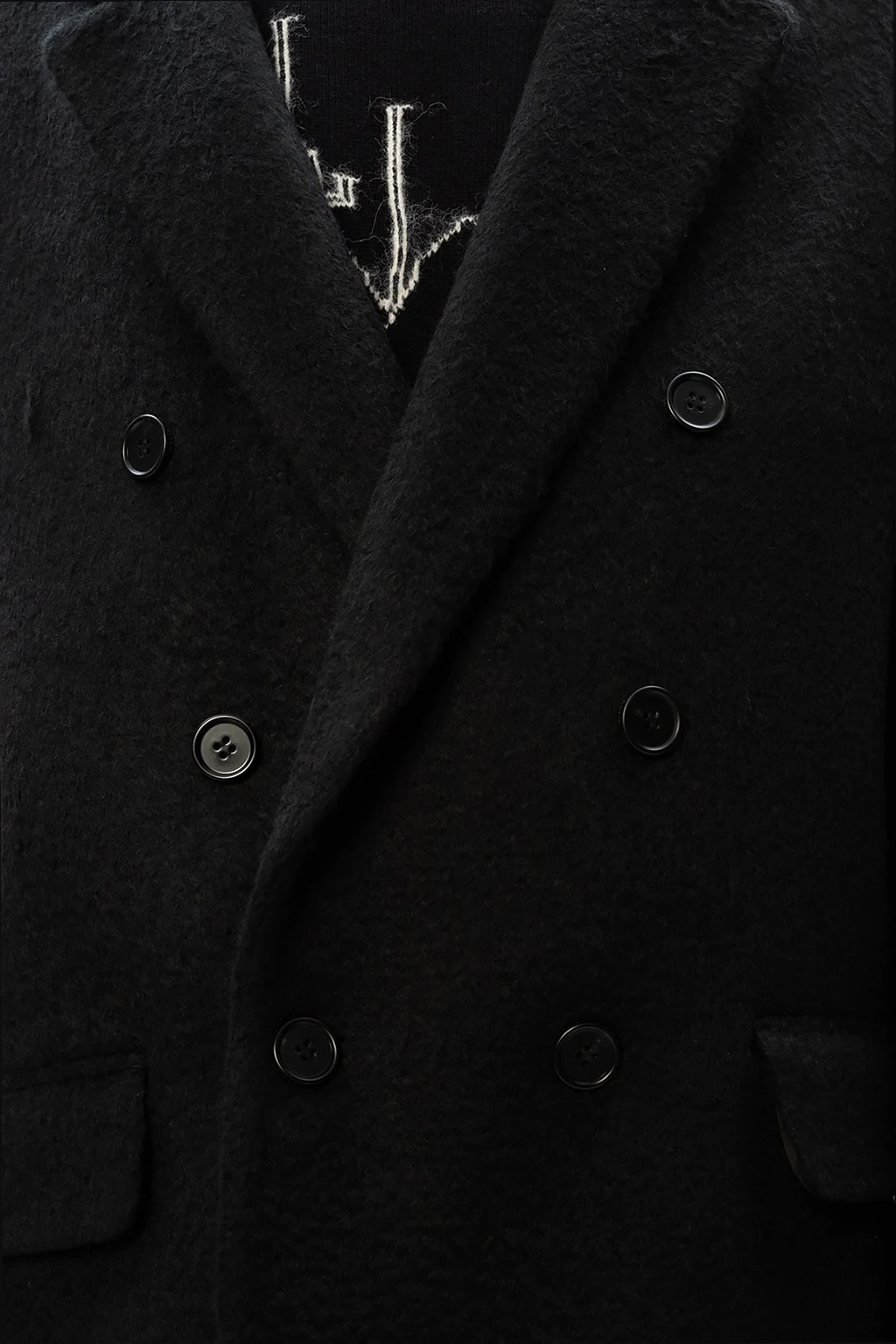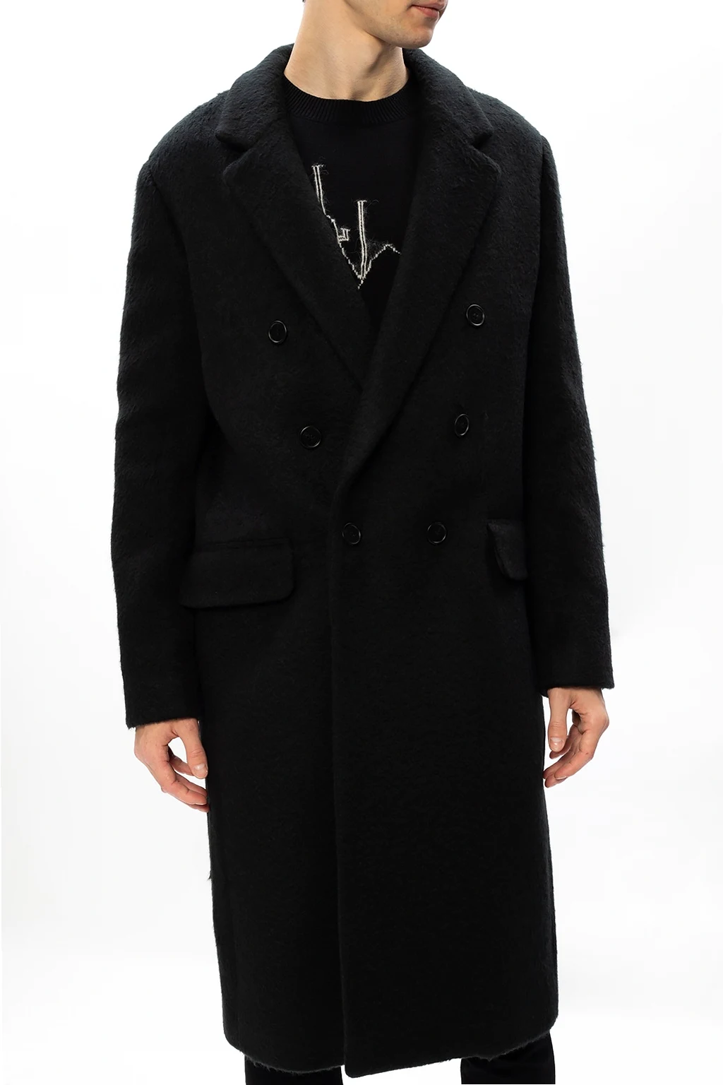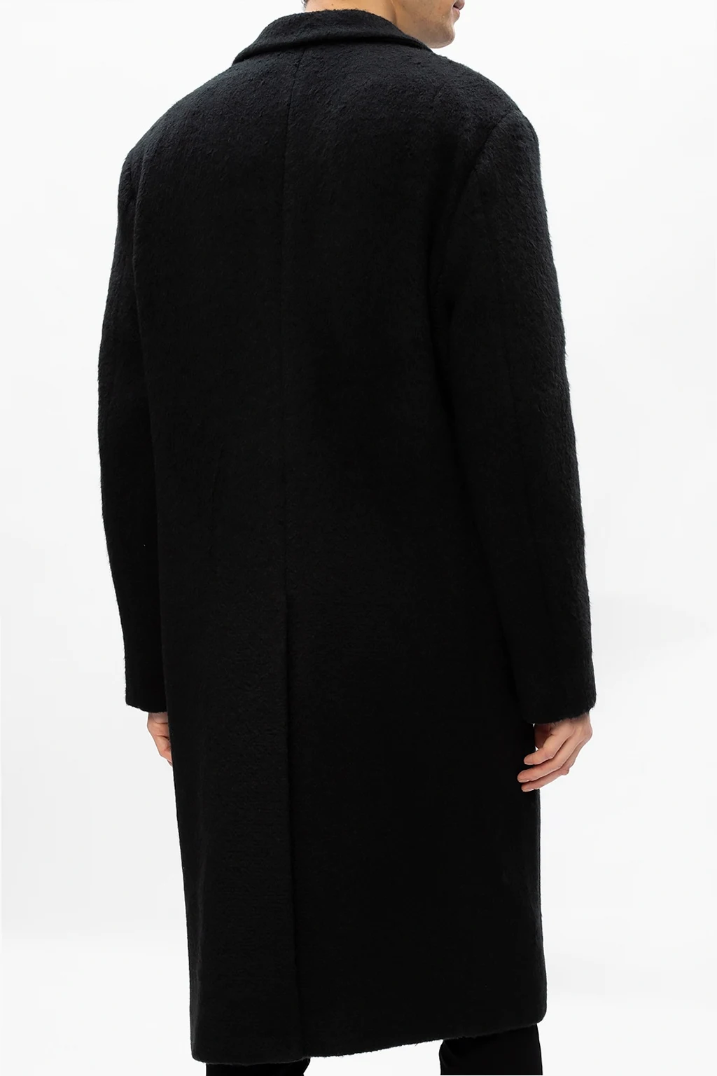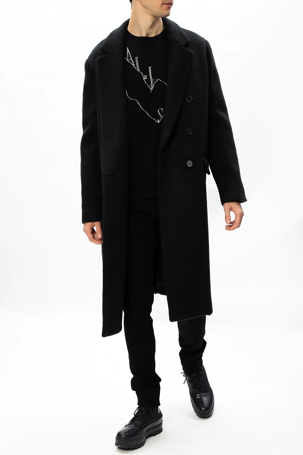 Black 'Campo' coat from AllSaints. Boasting a double-breasted silhouette, this wool-crafted piece of outerwear fastens via buttons and employs notched lapels, two flapped pockets on the front and single vent on the back.