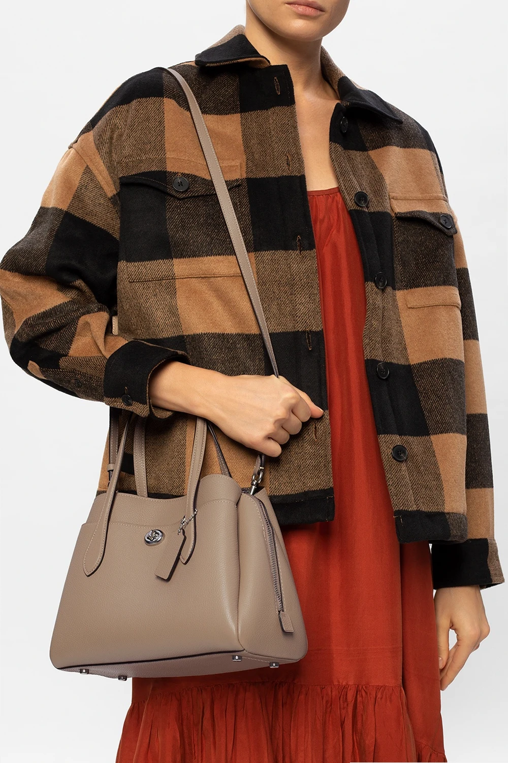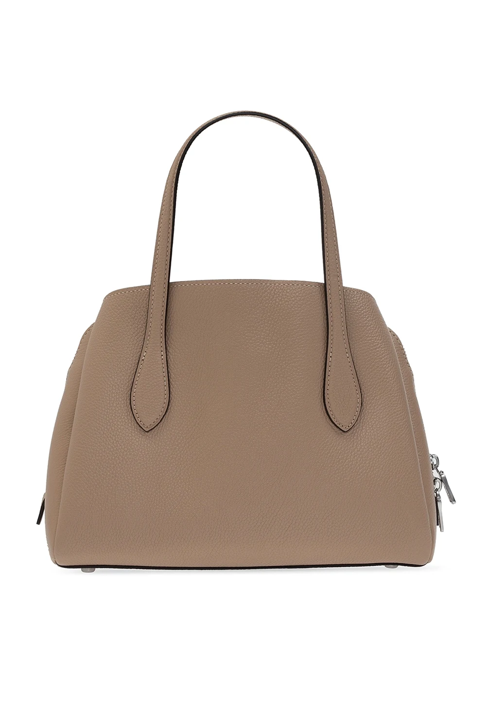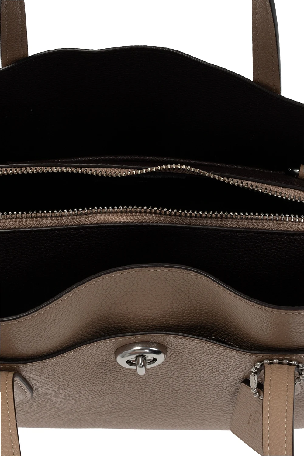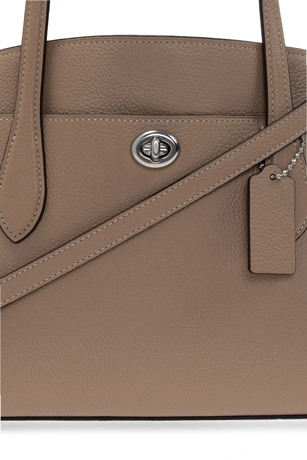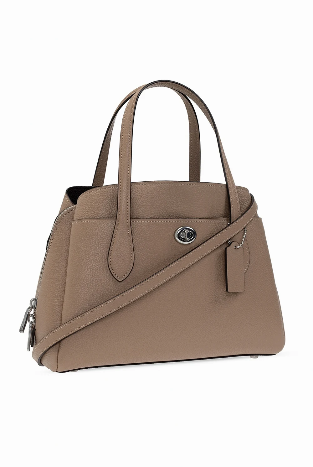 Beige and brown 'Lora' shoulder bag from Coach. Crafted from grainy leather, this design comes with an external pocket with a distinctive fastener on the front, two half-round handles, a detachable and adjustable shoulder strap, silver-tone hardware details and brown clad interior with three separate compartments, including one with two-way zip closure and a snap-fastened pocket inside.