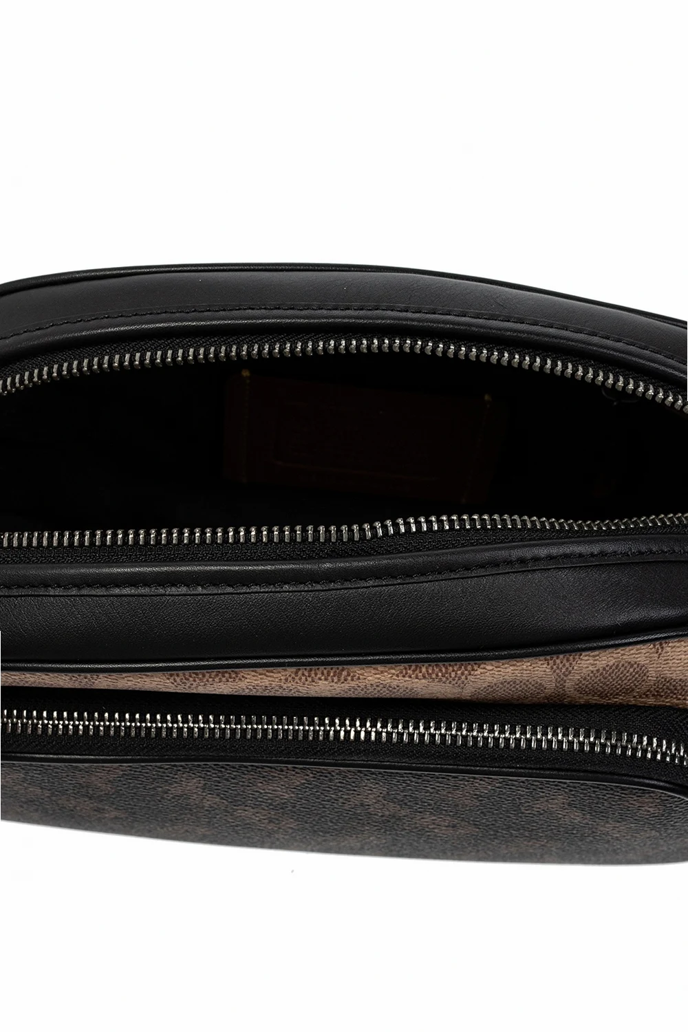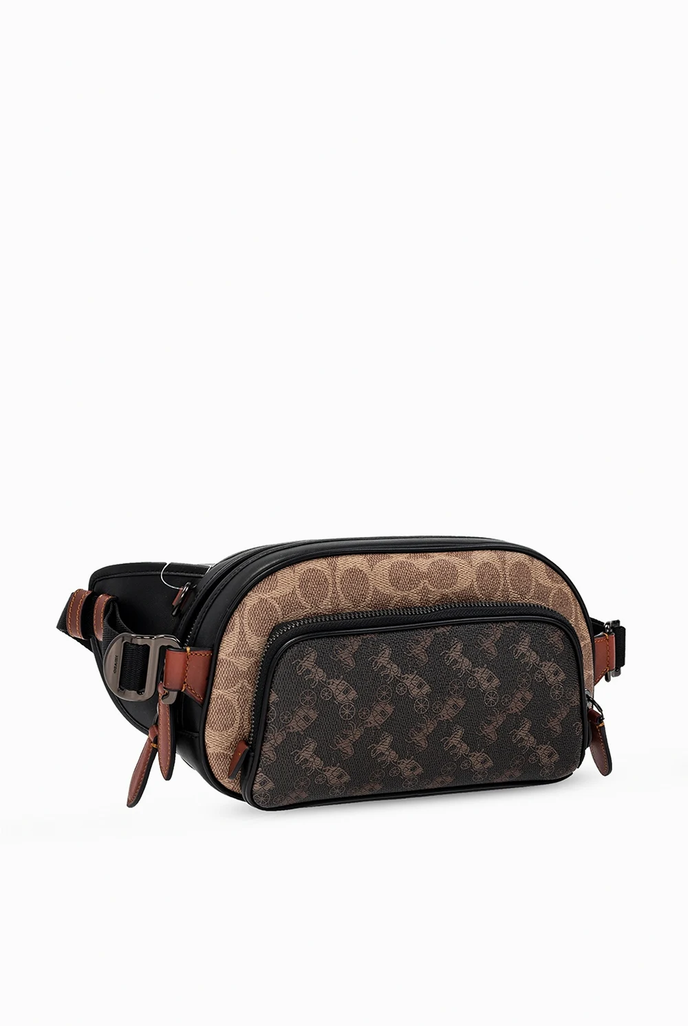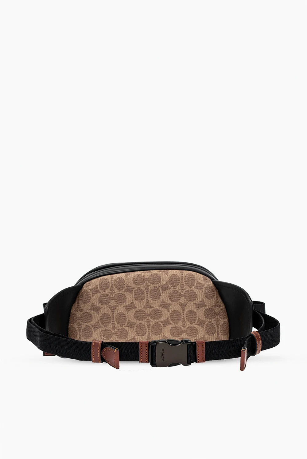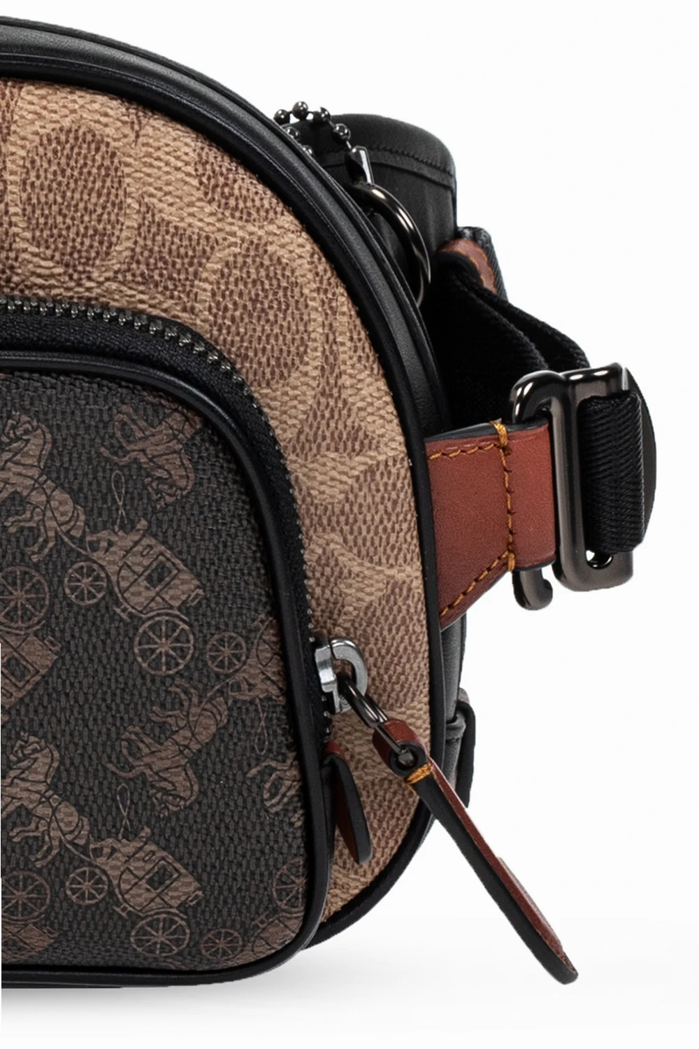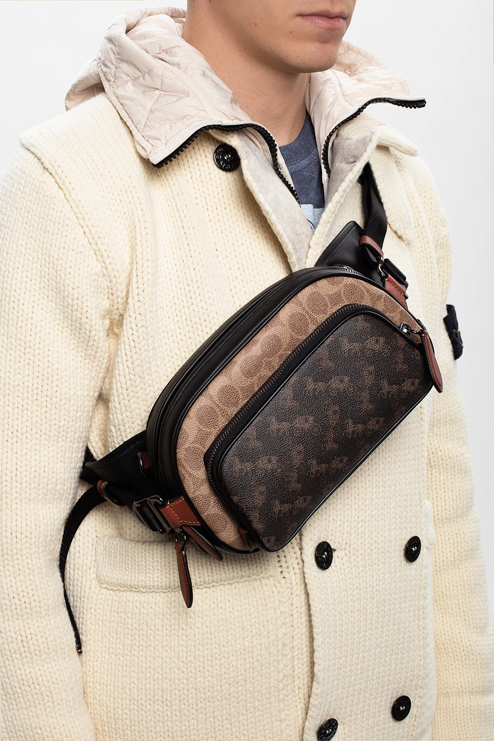 Brown, beige and black 'Hitch' belt bag from Coach. Crafted from leather and canvas donning the brand's iconic print, this design secures with two-way zip fastening and employs an external zipped pocket on the front, an adjustable strap and grey clad interior with one compartment and one zipped pocket.