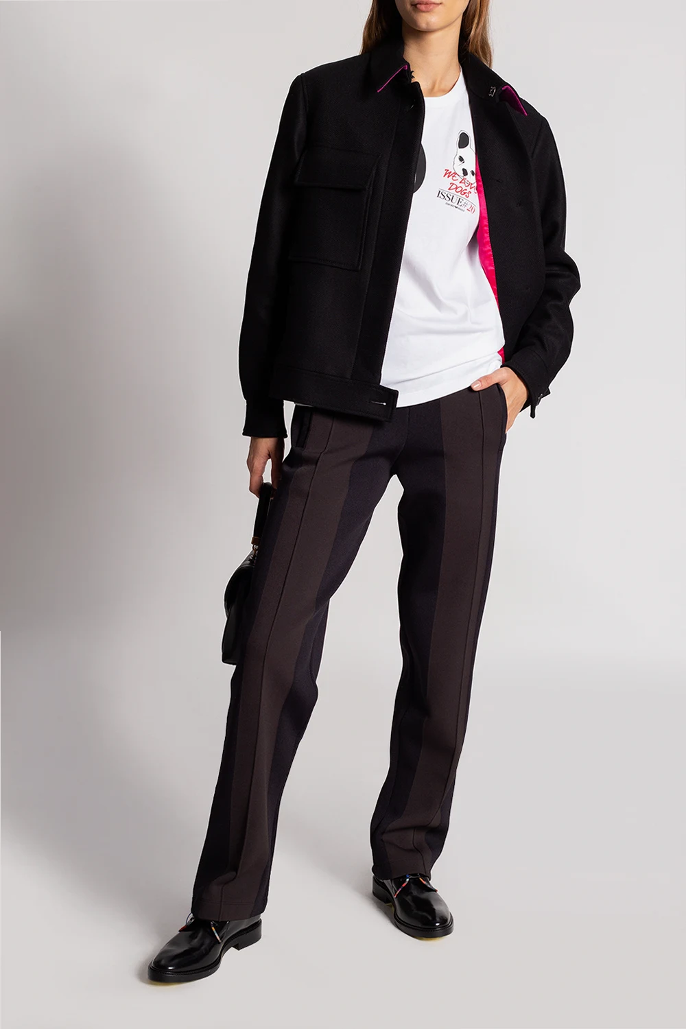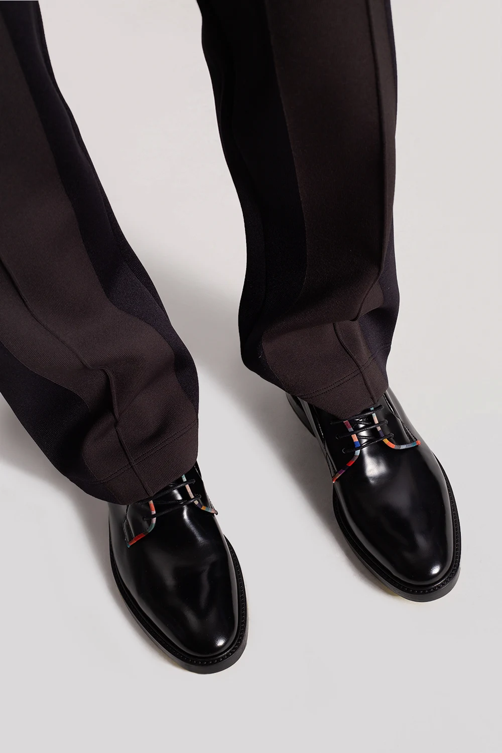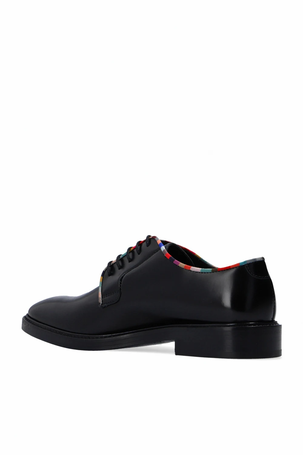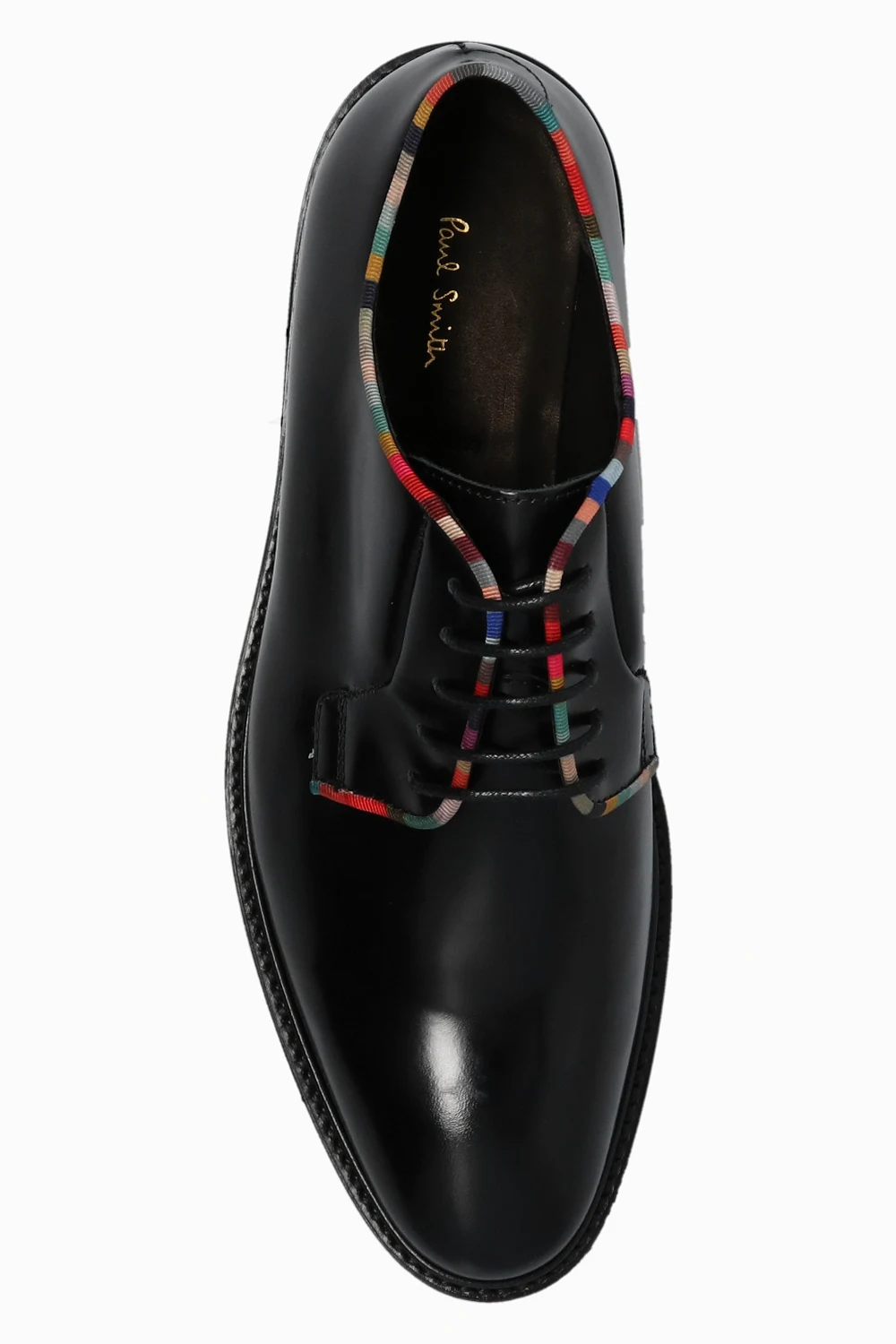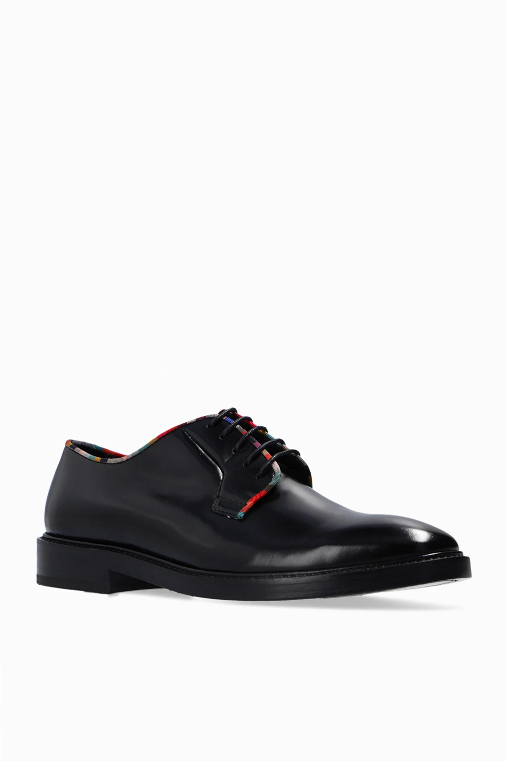 Black ‘Turner’ shoes from Paul Smith. Crafted from patent leather, this lace-up model sits on a black leather sole and features a colourful, ribbed trim.