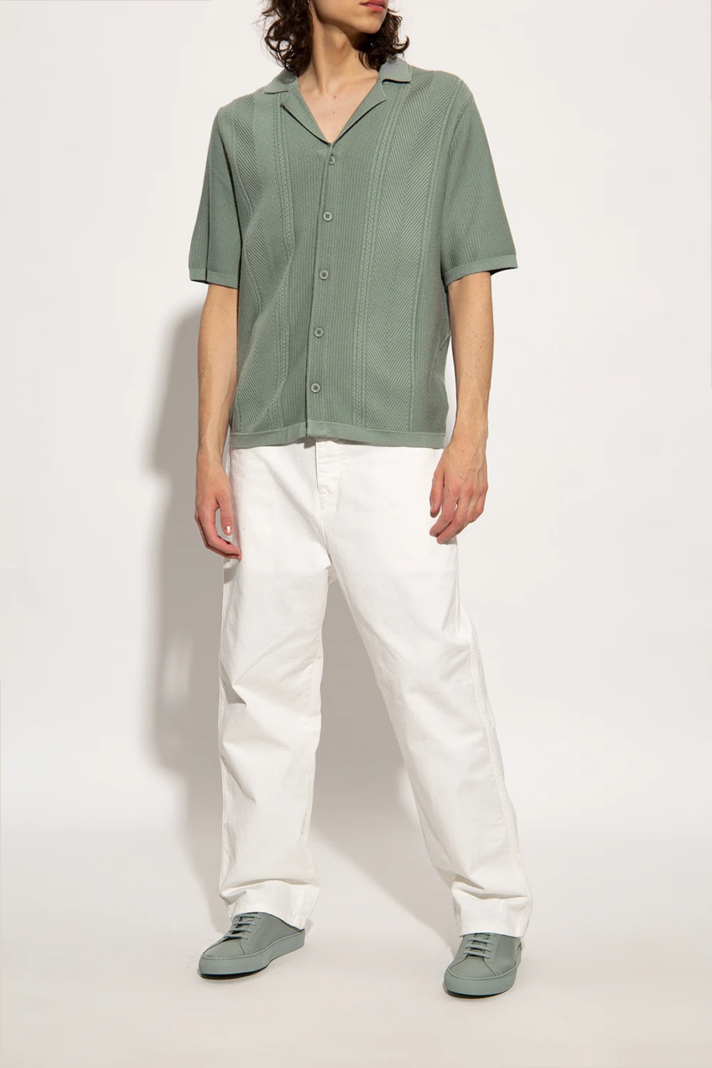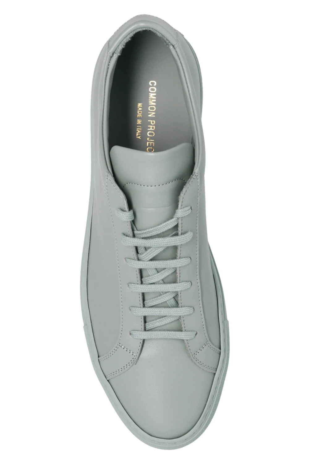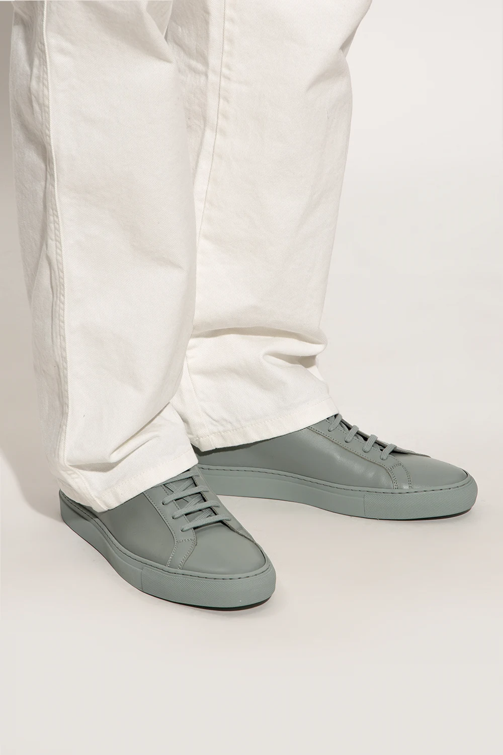 Greenish grey ‘Original Achilles Low’ sneakers from Common Projects. Made of leather, this lace-up pair features a gold-tone print, greenish grey rubber sole and swappable laces.
