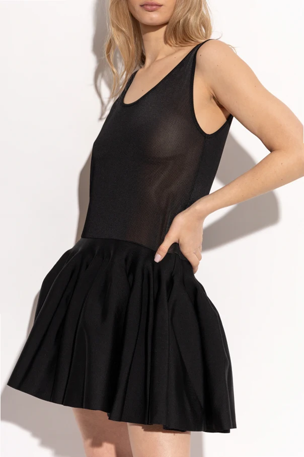 Das Kleid zeichnet sich durch ein tailliertes Oberteil und einen ausgestellten Rock aus, die die weibliche Silhouette betonen. Der obere Teil aus halbtransparentem Material verleiht Leichtigkeit und Subtilität, während der plissierte Rock Volumen und Eleganz bietet. Der tiefe U-Ausschnitt vorne und hinten sorgt für Stil und Sinnlichkeit.