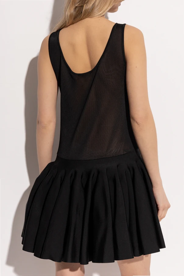 Feminine und elegante Verarbeitung mit halbtransparentem Material und plissiertem Rock.
