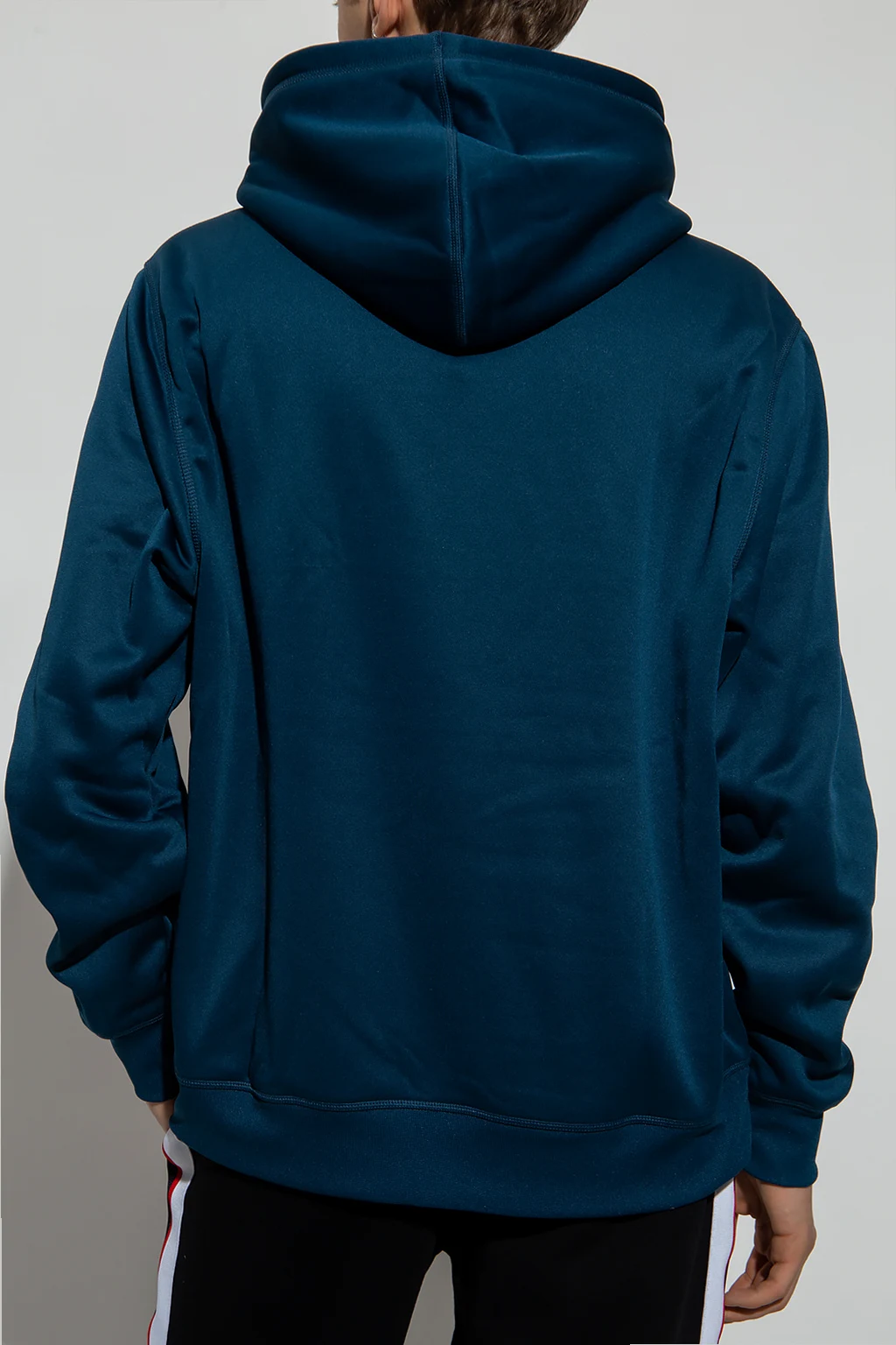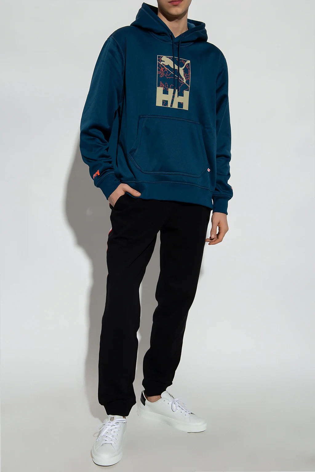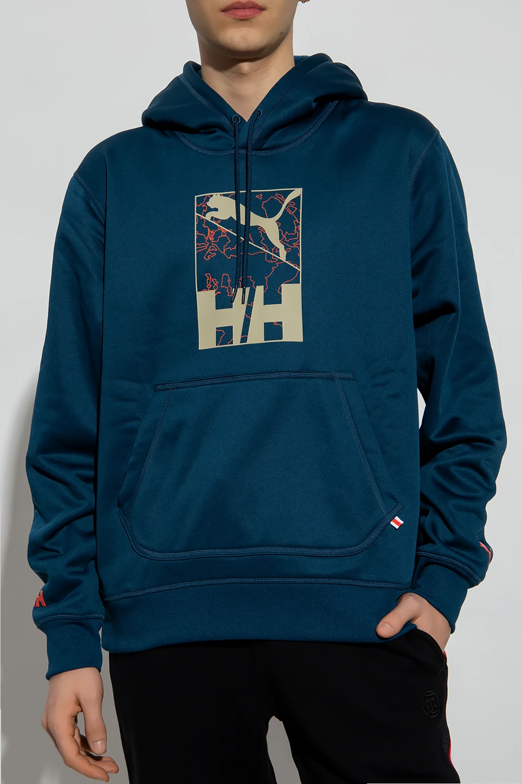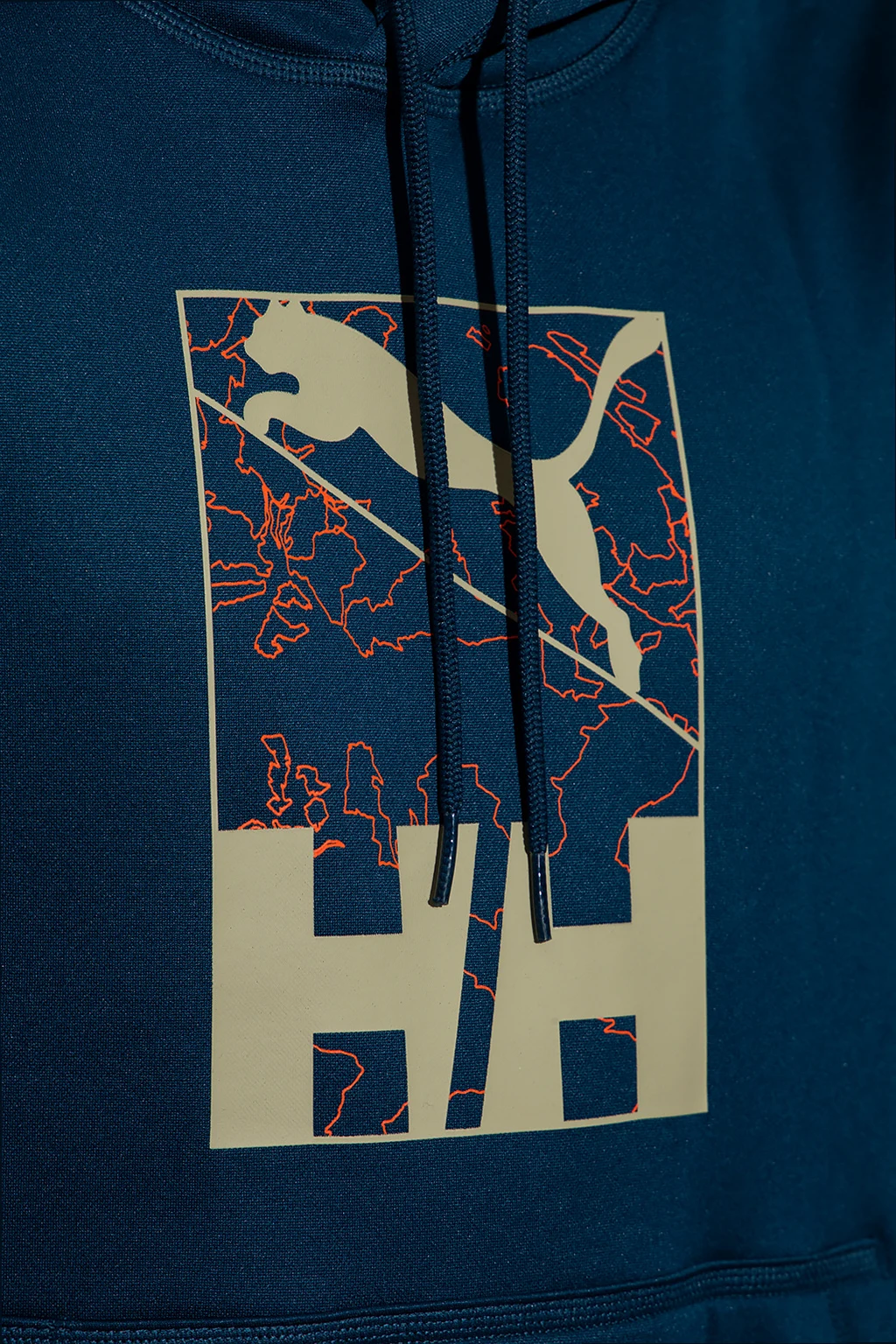Navy sweatshirt from Puma x Helly Hansen. Decorated with a beige and orange printed pattern. Hood with drawstrings. Slip pocket. Bottom and long sleeves finished with elasticated hem.