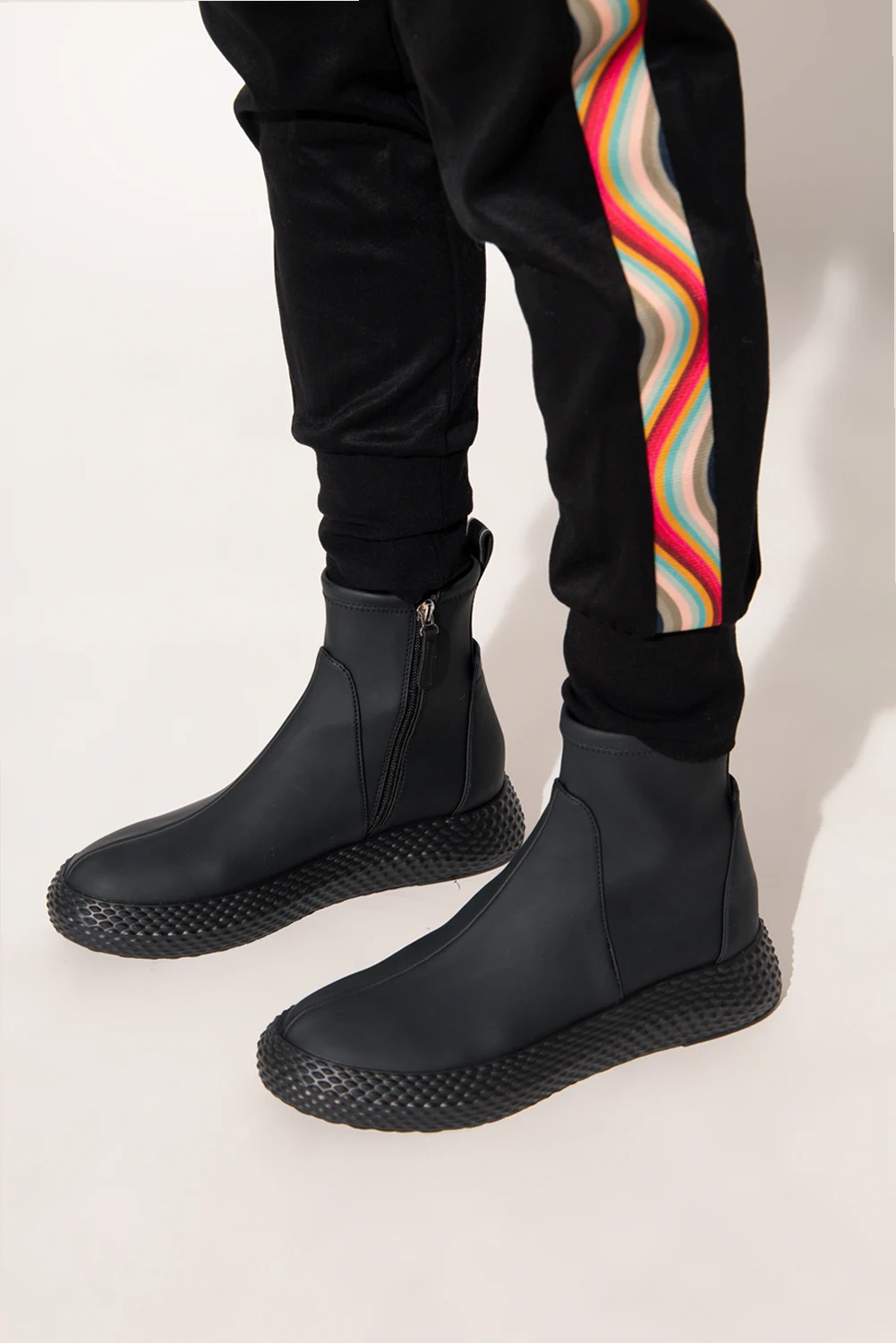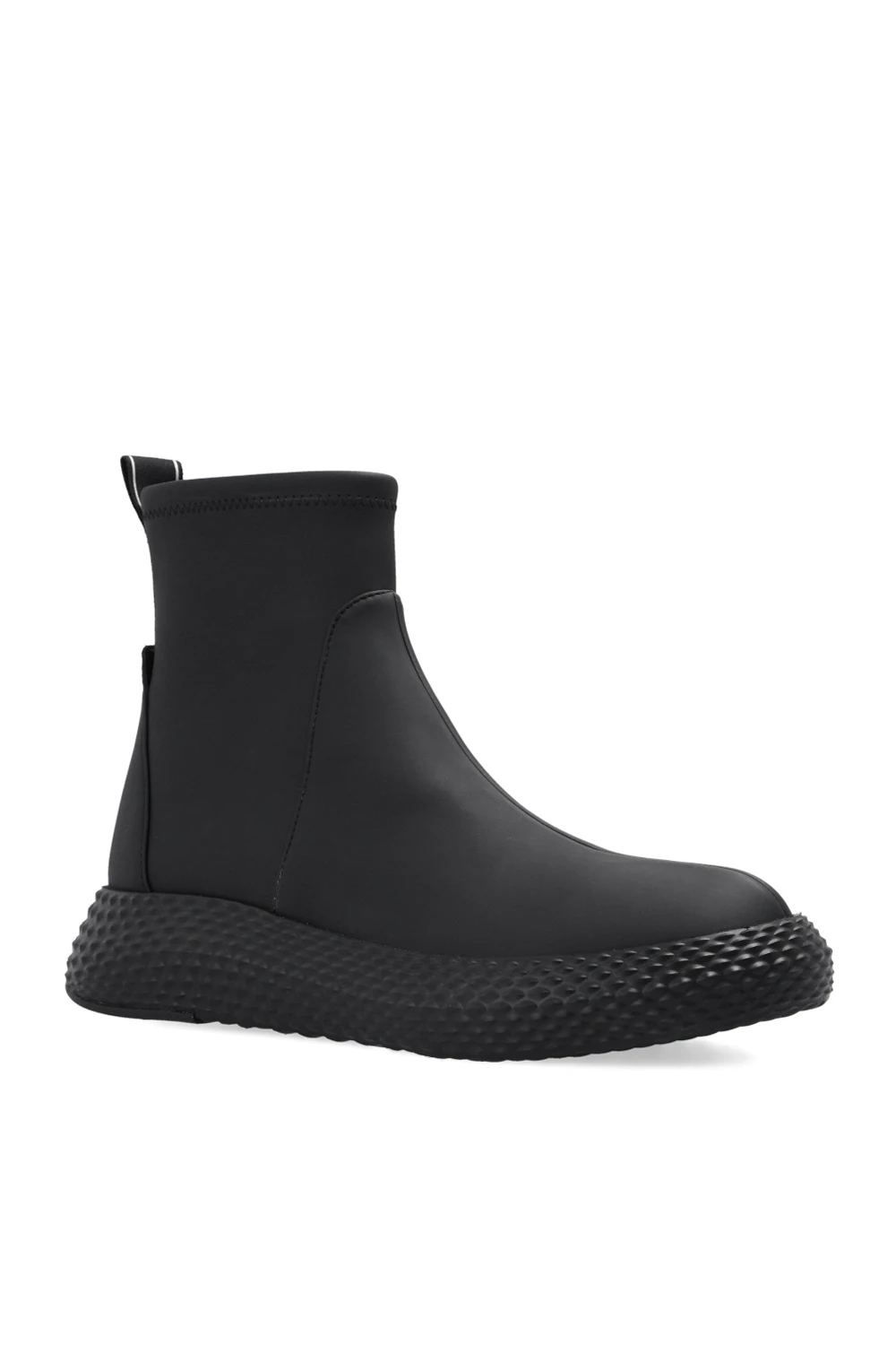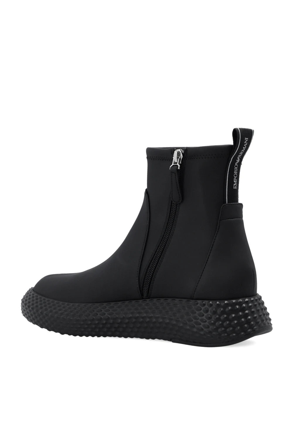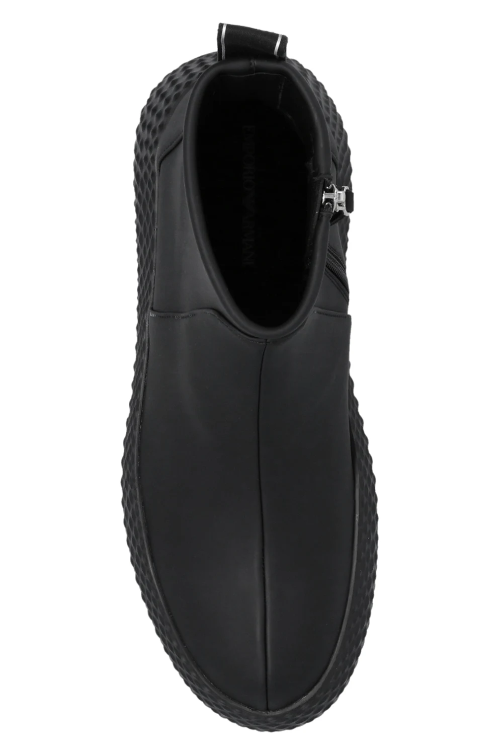 Black waterproof ankle boots from Emporio Armani. Fastened with a side zip, this garment features a silver-tone logo print at the back and black lightweight EVA sole.