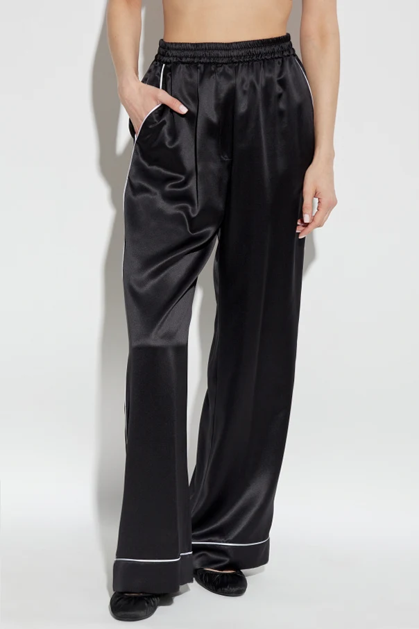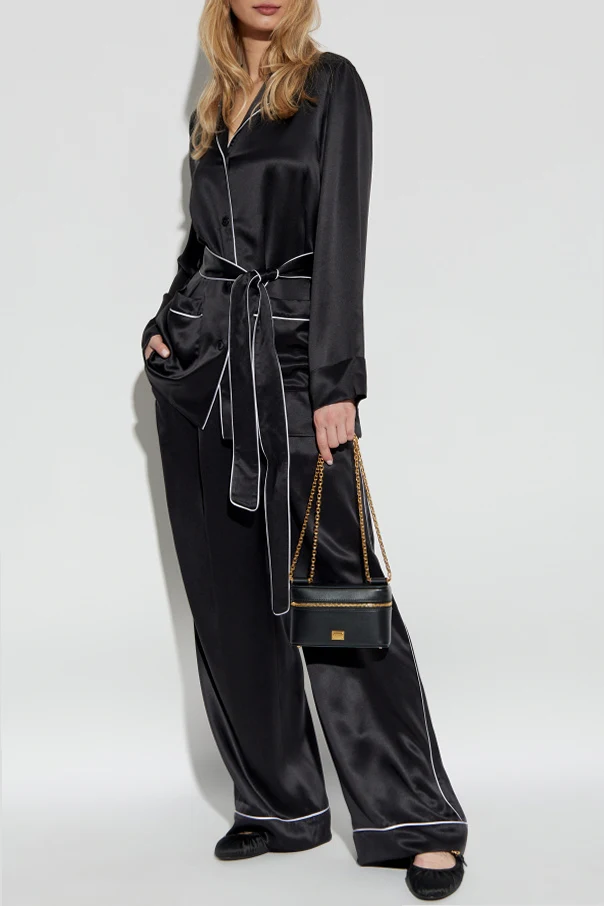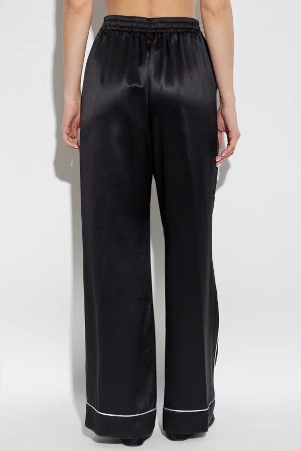 Wir präsentieren Seidenhose mit weitem Bein vom renommierten Modehaus Dolce & Gabbana . Diese schwarze Hose, aus hochwertigster Seide gefertigt, strahlt einen luxuriösen Glanz aus, der die Blicke auf sich zieht und ihren raffinierten Charakter unterstreicht.