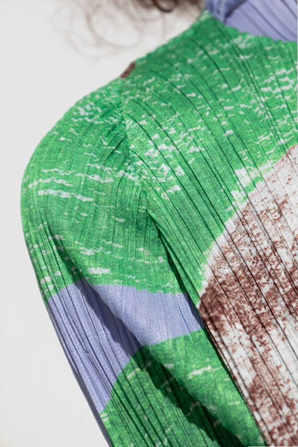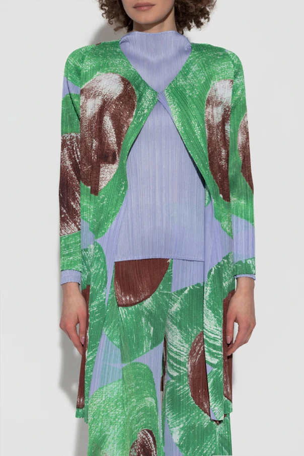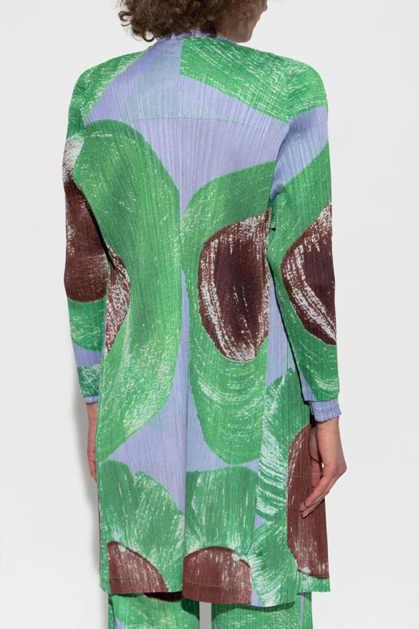 Wir präsentieren den plissierten Mantel aus der exklusiven Kollektion Pleats Please Issey Miyake , der die Quintessenz von Eleganz und raffiniertem Stil darstellt. Dieses außergewöhnliche Kleidungsstück, entworfen von dem renommierten japanischen Designer, überrascht mit einem originellen Muster und einem Reichtum an Farben. Die vorherrschenden Schattierungen von Grün, Violett und Braun schaffen eine künstlerische, abstrakte Komposition, die ins Auge fällt.