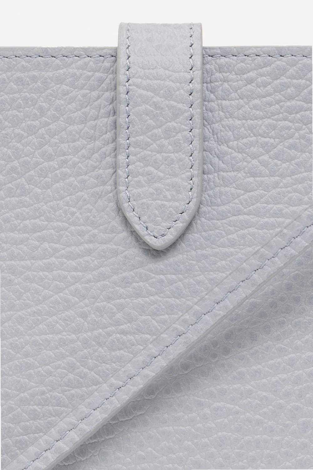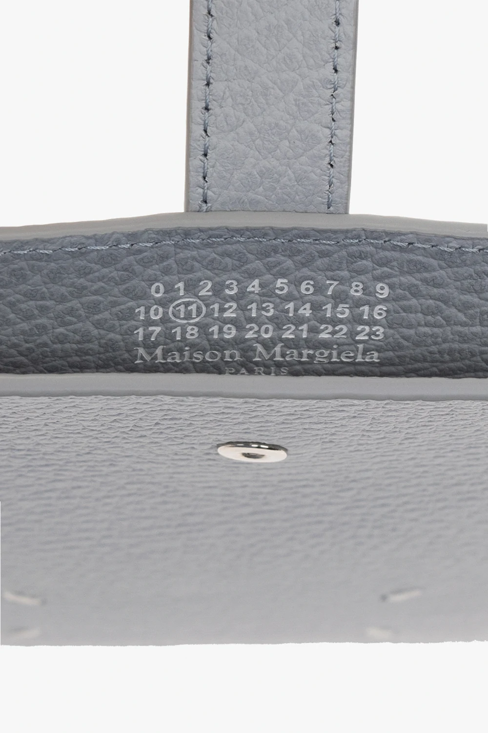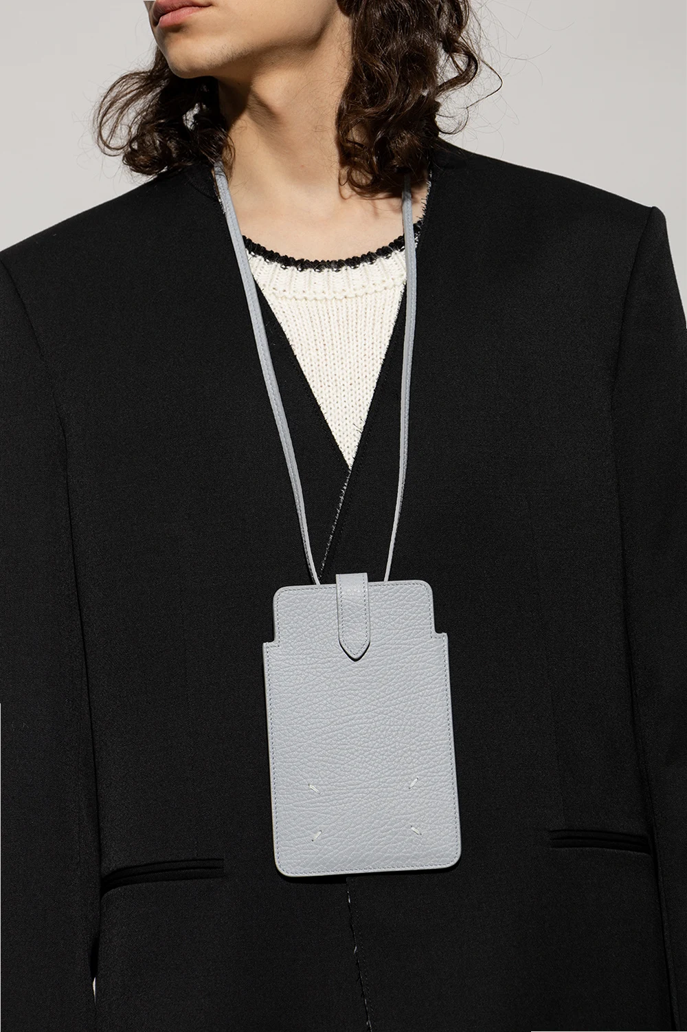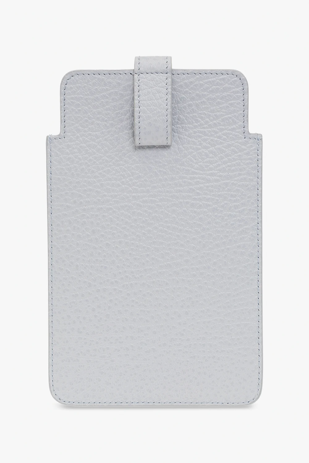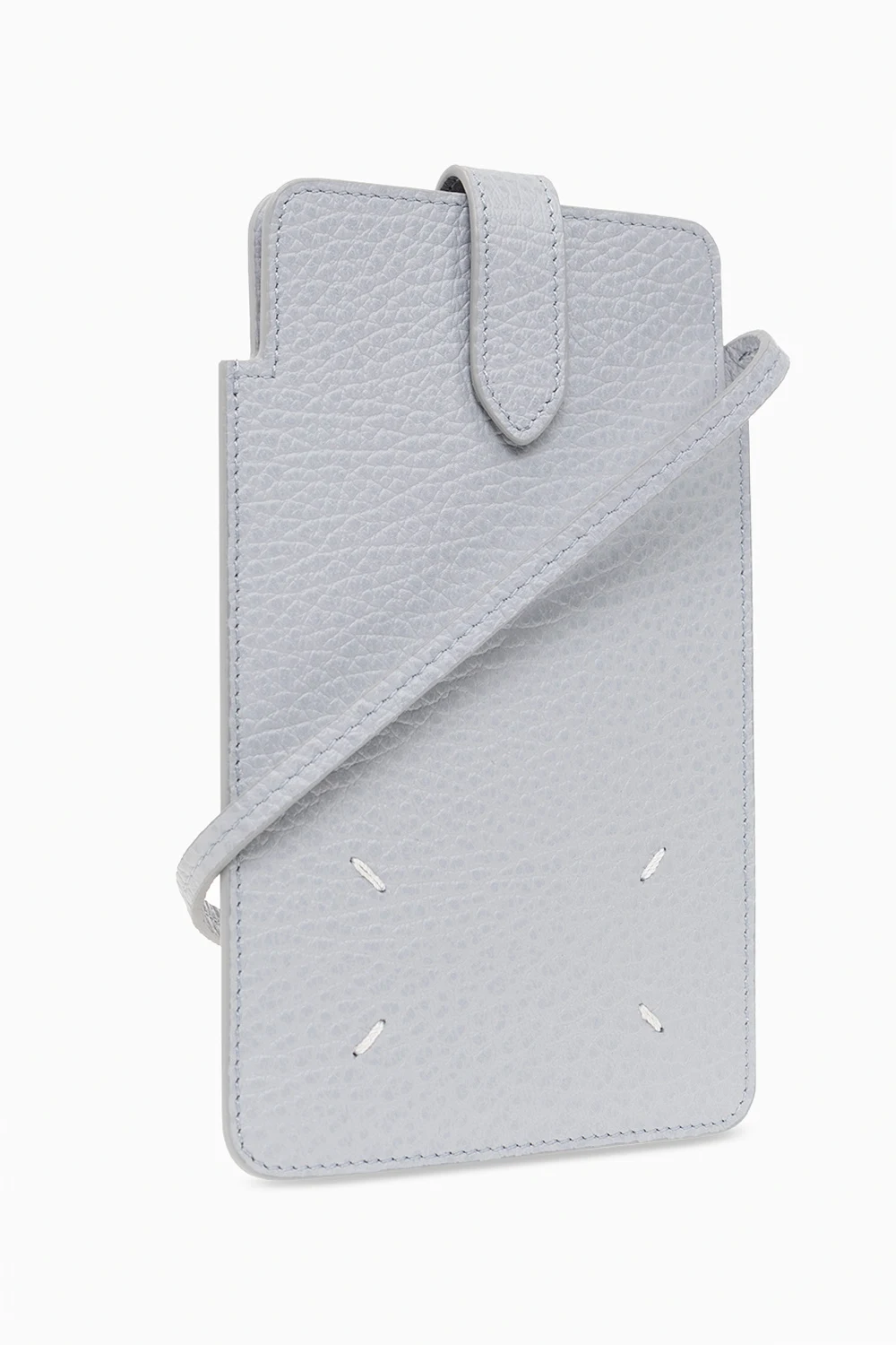 Greyish blue phone pouch from Maison Margiela. Crafted from calf leather, this item features a snap closure, white logo embroidery, one internal compartment, detachable and adjustable strap and silver-tone metal hardware.