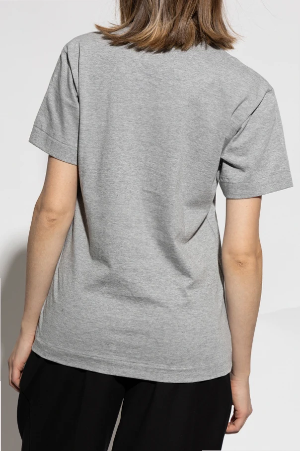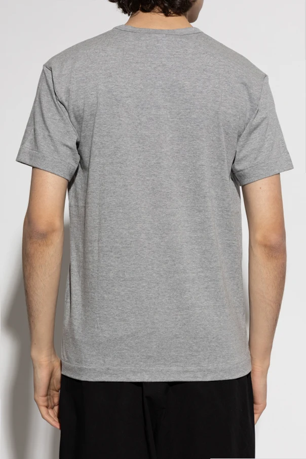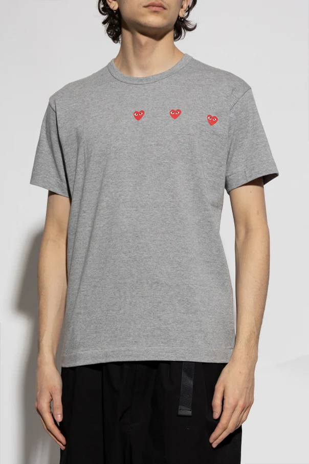 Wir präsentieren das T-Shirt mit Druck aus der renommierten Linie Comme des Garçons Play , die sich durch ihre jugendliche Energie und ihren leicht verspielten Stil auszeichnet. Dieses graue T-Shirt mit kurzen Ärmeln kombiniert einen klassischen Schnitt und einen Rundhalsausschnitt mit einem einzigartigen Akzent in Form von drei kleinen, roten Herzen mit Augen, die dezent auf der Brust platziert sind.