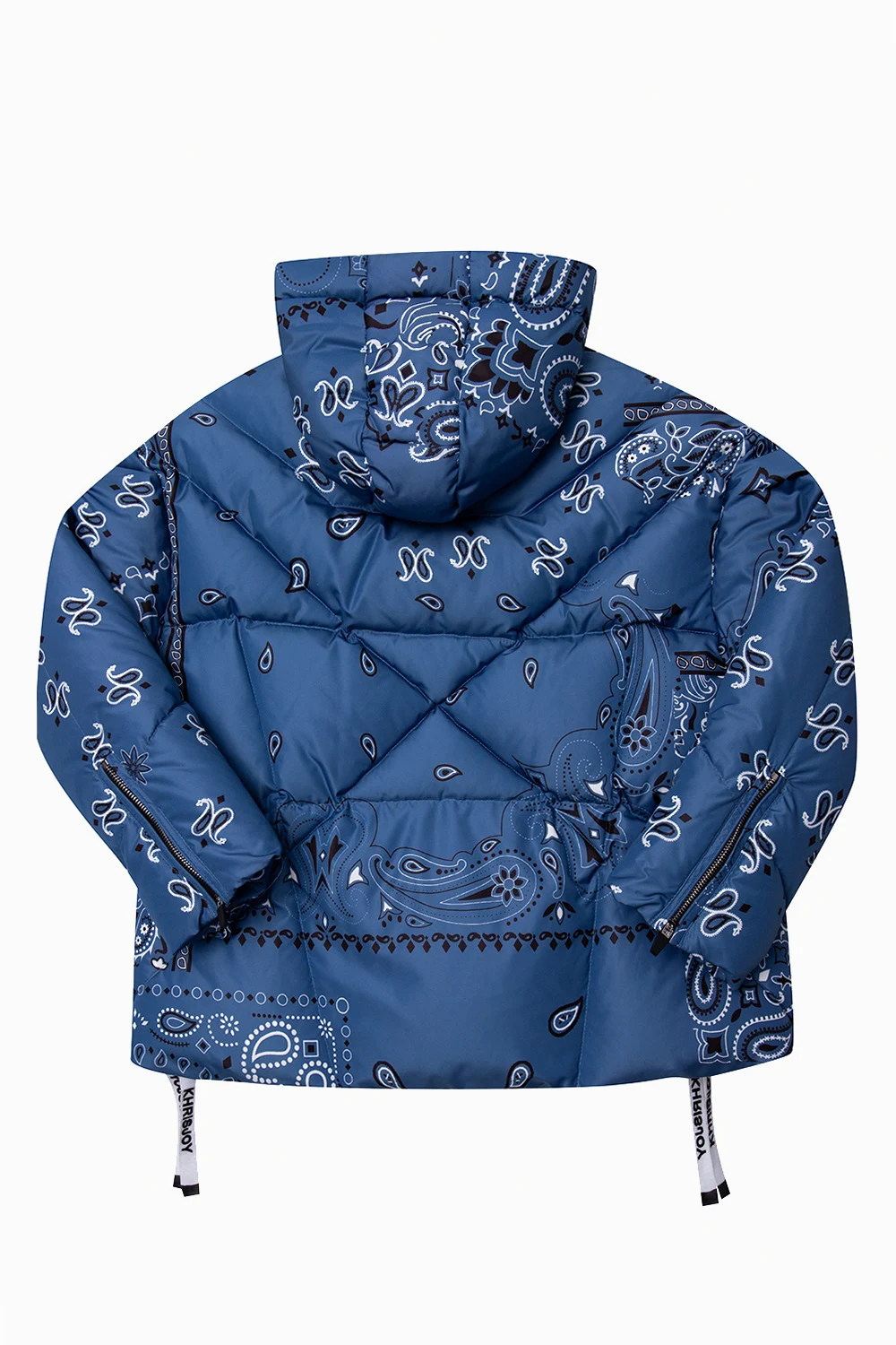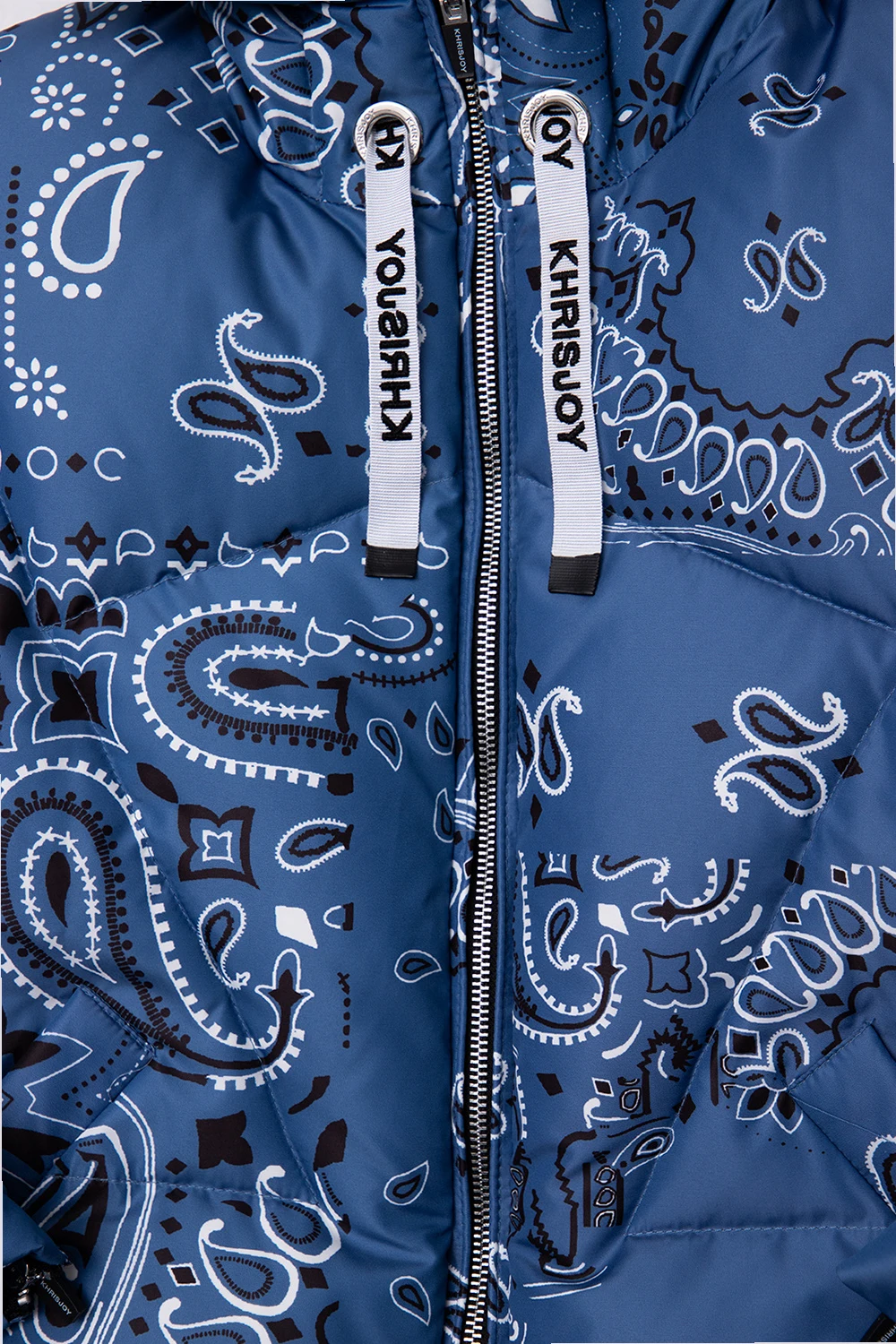 Blue jacket from Khrisjoy Kids. Fastened with a zip, this model is decorated with a paisley pattern and complete with two slip pockets, long sleeves with zips and logo-embroidered drawstrings in blue and black at the hood and hem.