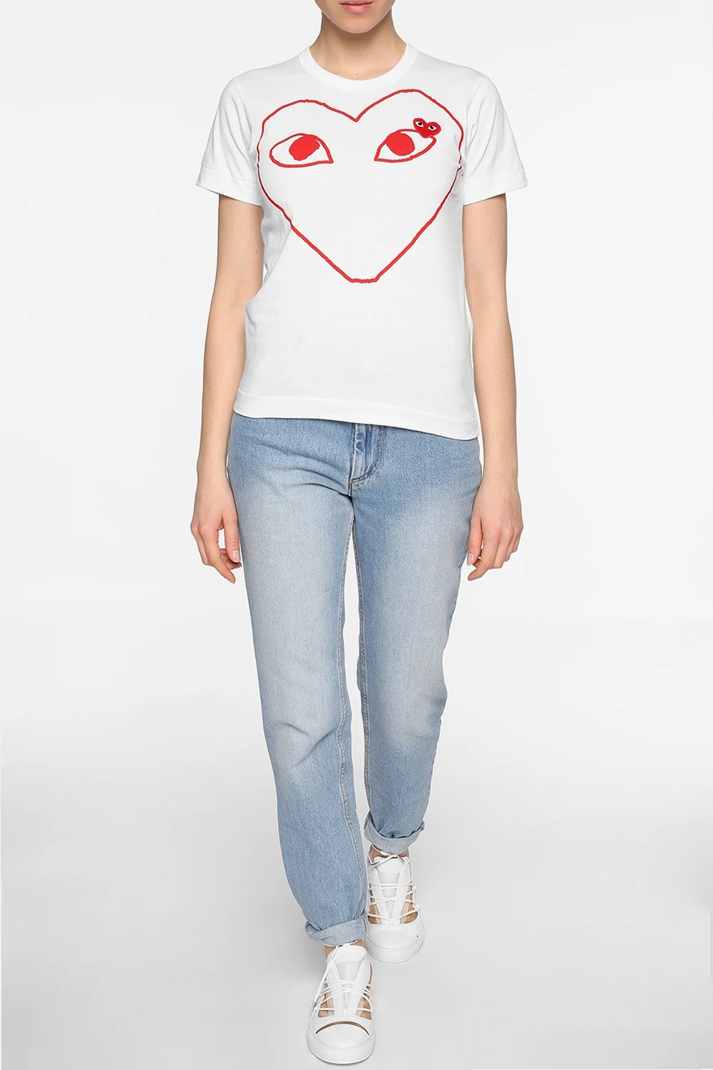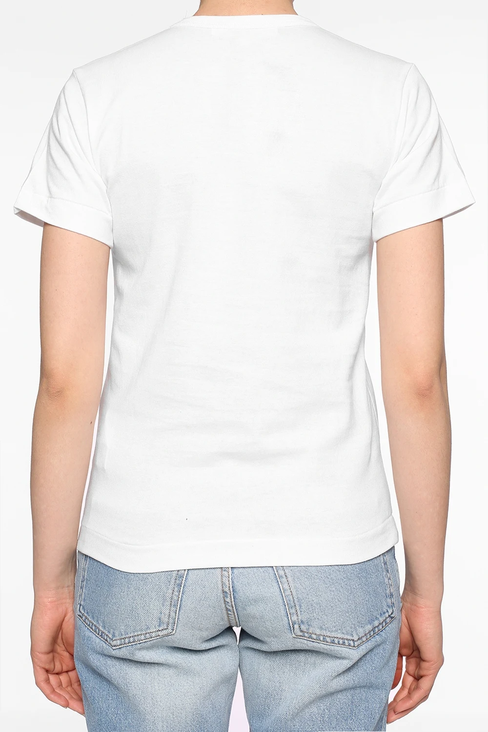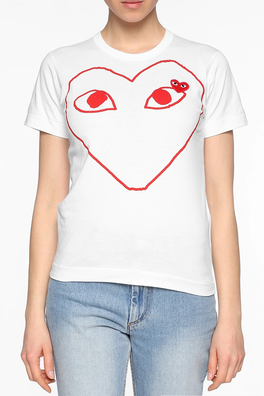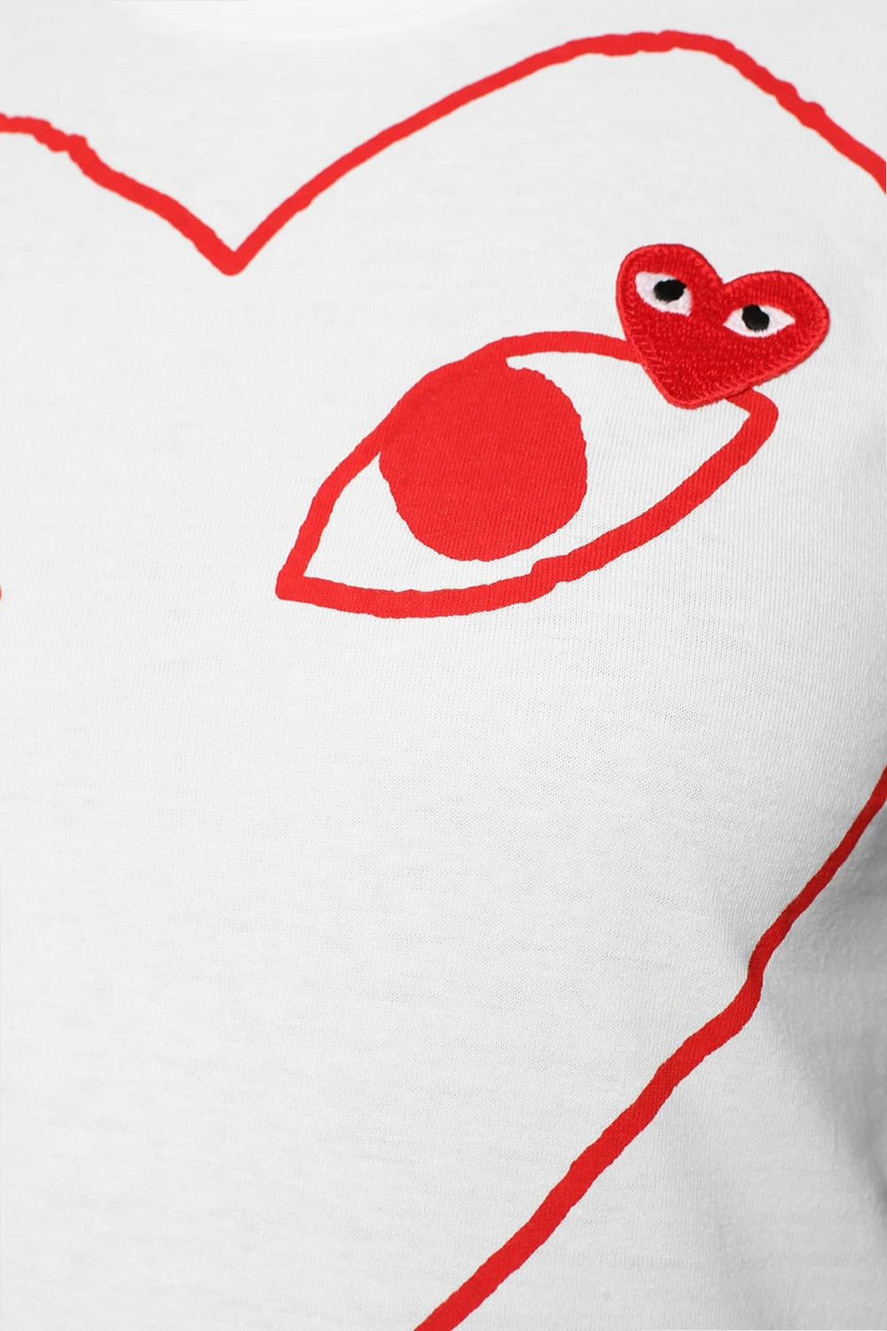 White cotton T-shirt from Comme des Garçons Play. Print and red, white and black heart-shaped logo patch on the front. Elasticated round neck.