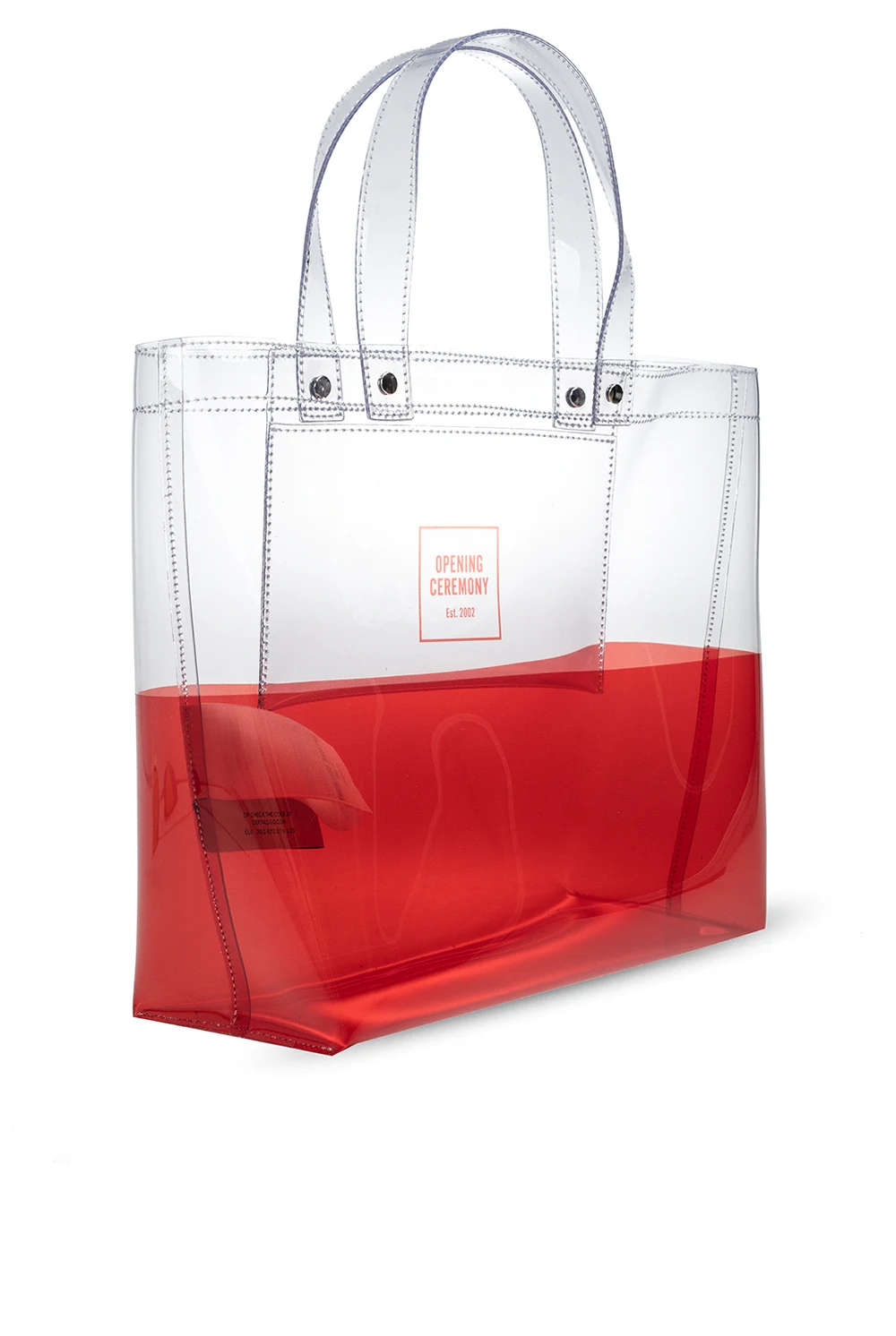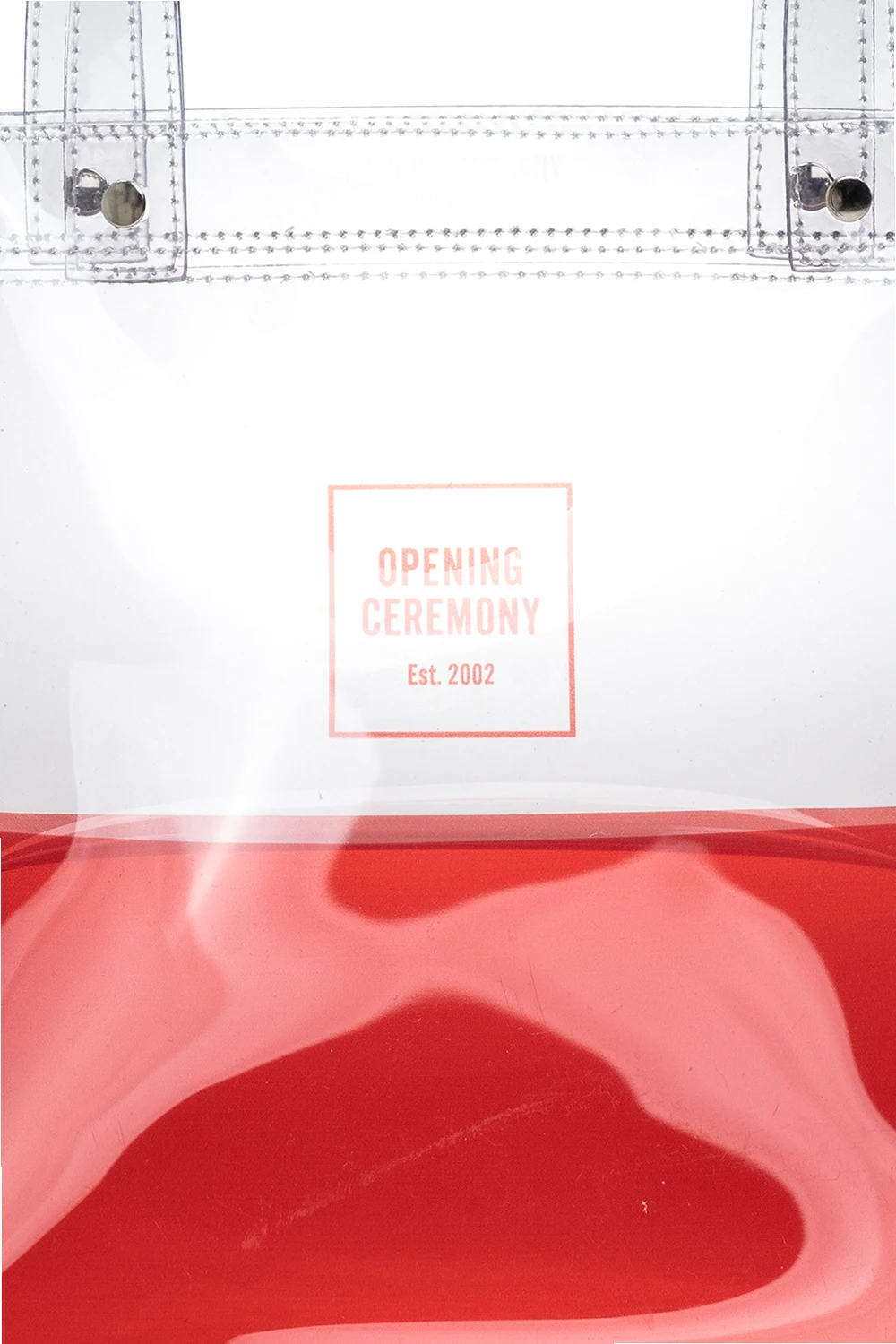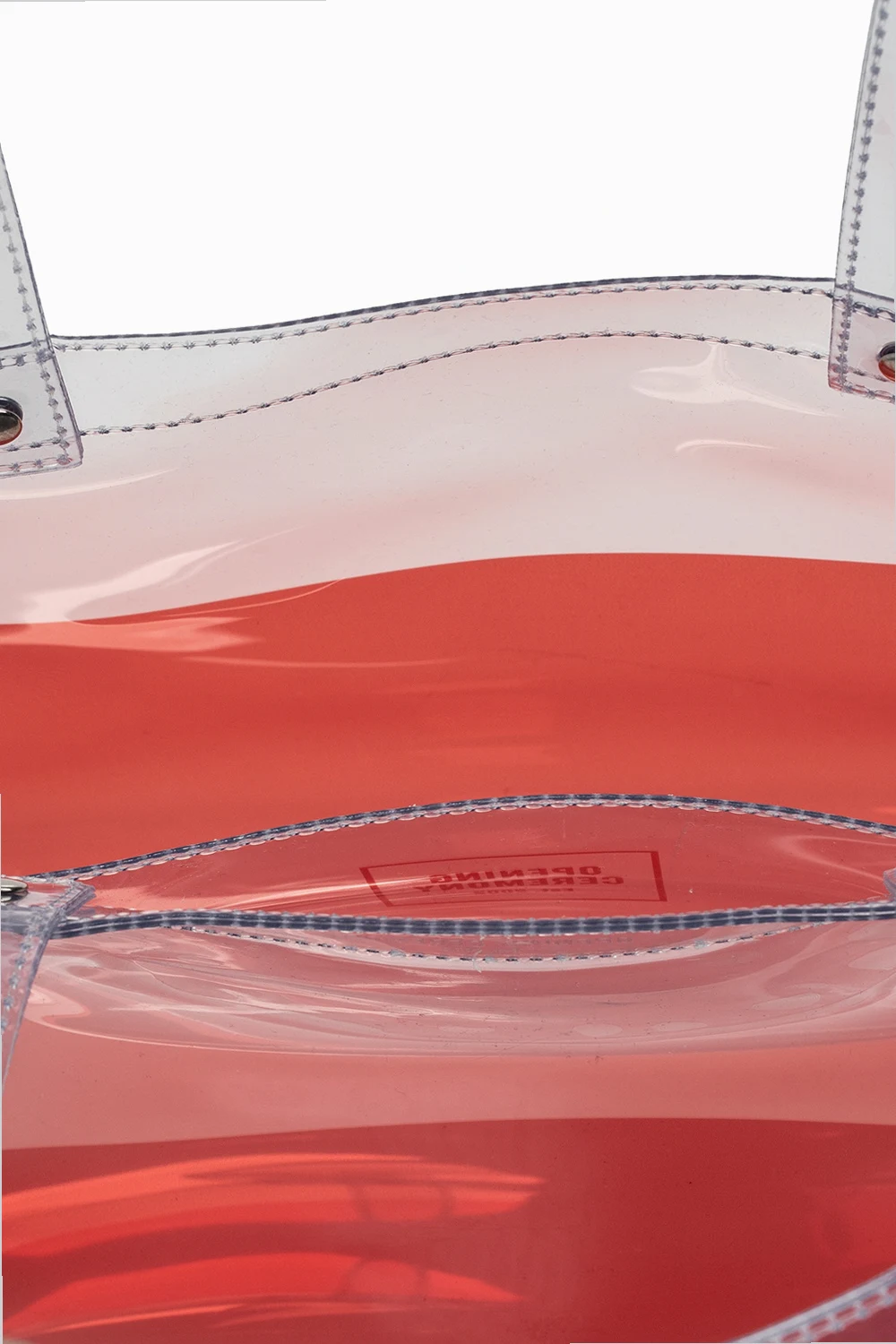 Red, transparent shopper bag from Opening Ceremony. This model is complete with two half-round handles, embossed logo pattern and one internal compartment and one pocket.