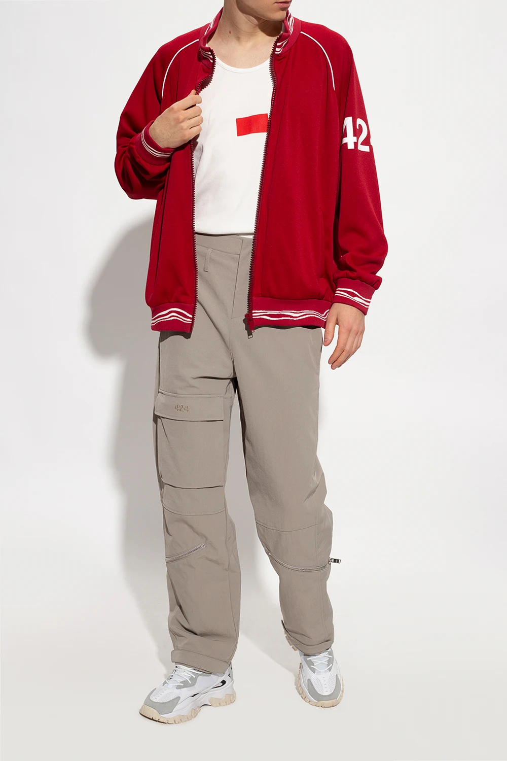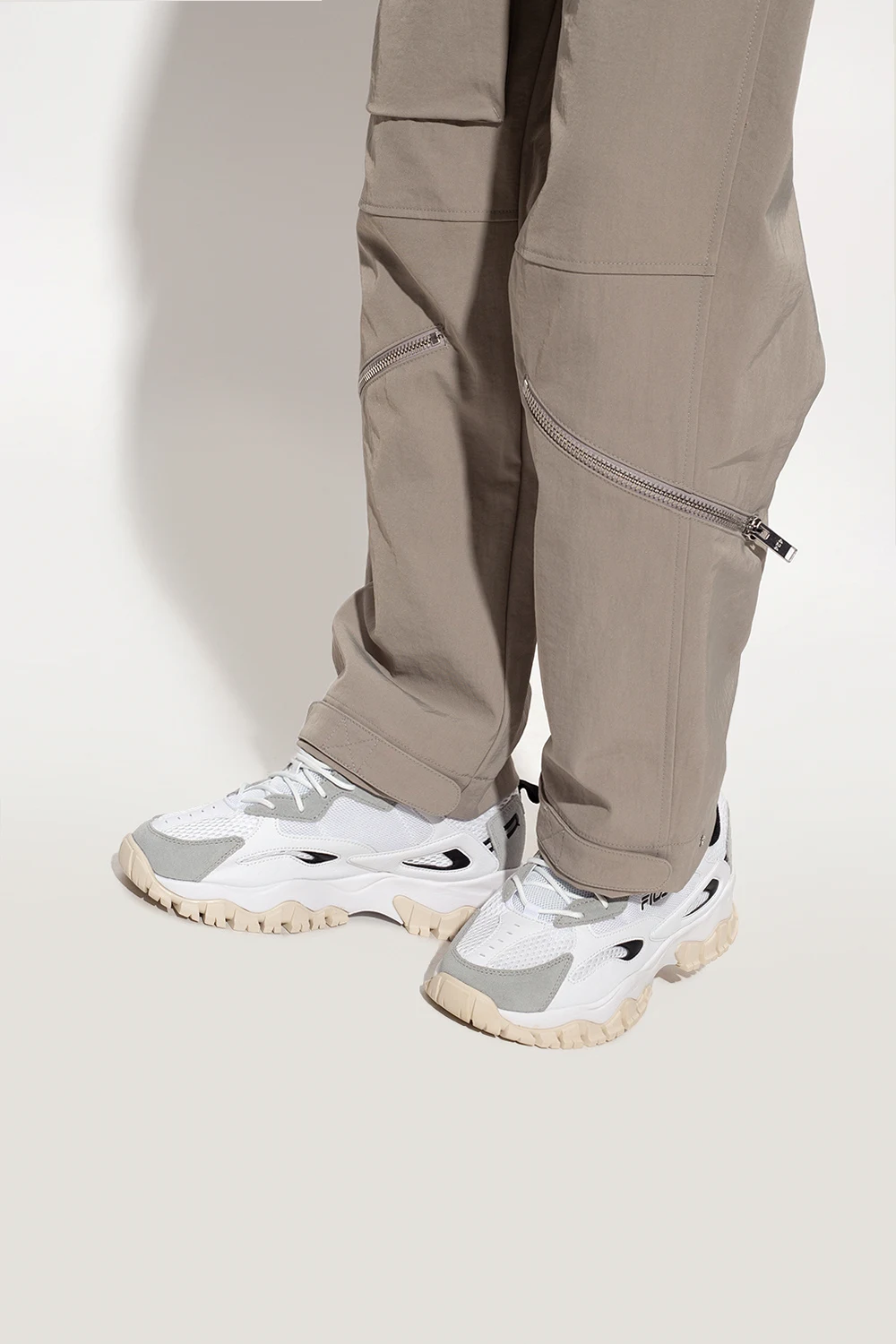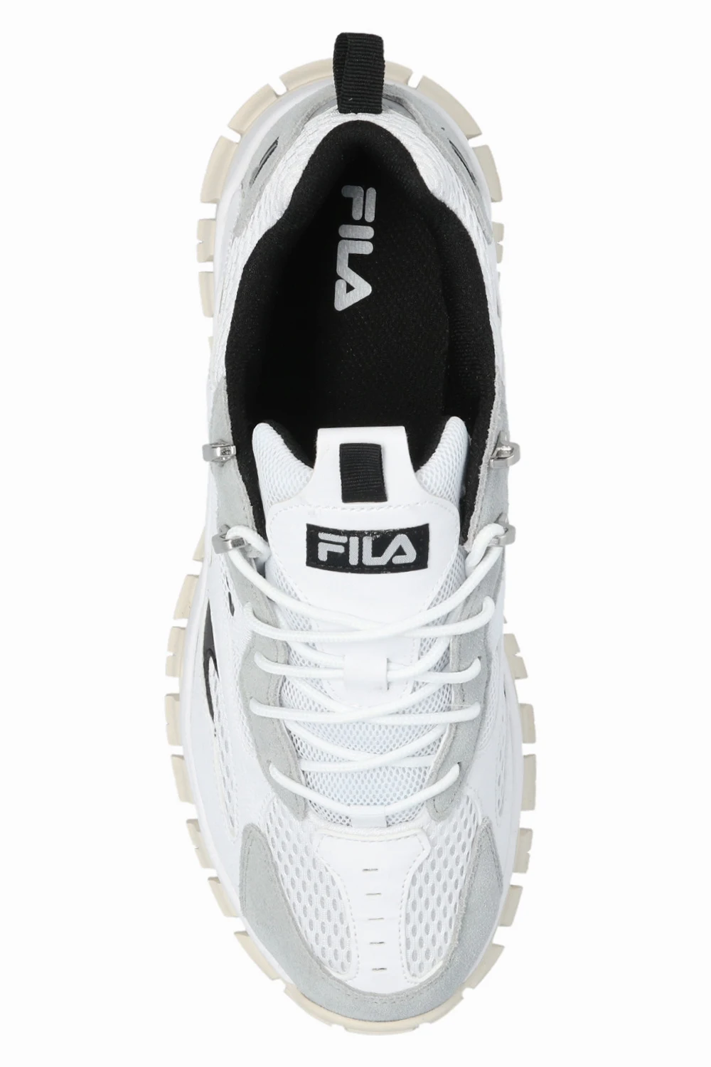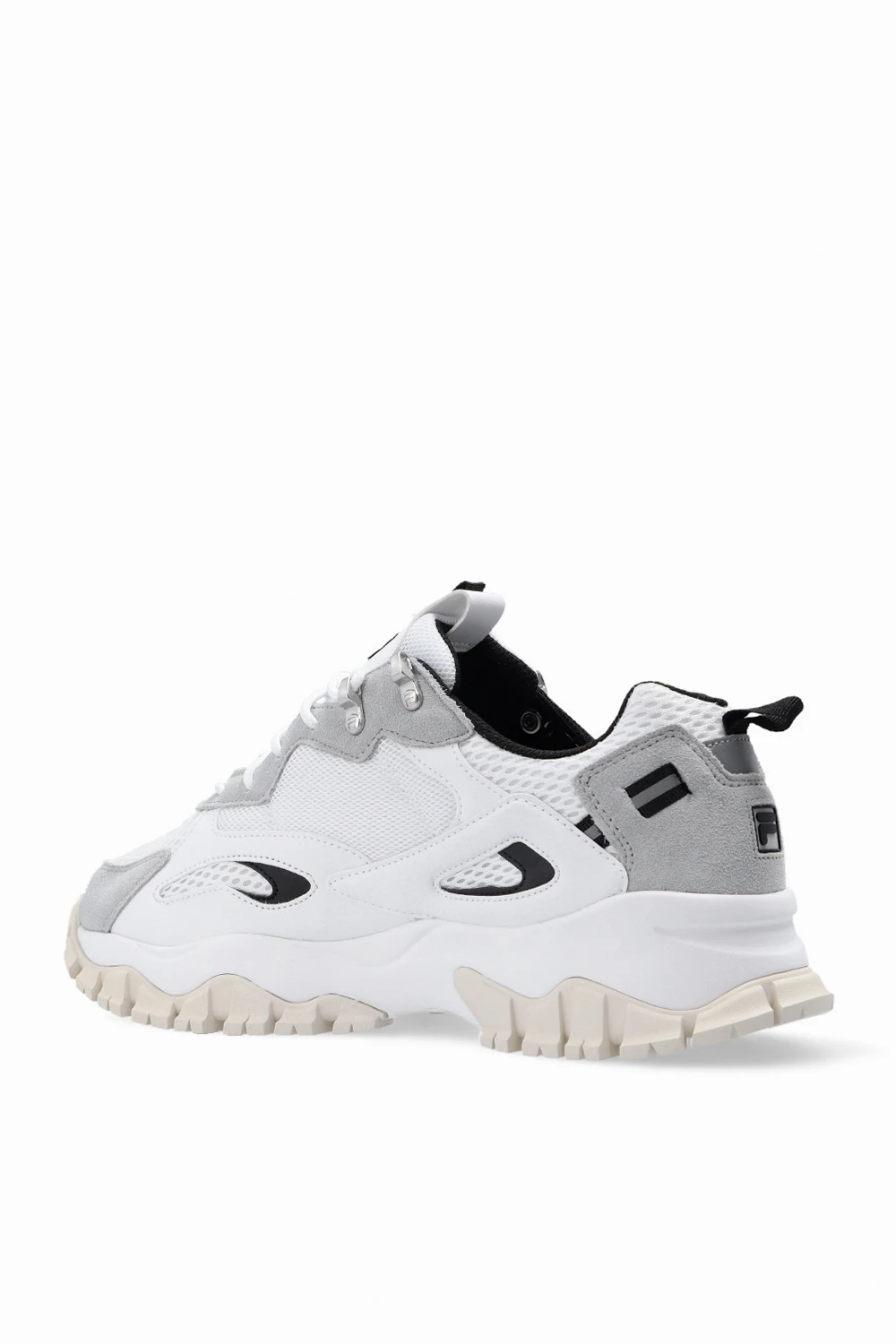 White, grey and black ‘Ray Tracer’ sneakers from Fila. Crafted from material and leather, this lace-up model features logo detailing, a reflective insert and a cream and white rubber sole.