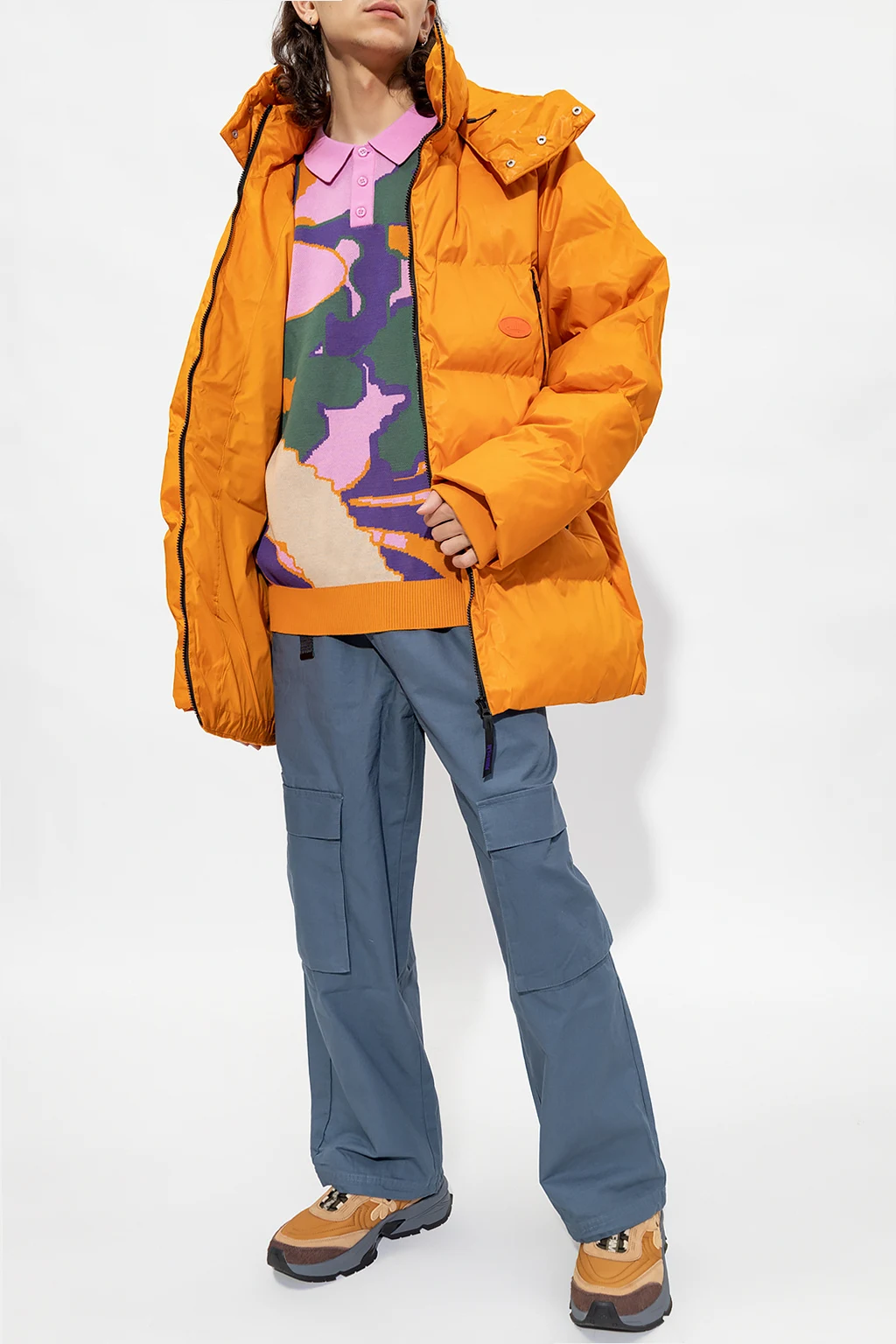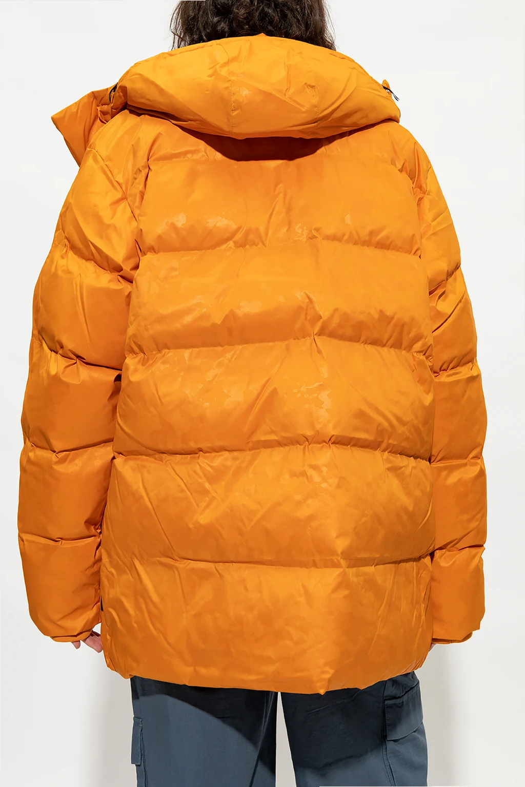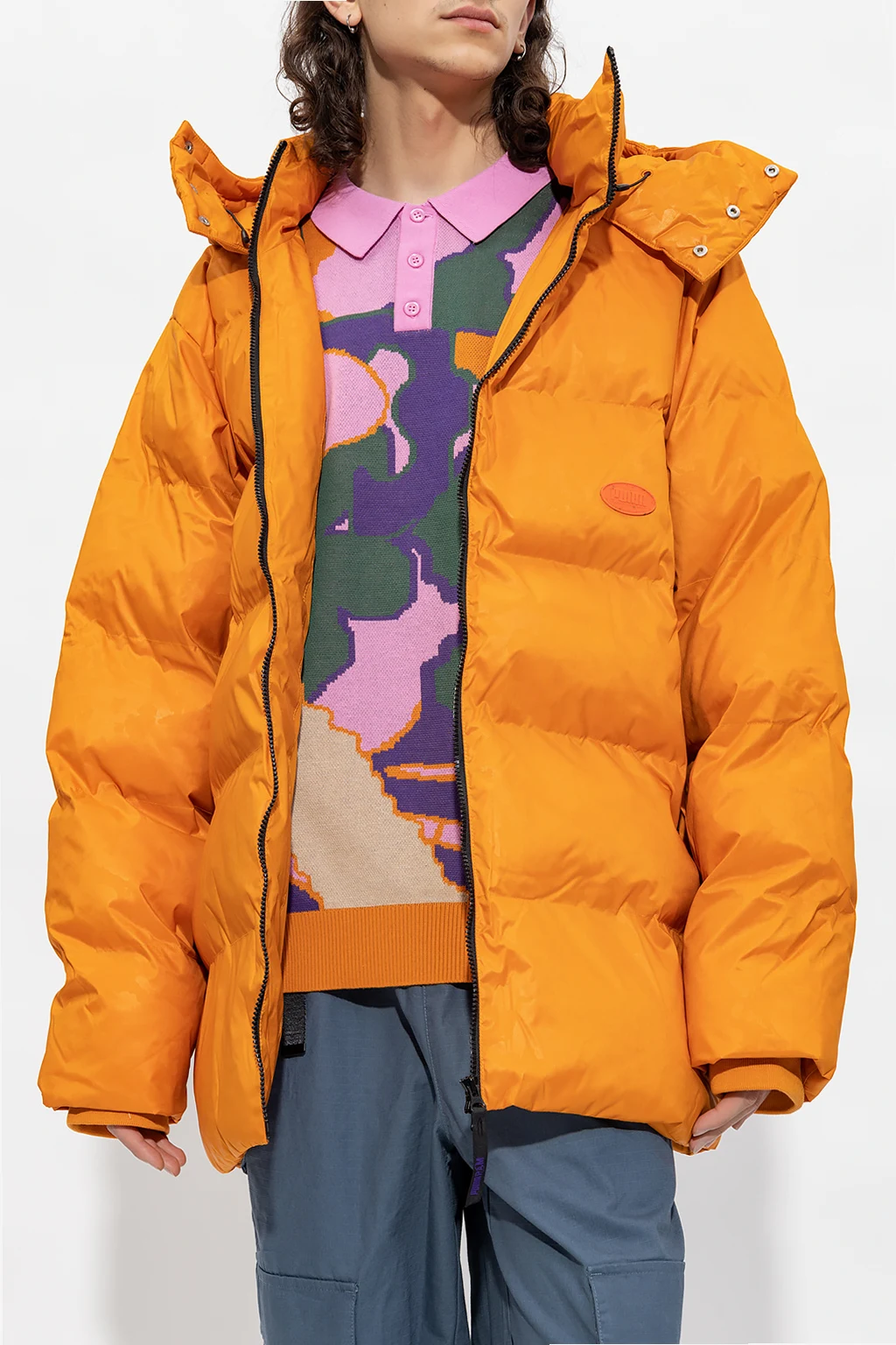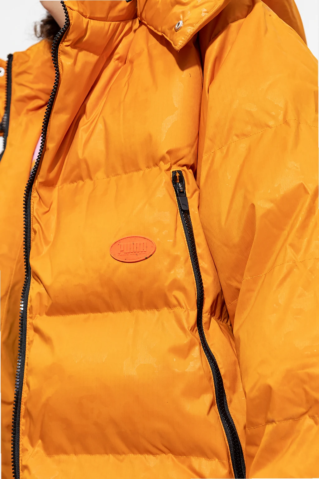 Orange quilted jacket with stand collar from Puma x PAM. This garment has Primaloft® insulation, two-way zip, detachable drawstring hood, rubber logo patch, two zip pockets, drawstring hem and long sleeves with ribbed cuffs.