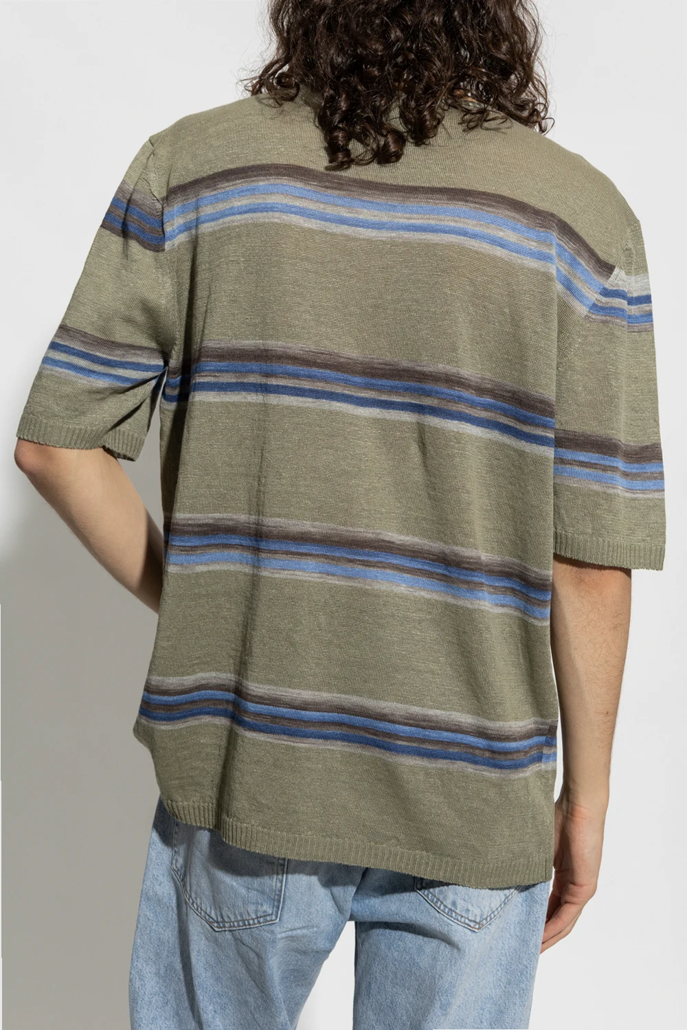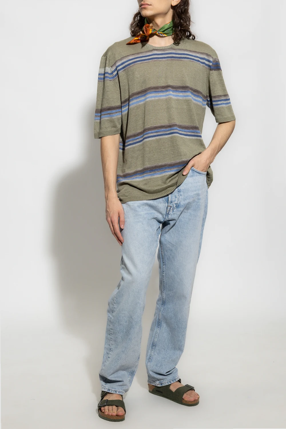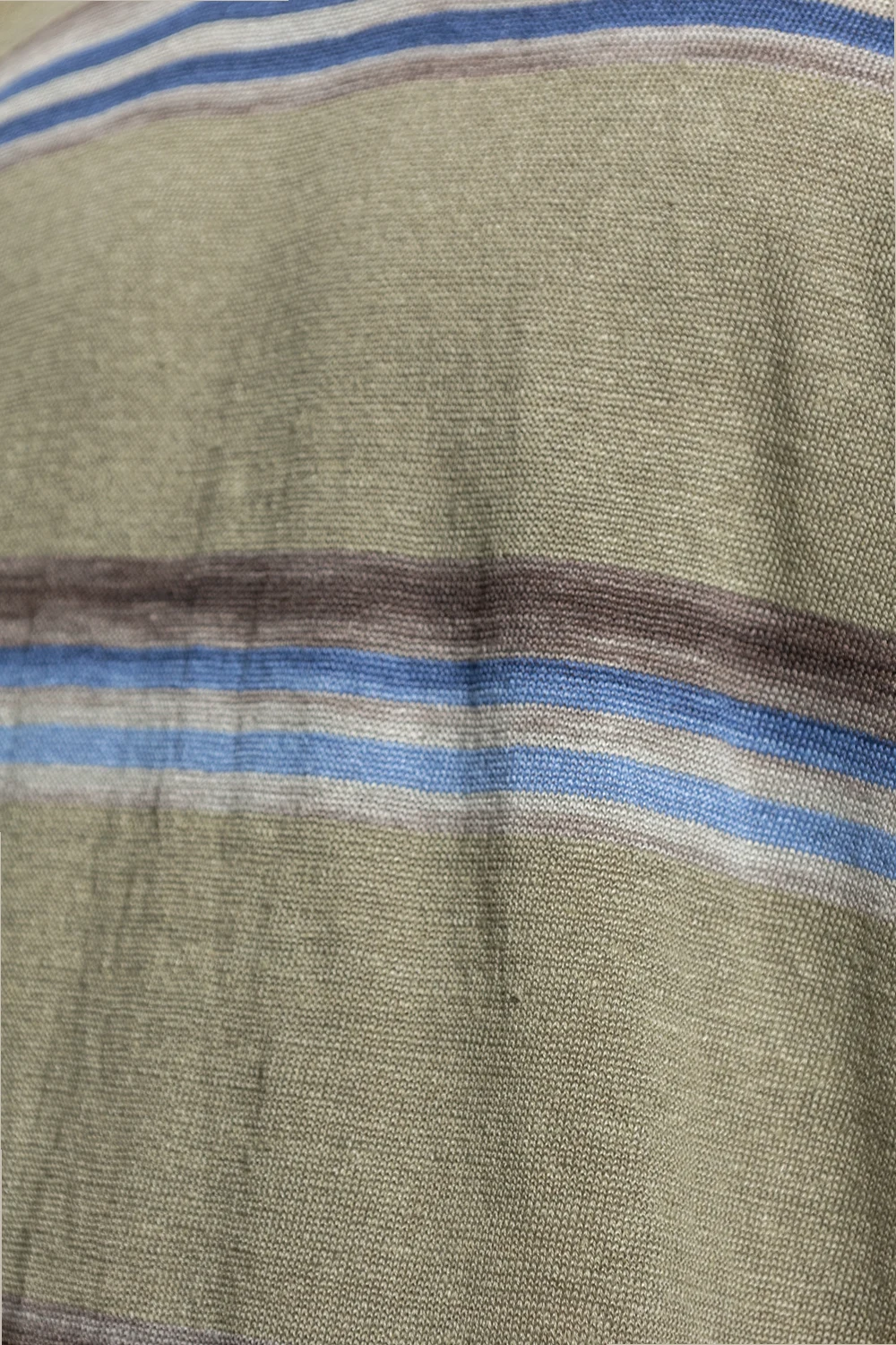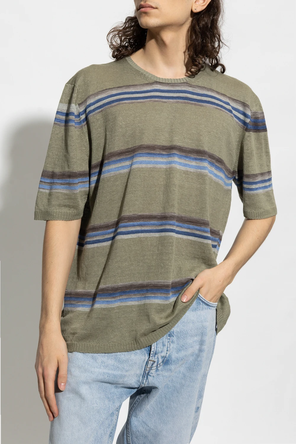 Khaki crewneck T-shirt from Nick Fouquet. Made of linen, this short sleeve design is decorated with a multicolored stripe pattern.