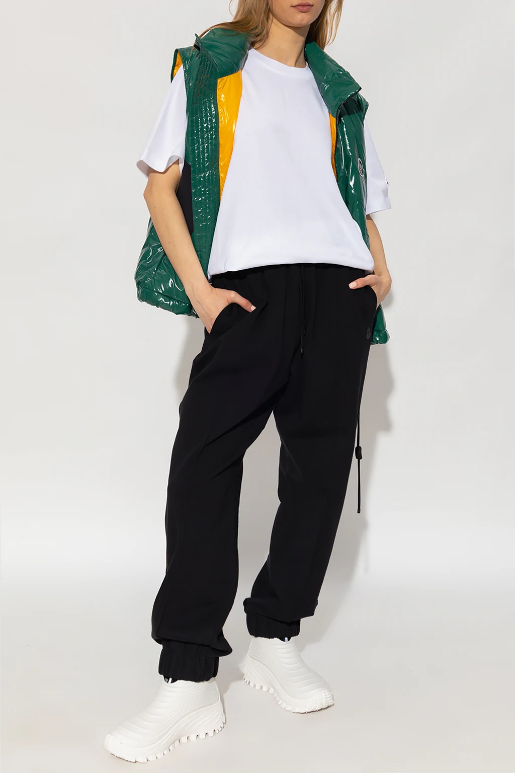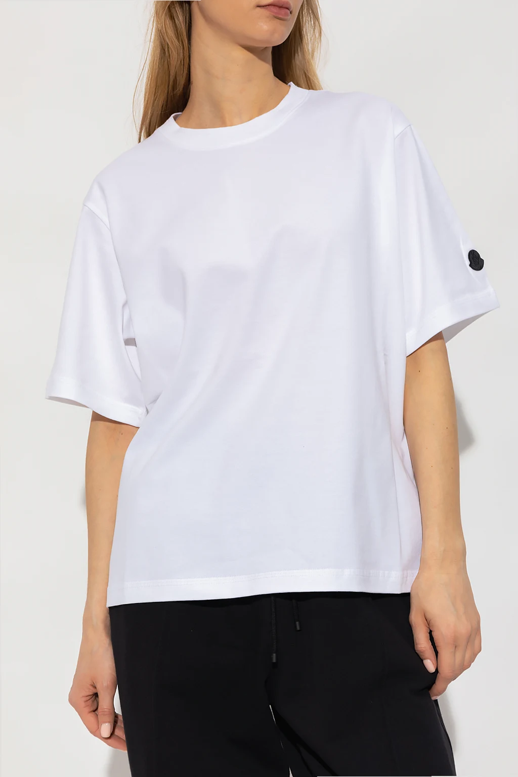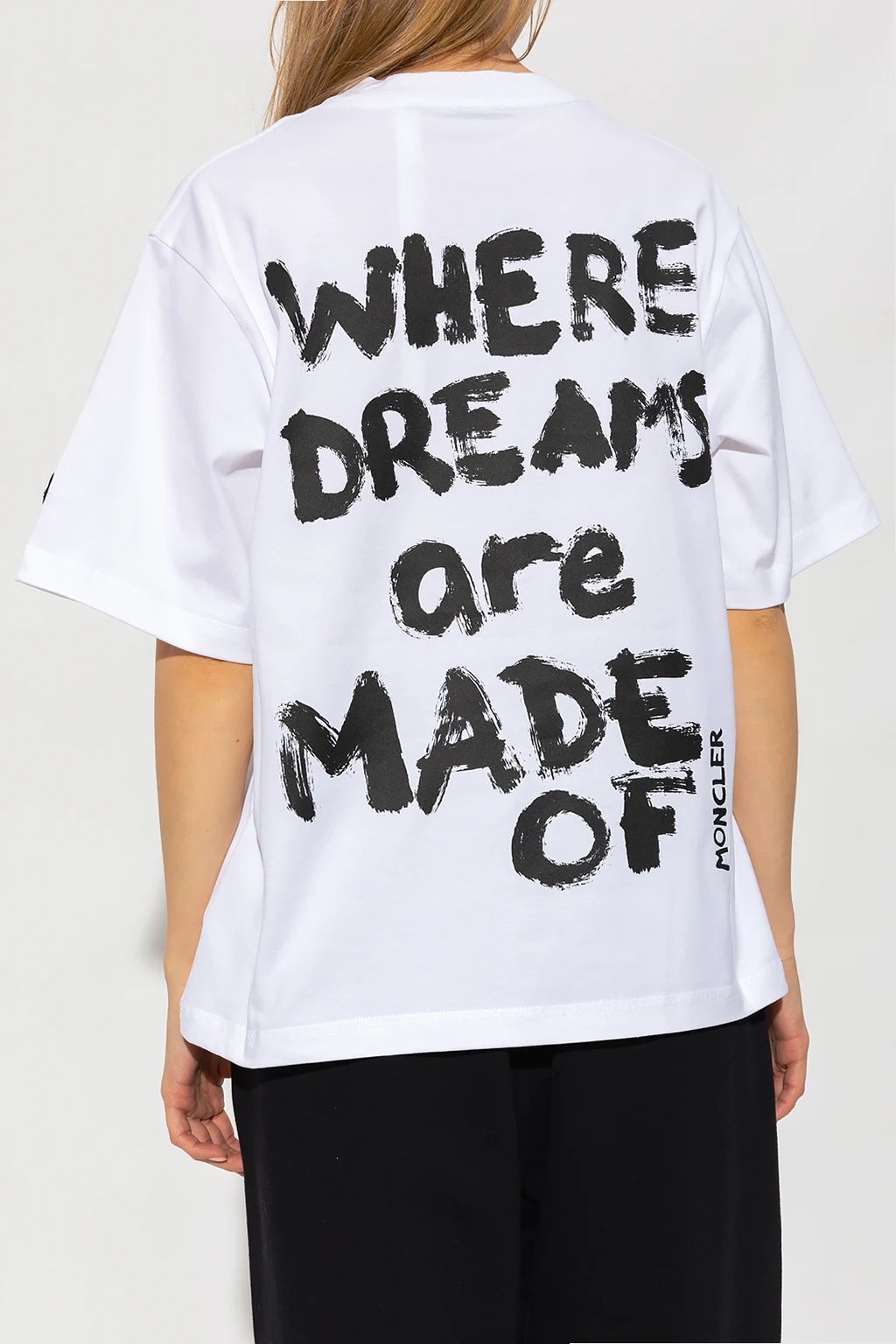White crewneck T-shirt from Moncler Genius, the ‘2 Moncler Alicia Keys’ collection. Made of cotton, this style features a black logo print at the back, ribbing on the collar and short sleeves – one has a logo patch.