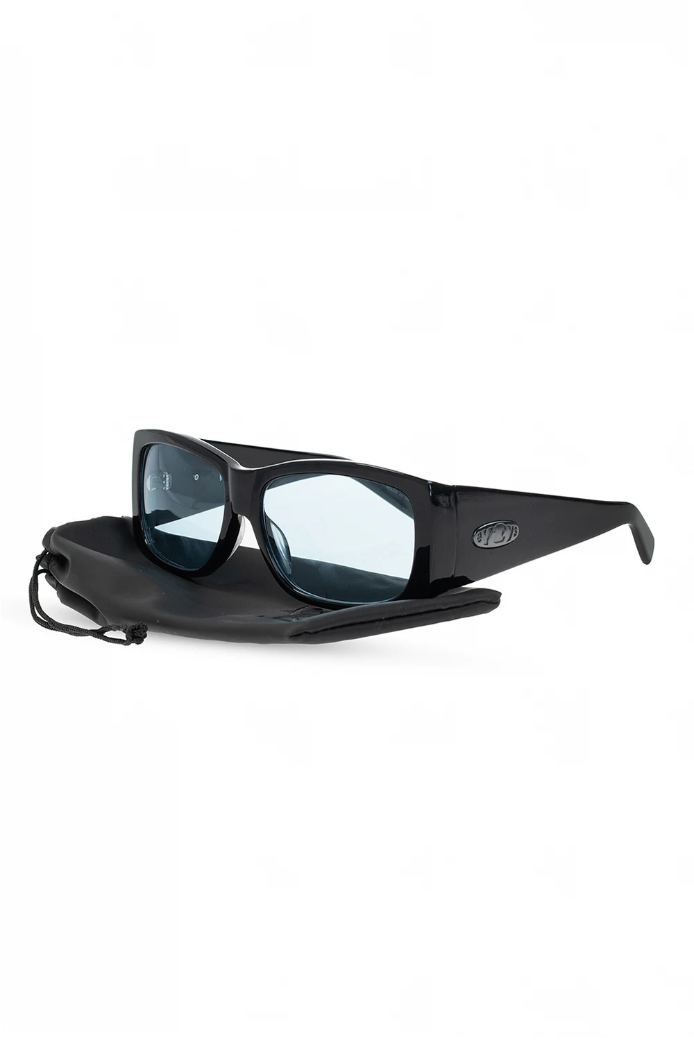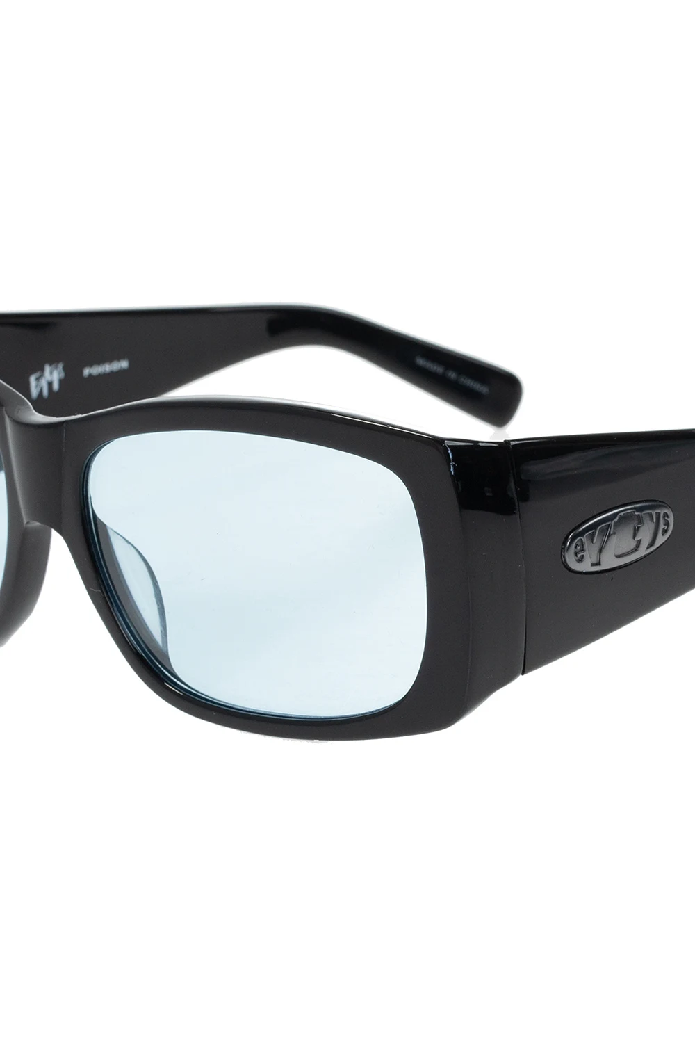Black ‘Poison’ sunglasses from Eytys. This model features hand-made frames, blue lenses and a logo-embossed appliqué in black and silver-tone.