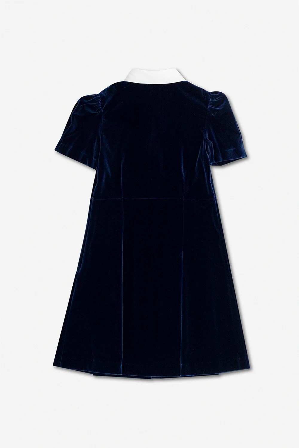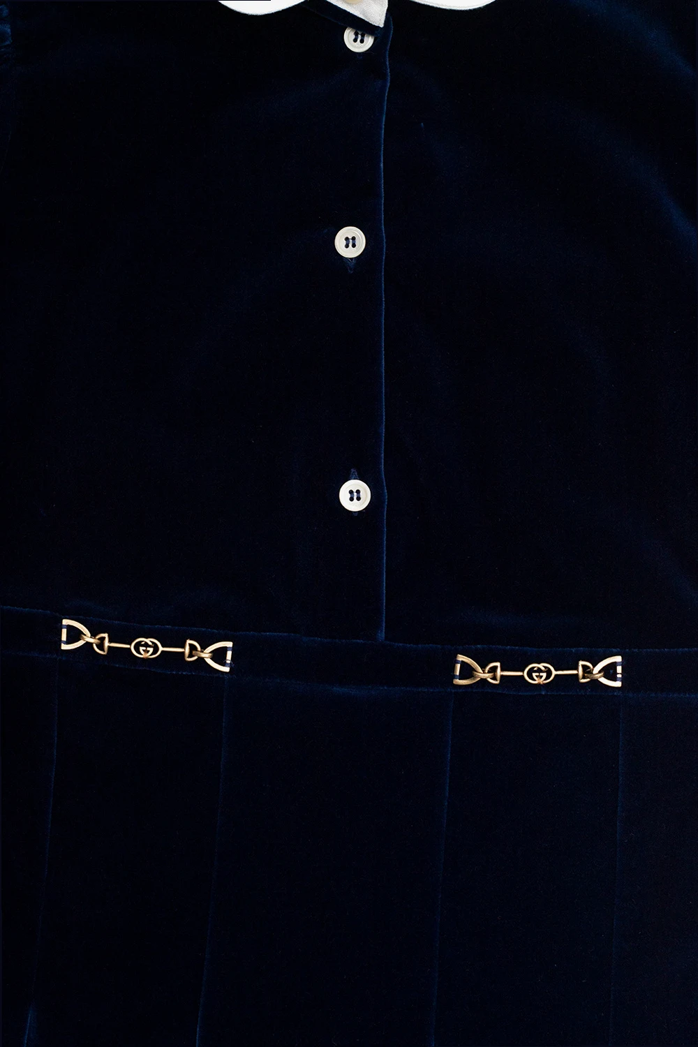 Navy blue dress from Gucci Kids. Made from cotton, this style showcases horsebit hardware, button fastenings and short sleeves.