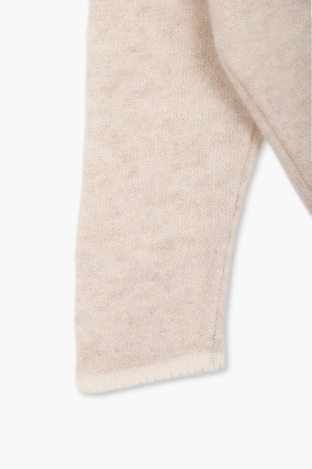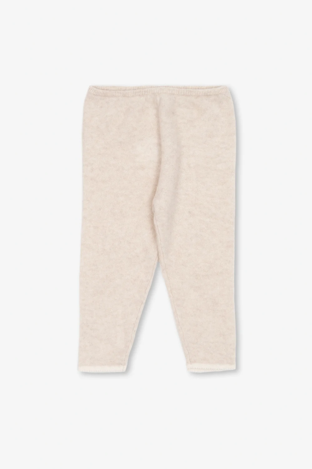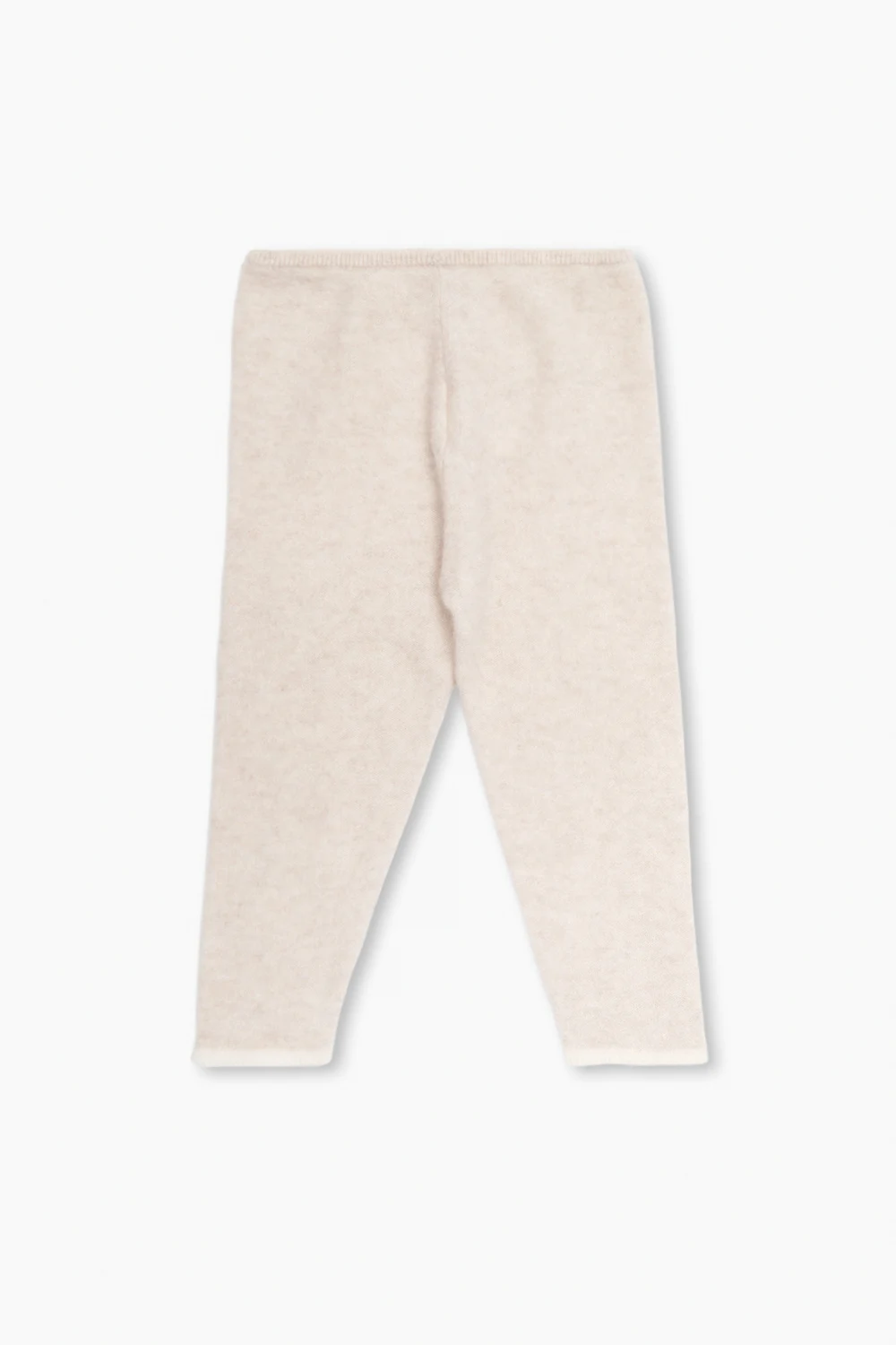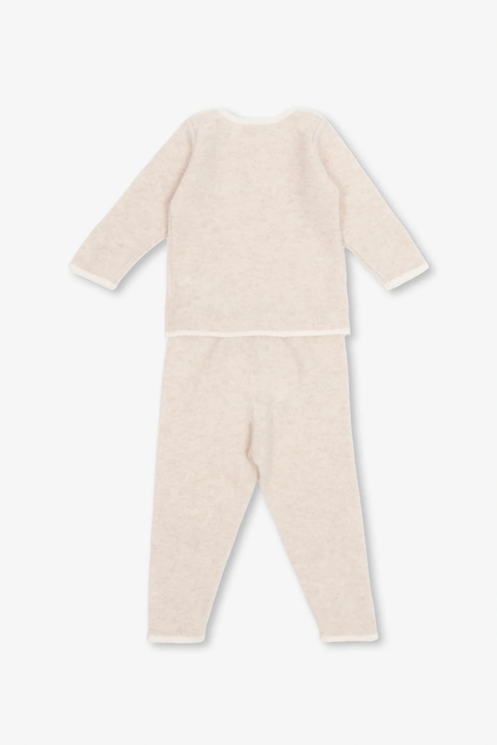 Light beige apparel set from Bonpoint. Made of cashmere, it includes a crewneck sweater with long sleeves and trousers featuring an elasticated waistband and decorative cream trims.