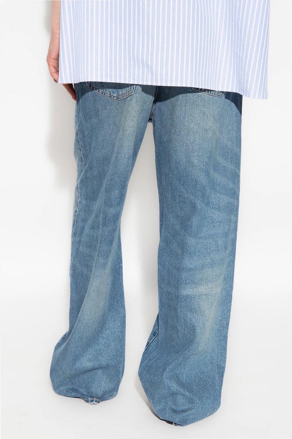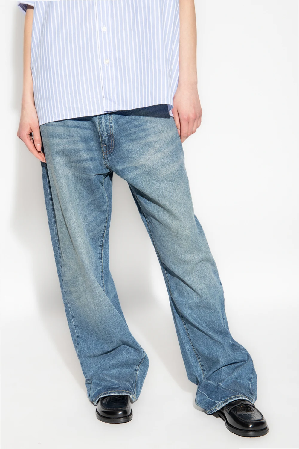 Blue distressed baggy jeans from R13. Fastened with a zip and button, this pair features a logo patch at the back, three front pockets, two back pockets and straight legs.