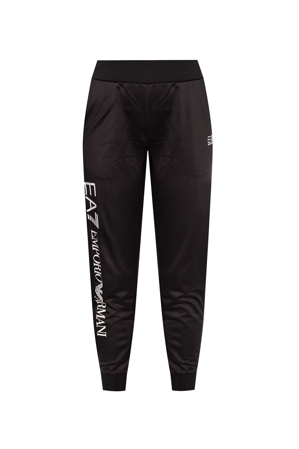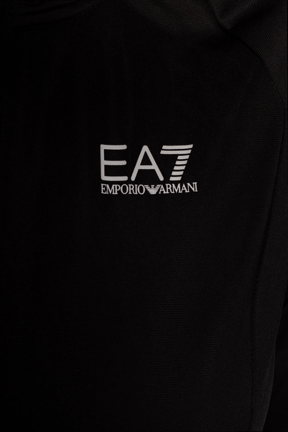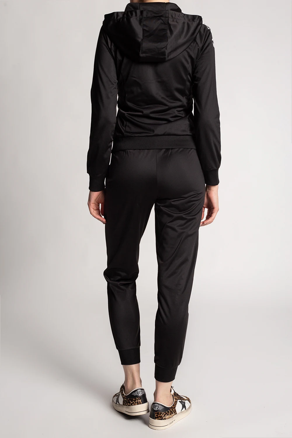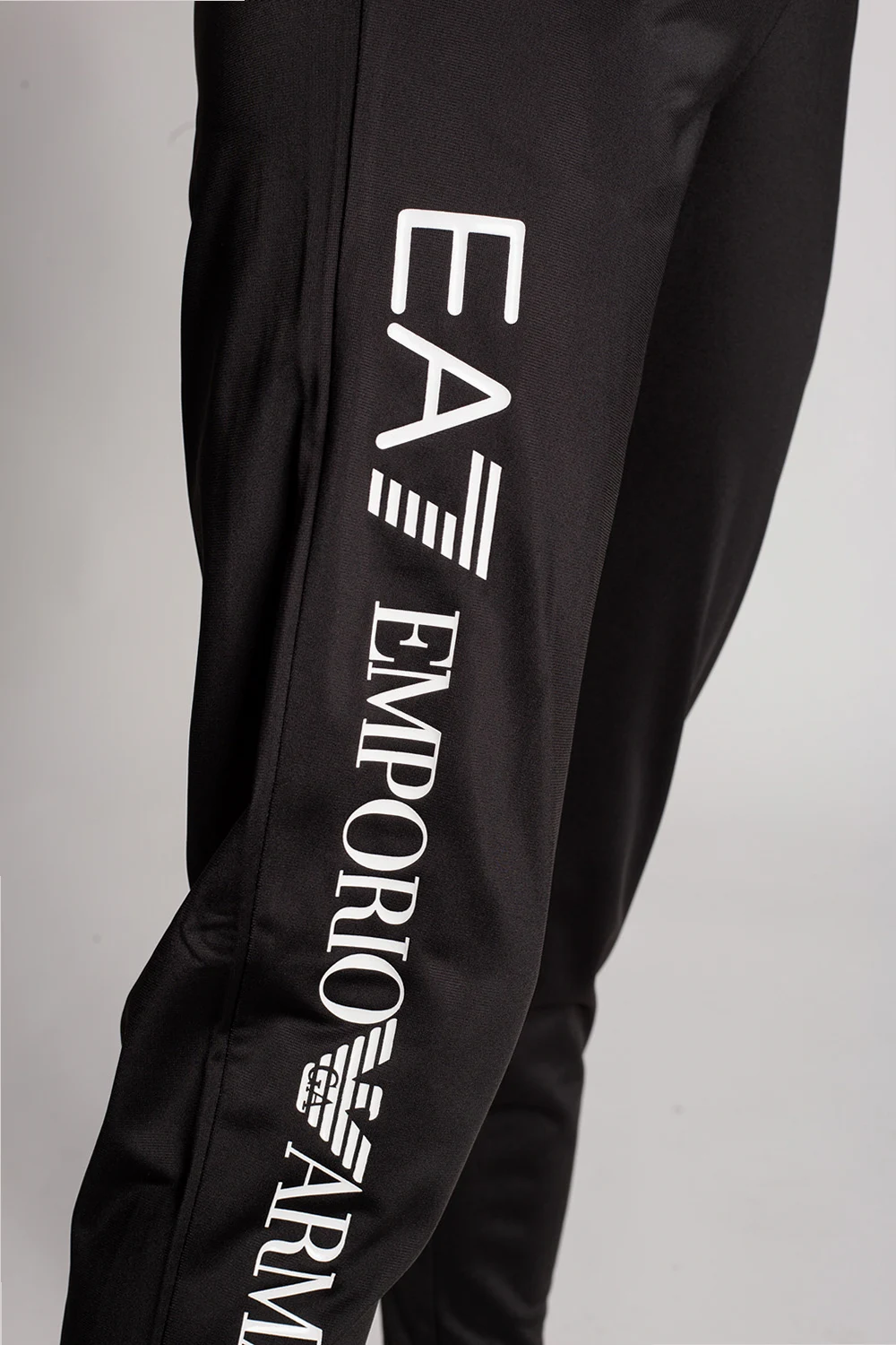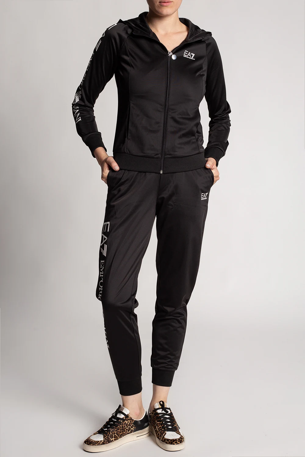 Black sweatshirt and sweatpants set with a white logo print from EA7 Emporio Armani. The sweatshirt has a hood, zip fastening, two slip pockets and ribbed trims at the hem and cuffs. The sweatpants are complete with an elastic waistband, two front pockets and ribbed cuffs.