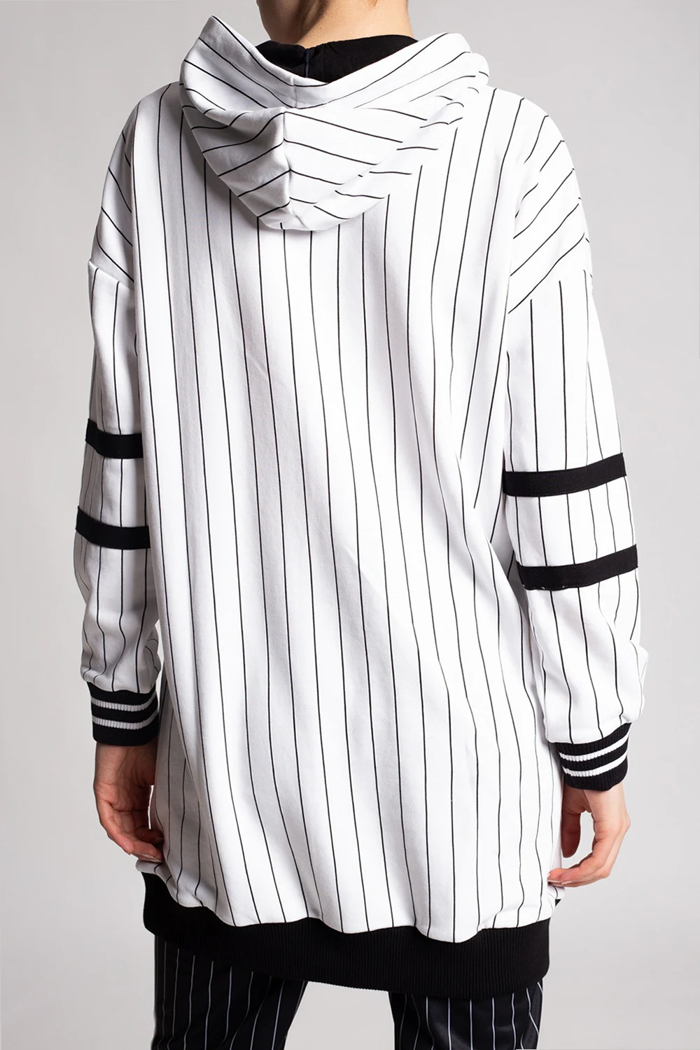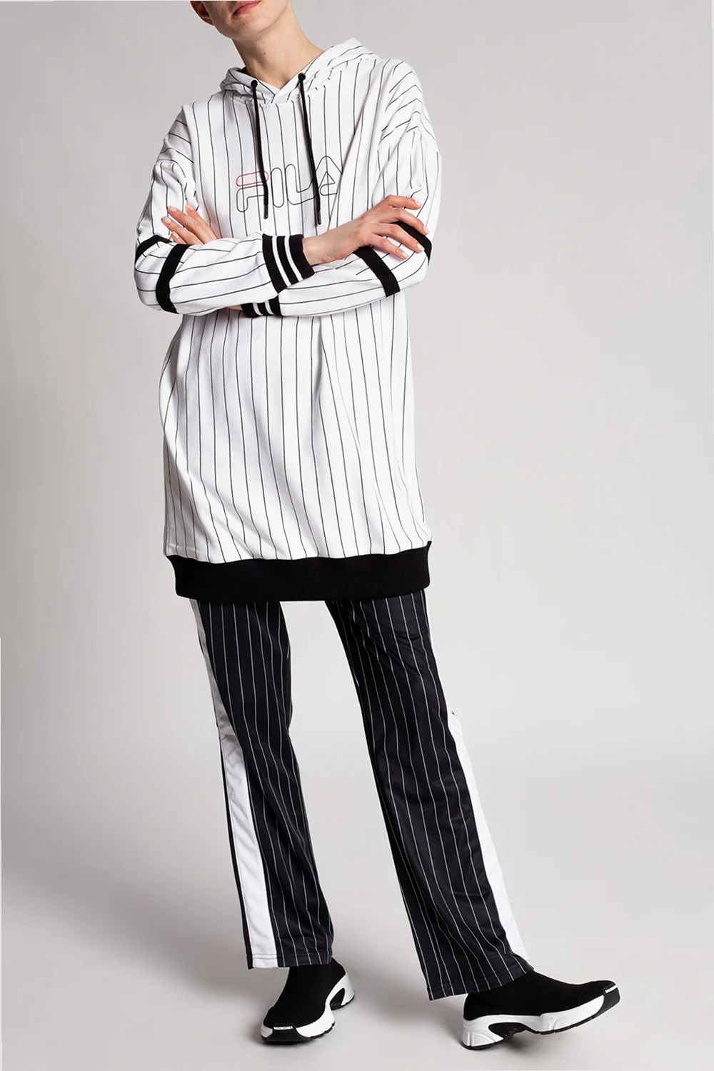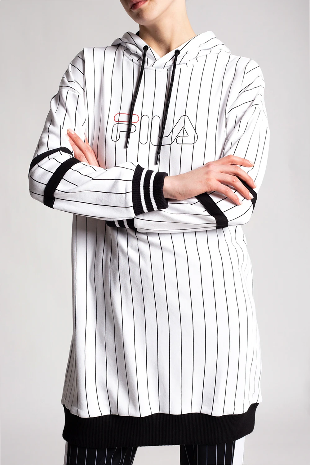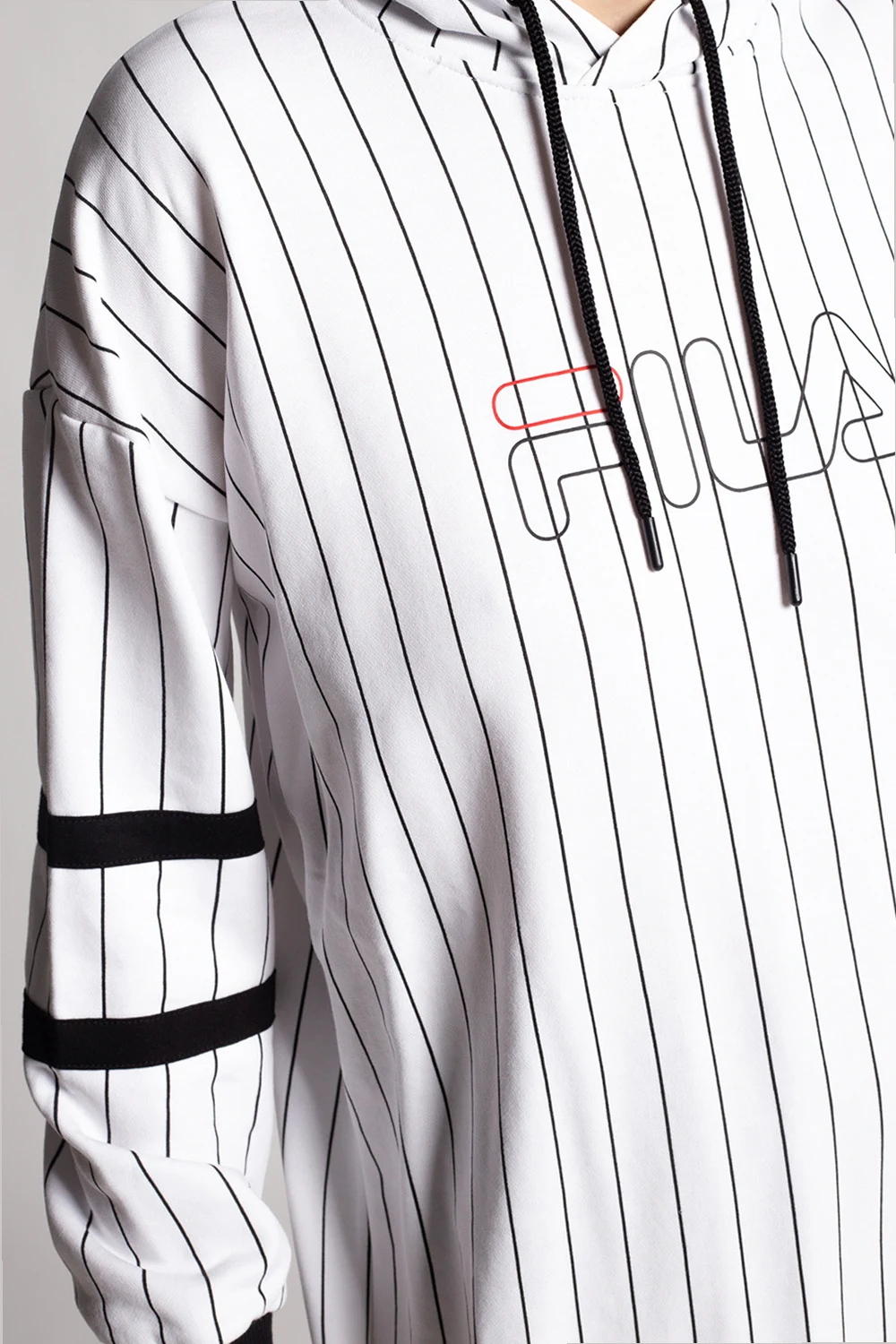White sweatshirt with a drawcord-adjustable hood from Fila. Crafted from cotton jersey, this hoodie showcases printed vertical stripes, a black and red logo and ribbed trims.