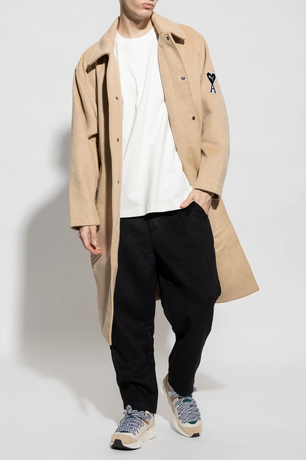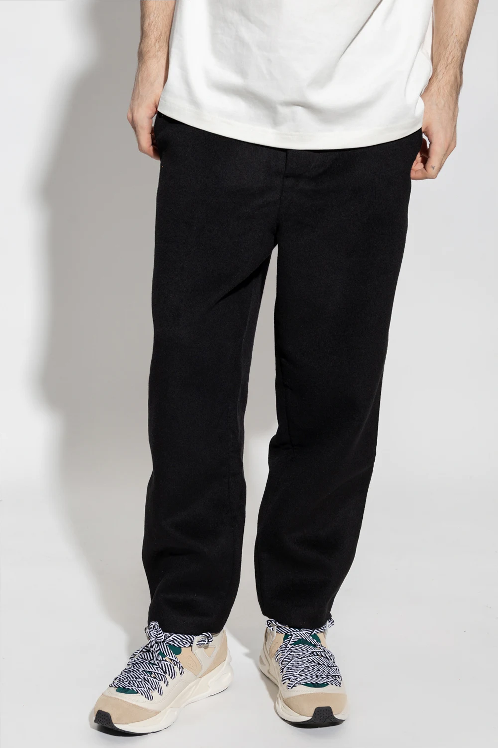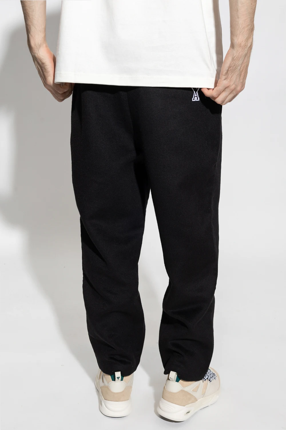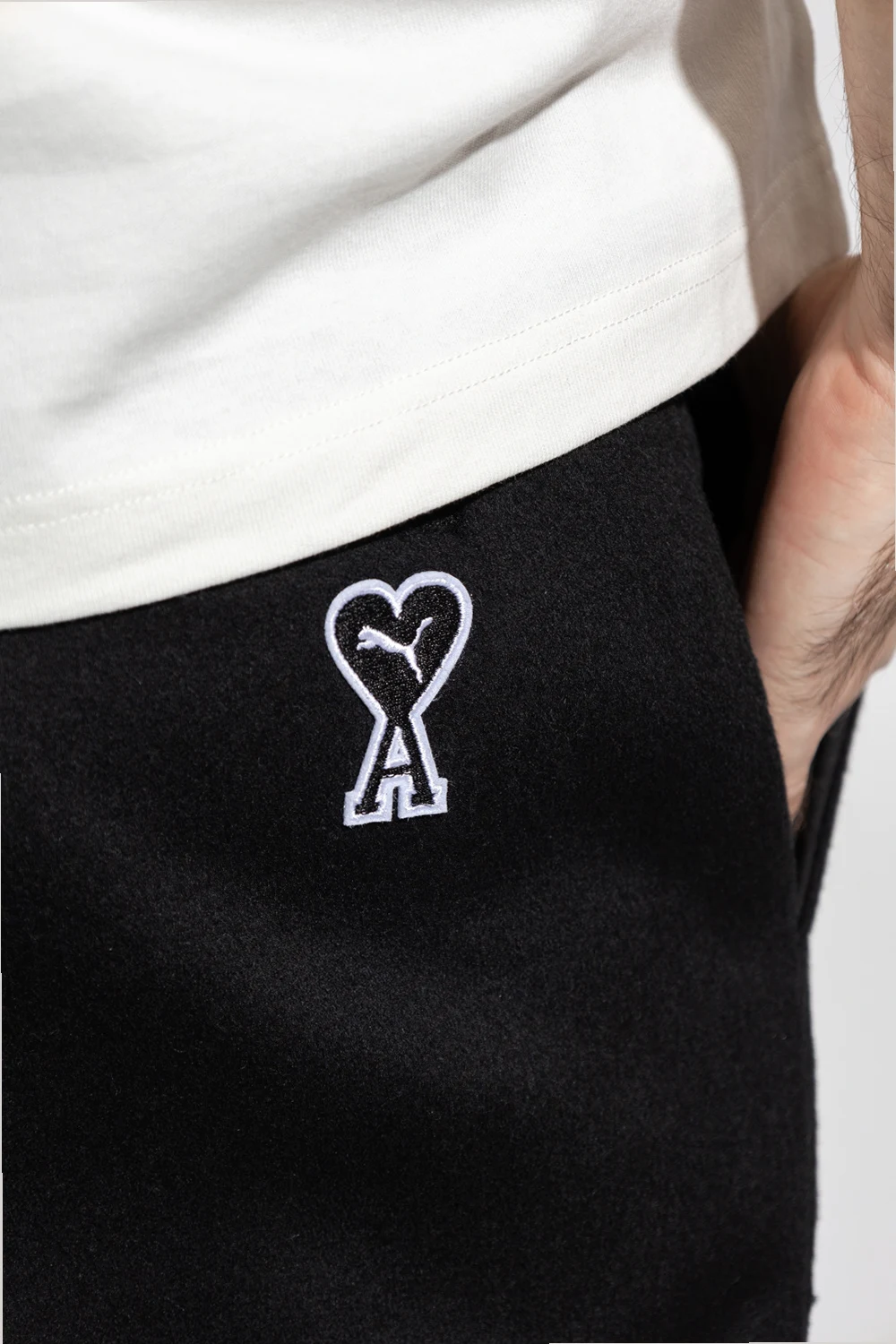 Black trousers from PUMA x AMI. Crafted from a wool blend, this pair falls with straight legs and features a zip fly with a button, a white and black patch which is a hybrid of the brands' ‘PUMA Cat’ and ‘Ami de Cur’ logo motifs, two side seam pockets and one back slip pocket.