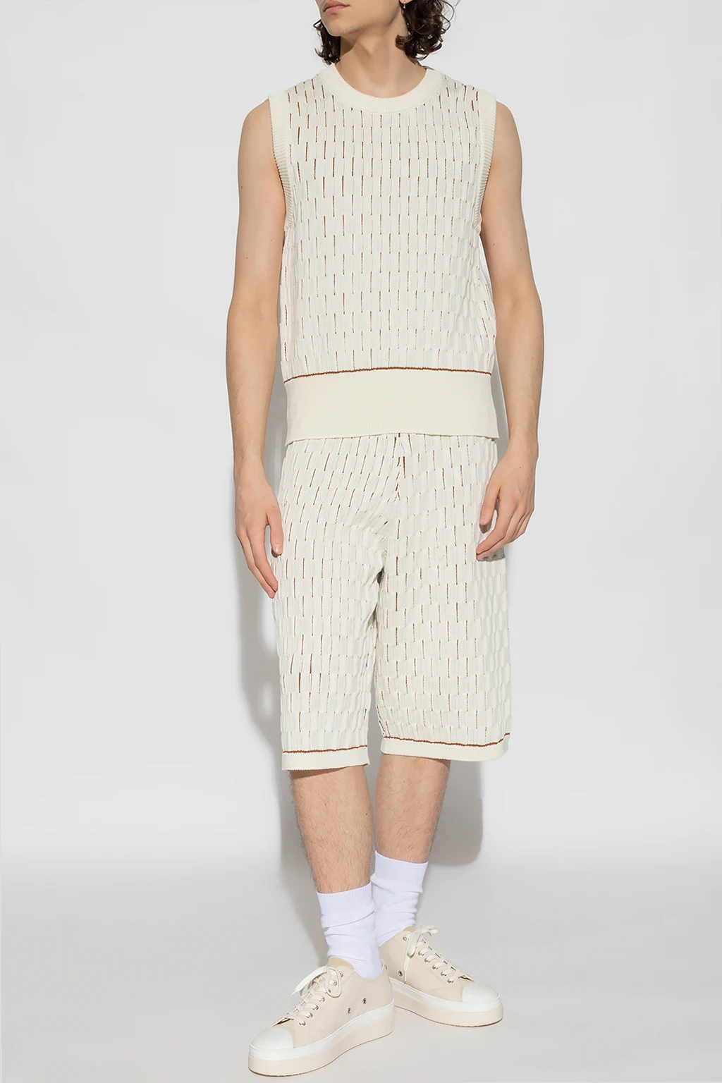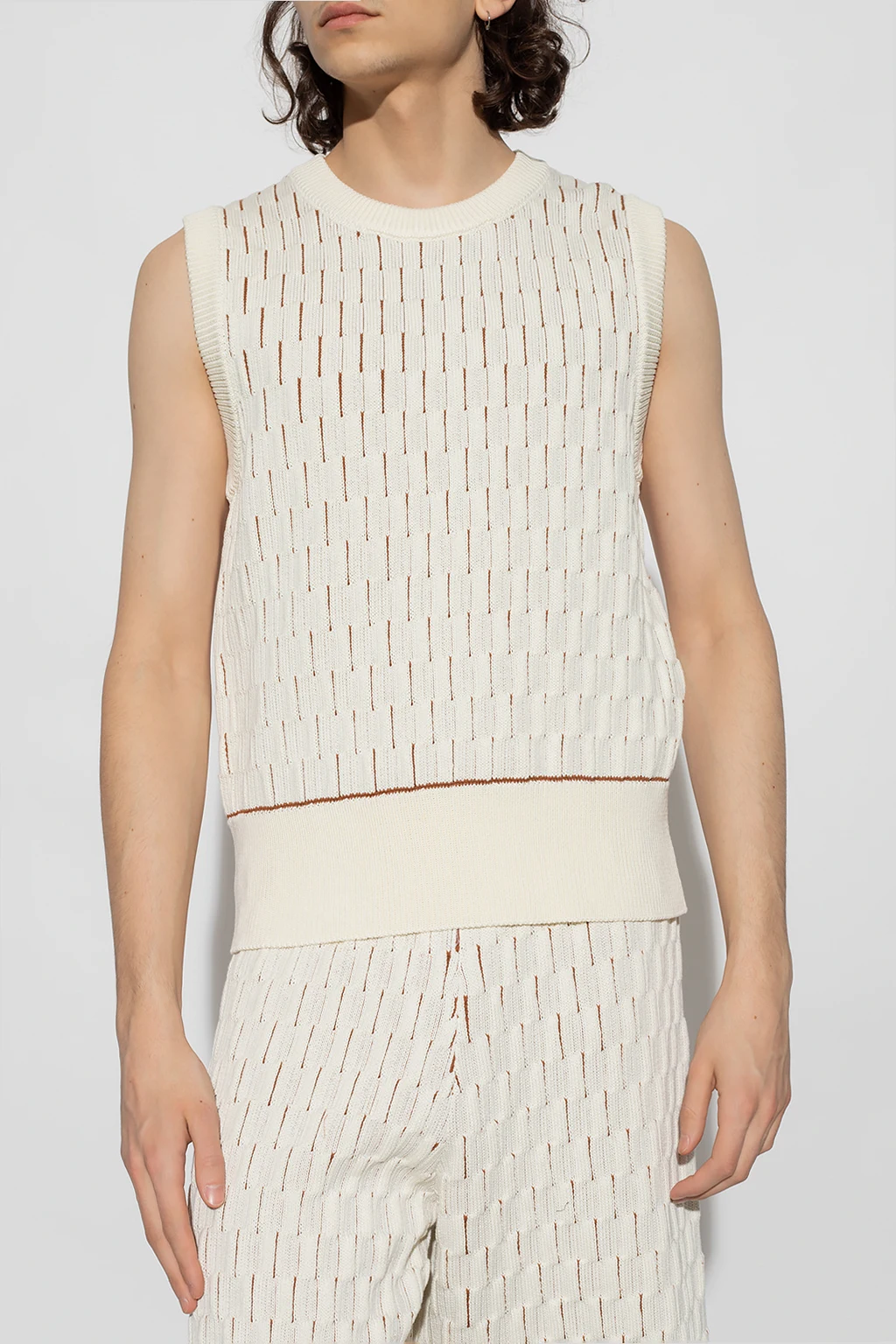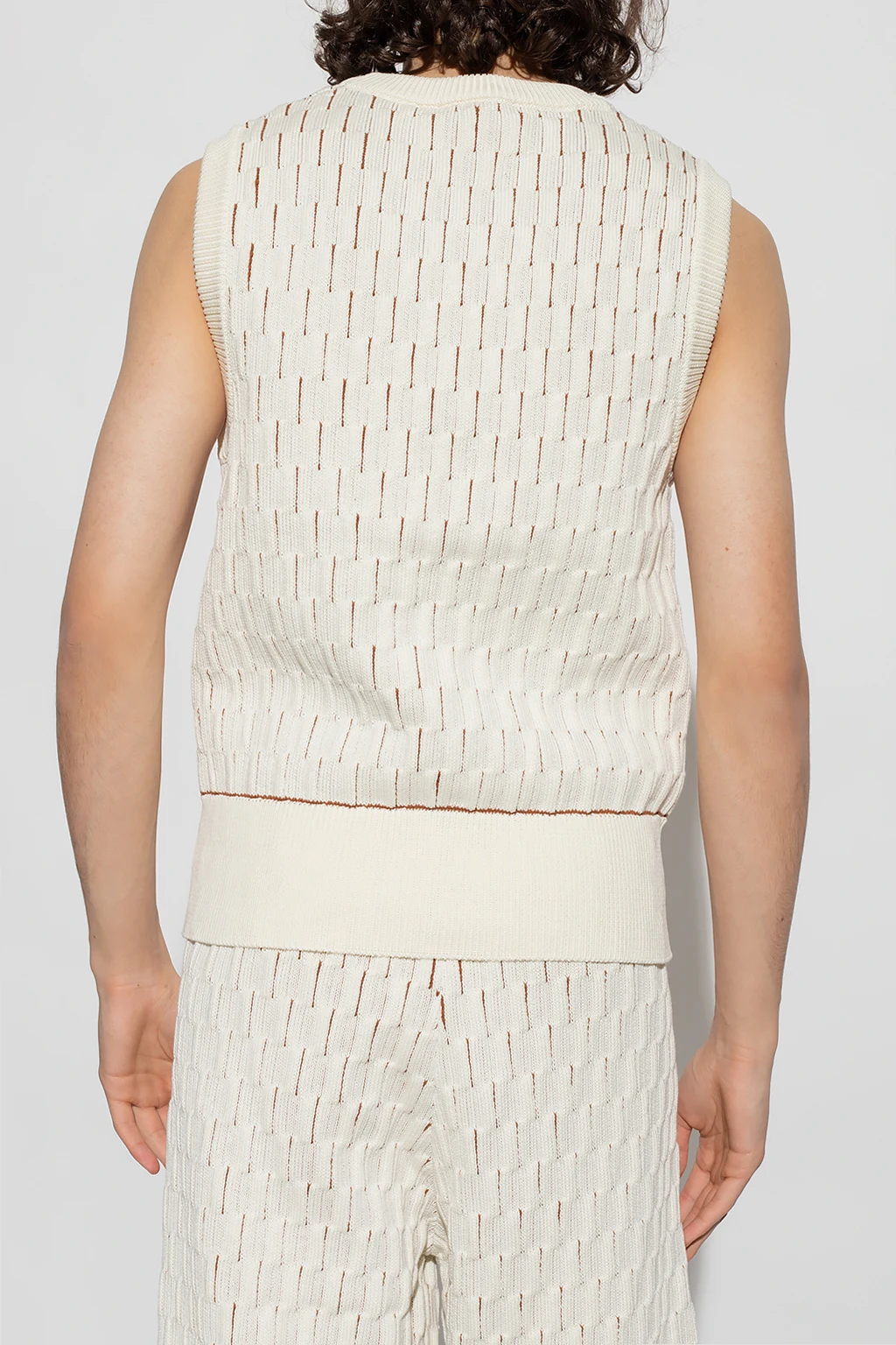 White and brown ‘Legacy’ vest from Wales Bonner. Made of cotton, this design features a decorative knit, round neck and ribbed edges.