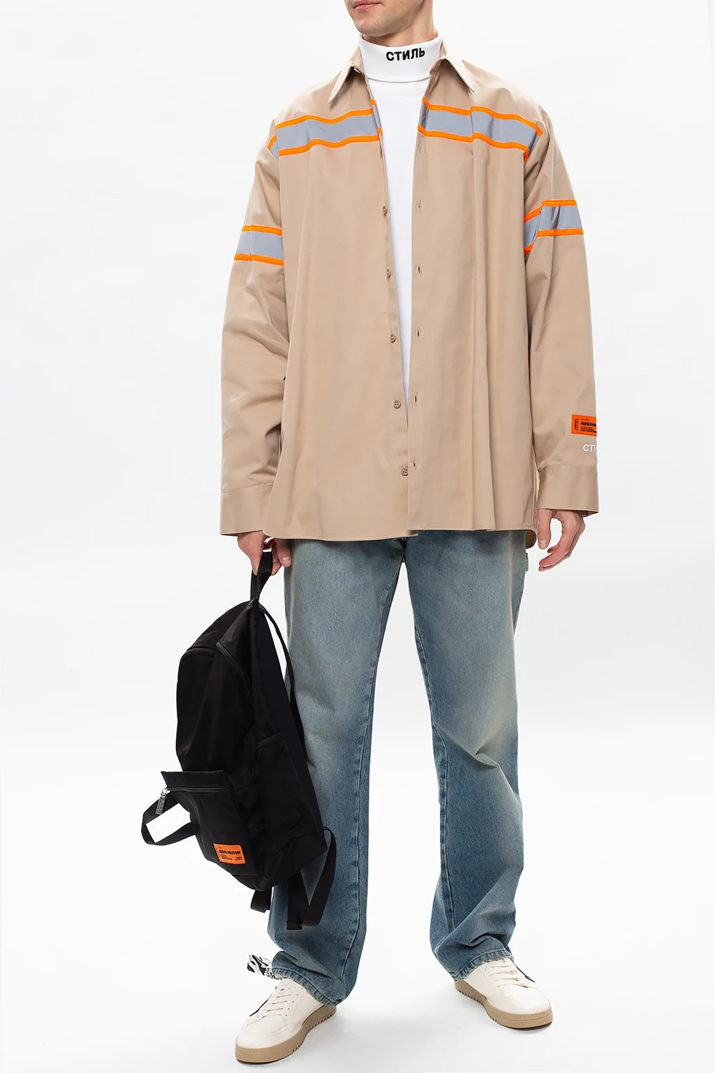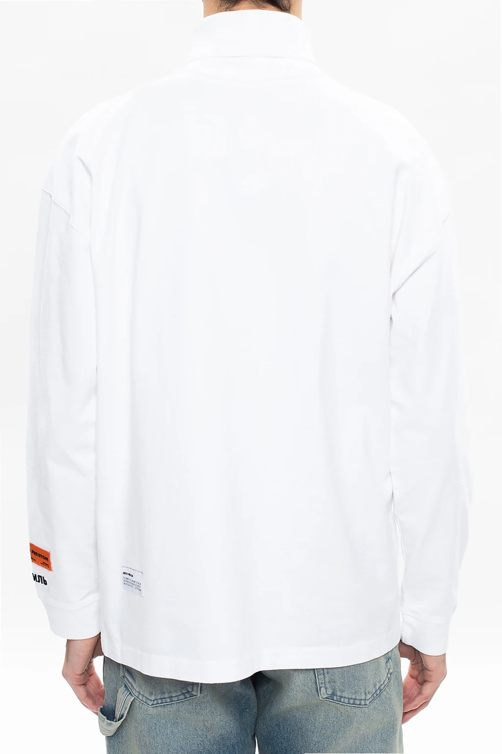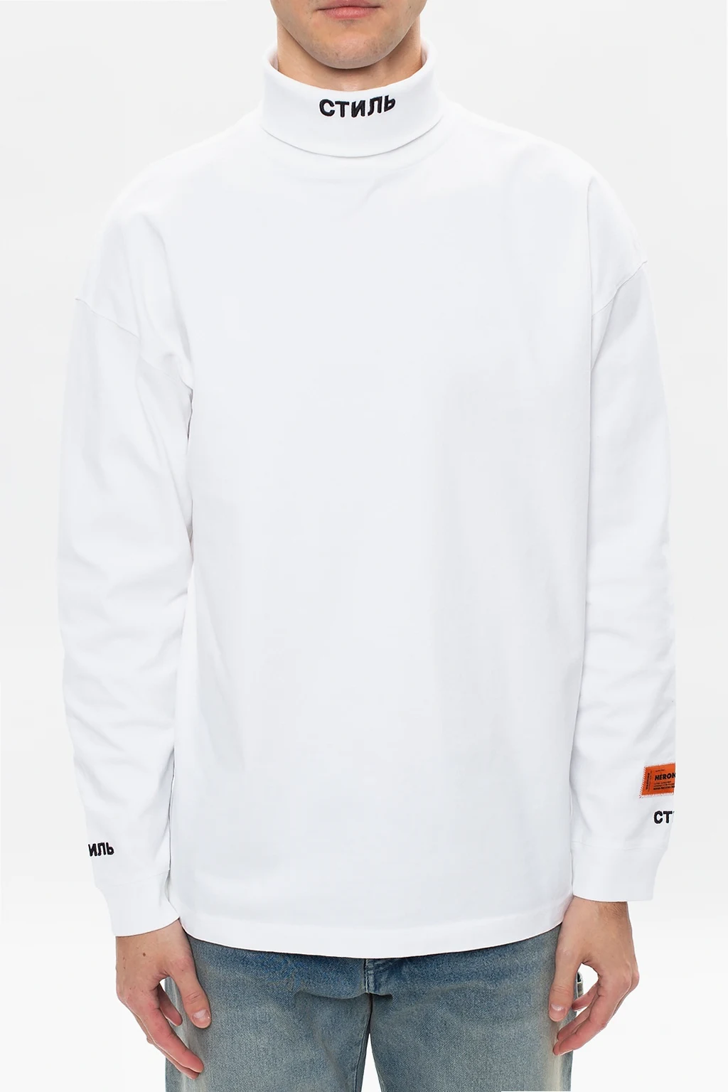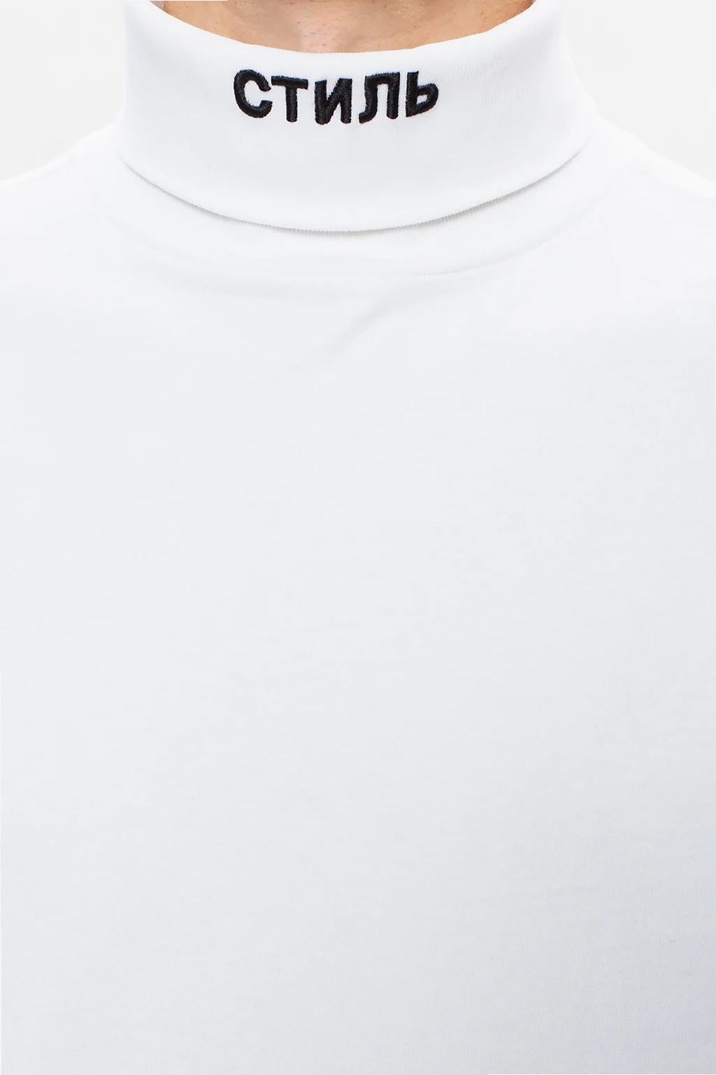 White roll neck top from Heron Preston. Embroidered with the designer's logo in black on the collar, this cotton-crafted style is complete with long sleeves and a white logo patch on the back.