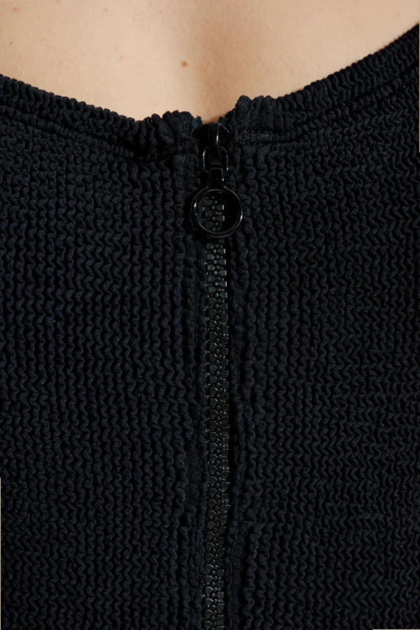 Die dominierende schwarze Farbe und das strukturierte Material verleihen dem Badeanzug ein einzigartiges Aussehen, das mit subtiler Eleganz die Blicke auf sich zieht. Breite Träger sorgen für Tragekomfort, während der tiefe Rückenausschnitt dem Design Raffinesse und Eleganz verleiht. Ergänzt wird die Funktionalität durch einen Reißverschluss mit rundem Griff, der nicht nur die Nutzung erleichtert, sondern auch ein stilvolles Detail darstellt.