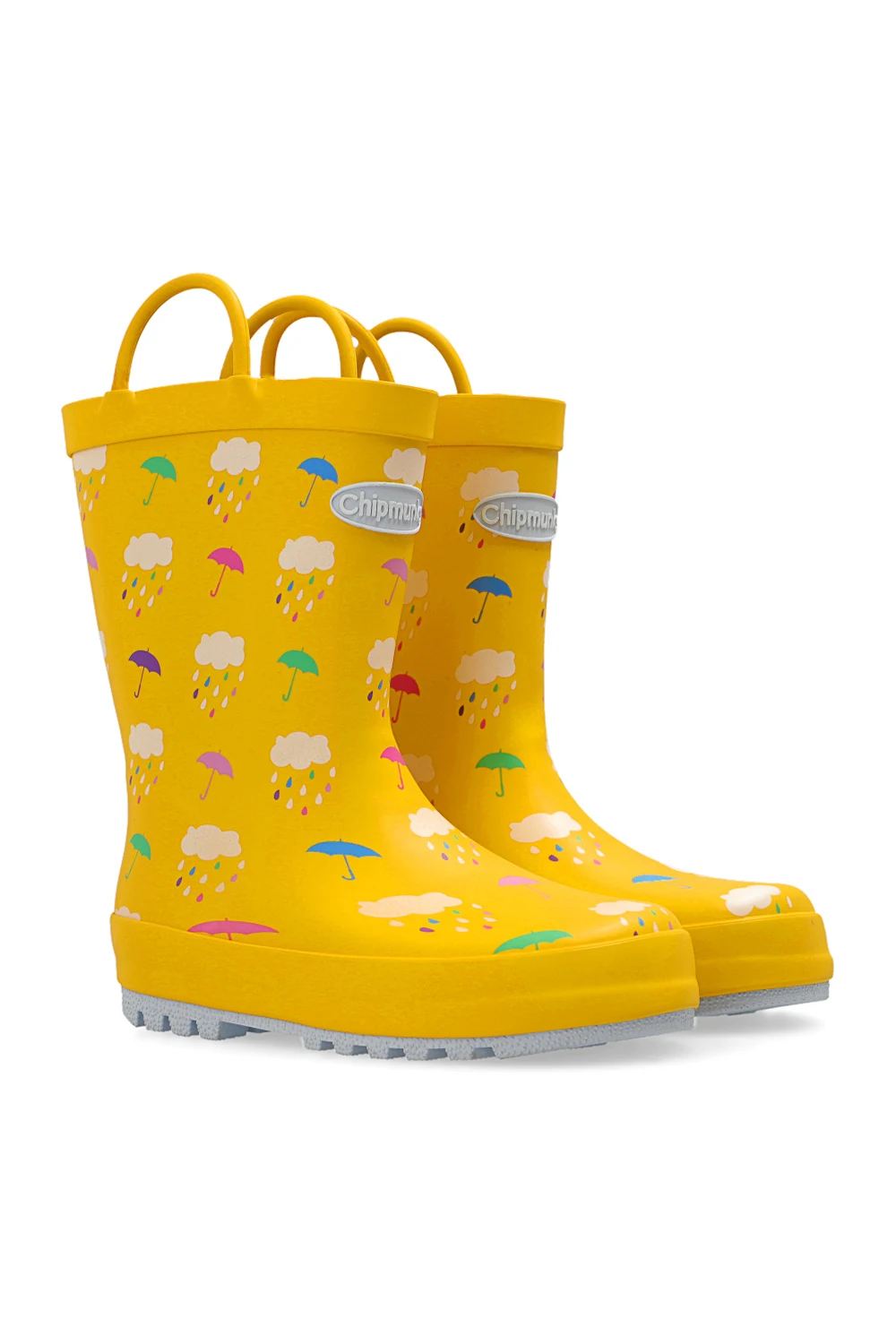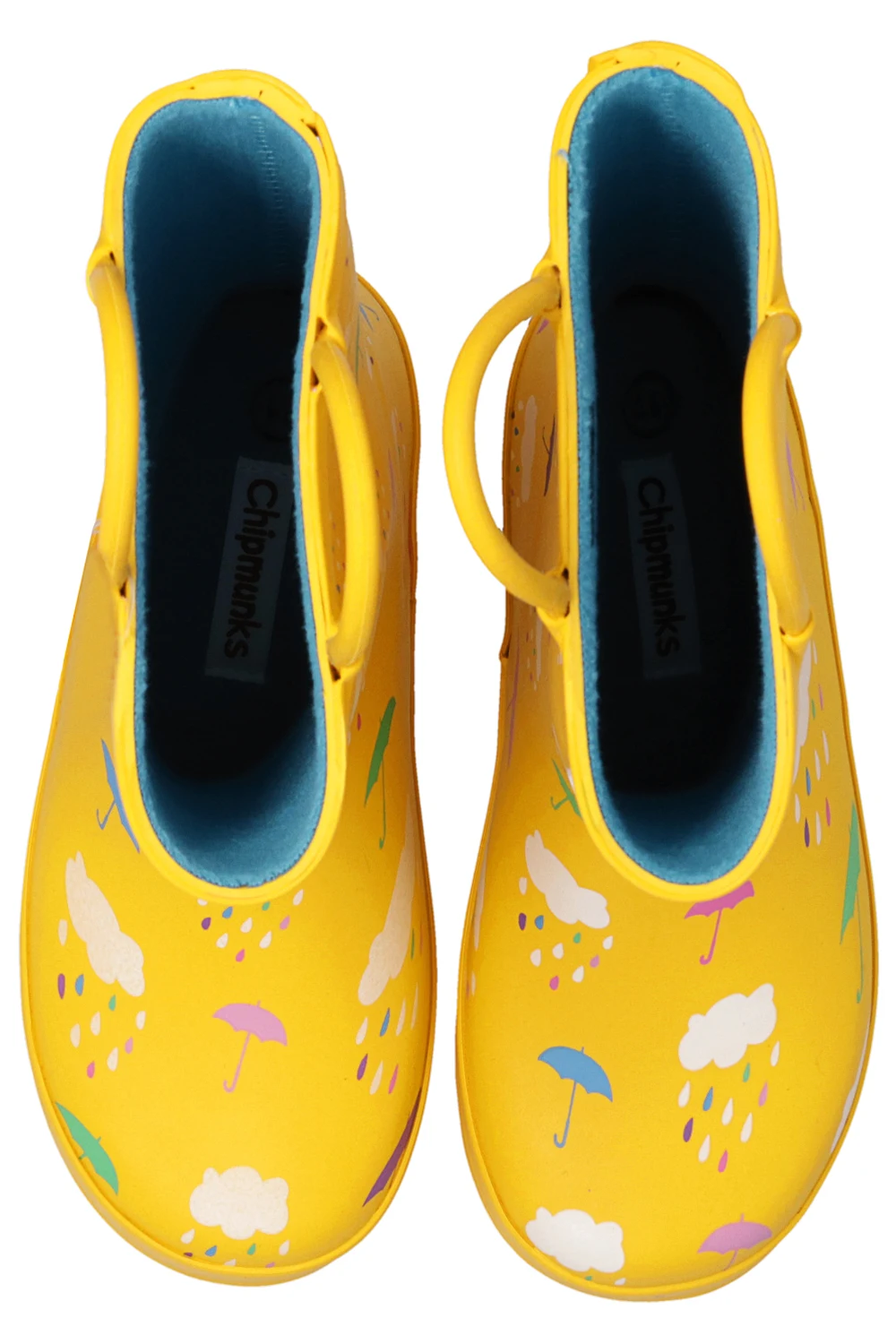 Yellow, waterproof ‘Rain’ boots from Chipmunks. Resting on a light blue rubber sole, this pair features a multicolored pattern, raised logo, textile lining and two half-round straps for an easy on and off.