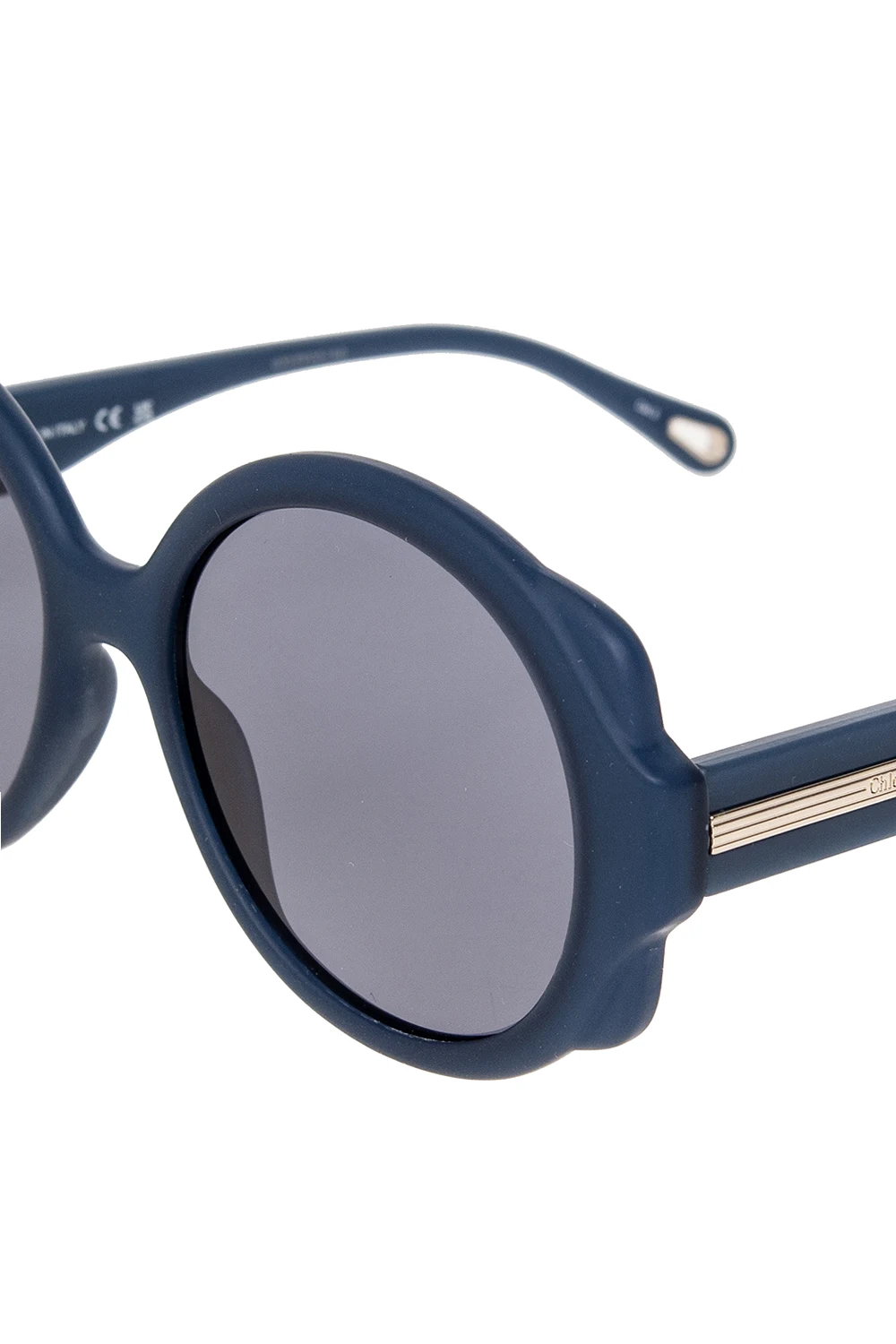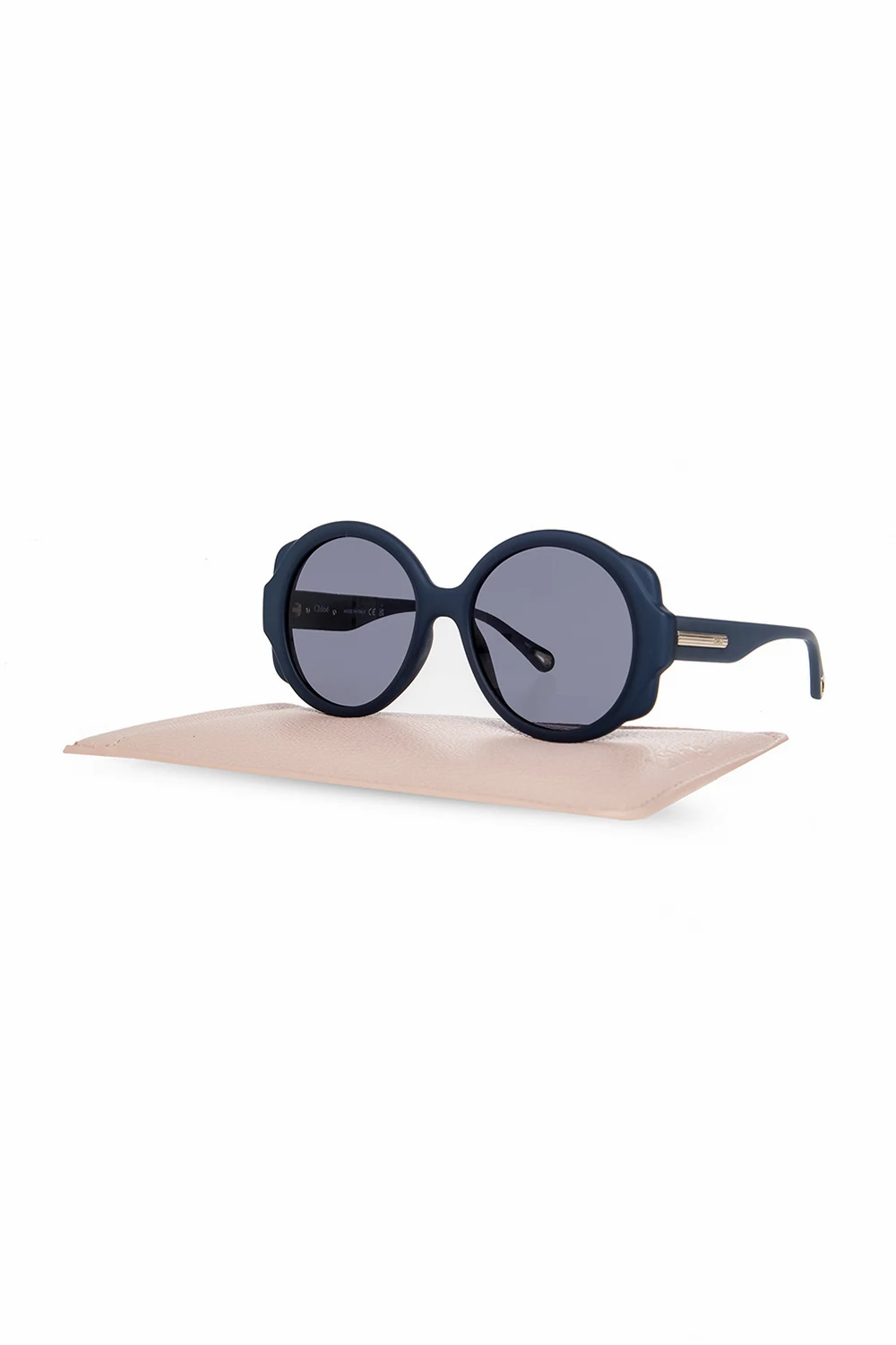 Navy blue ‘Mirtha’ sunglasses from Chloé. With matte black round frames made from recycled plastic, this pair features a decorative logo-engraved gold metal plate at the temples, drop-shaped openings at the temple tips, light gold-tone metal hardware and blue nylon lenses with 100% UVA/UVB protection. Branded leather case included.