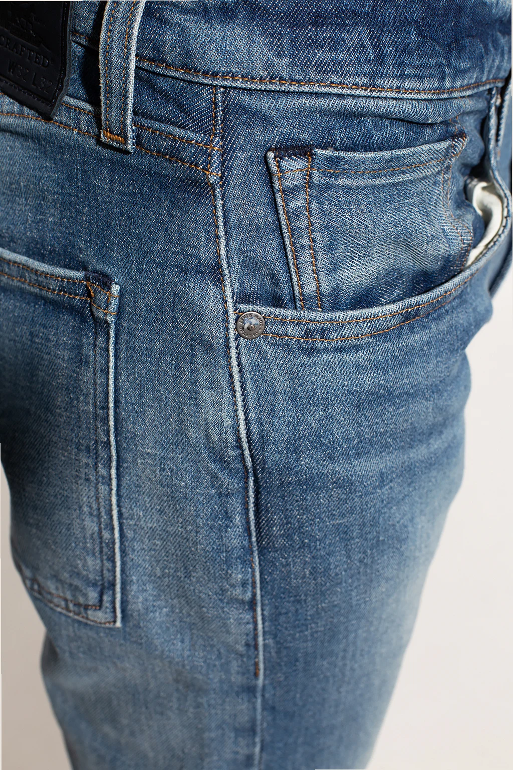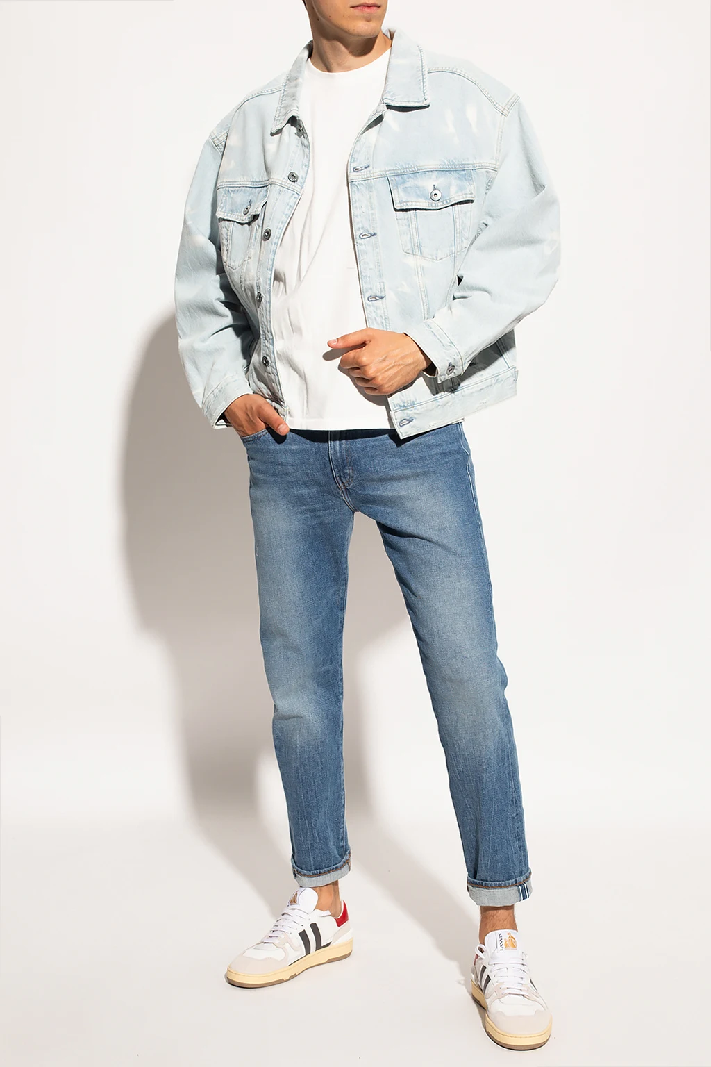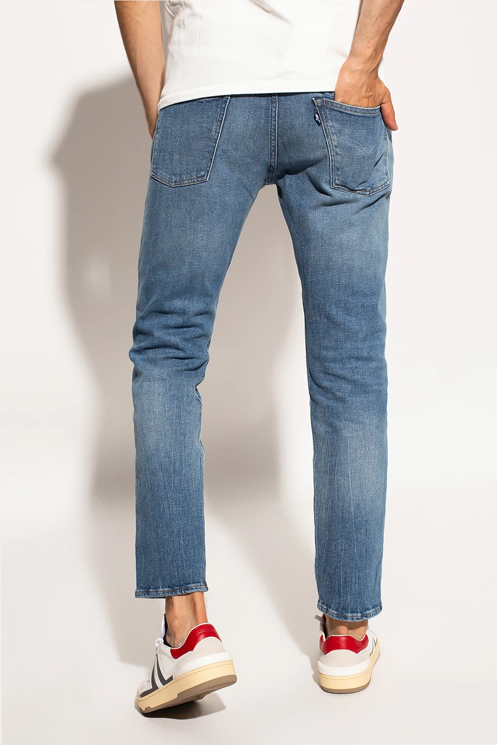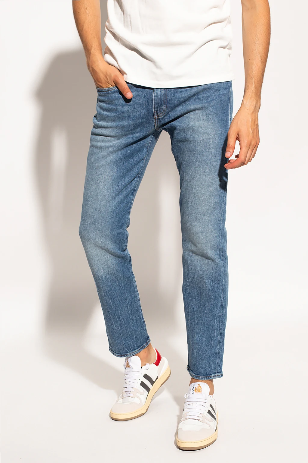Blue ‘502’ jeans from Levi’s, the ‘Made & Crafted ®’ collection. Fastened with zip fly and button, this tapered leg design features yellow stitching details, a black logo patch, three front pockets and two back pockets.