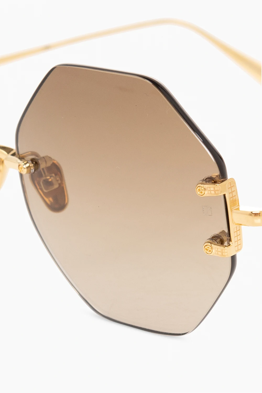 Gold-tone and brown ‘Arua’ sunglasses from Linda Farrow. This hexagonal pair casts an iconic 70s silhouette and is formed from 3mm thick lenses expertly cut and hand polished for a glossy high shine edge. The rimless gradient lenses are clasped in place with an intricate setting which folds over the outer edge. Engineered from 18 carat rose gold plated titanium with etched detailing which transitions into the signature graduated temple. A discreetly logoed nose bridge flows into adjustable nose pads for a tailored fit. The anti-glare lenses provide 100% UV protection. Comes with a branded case. Handcrafted in Japan.