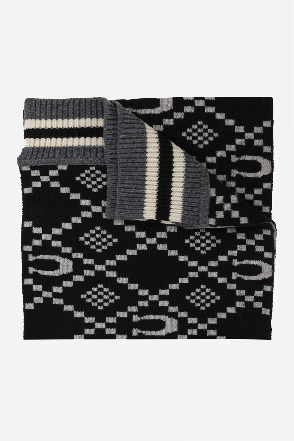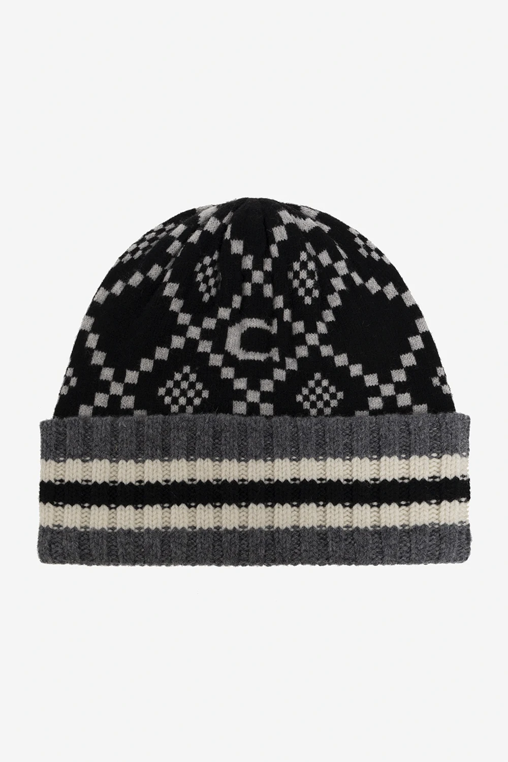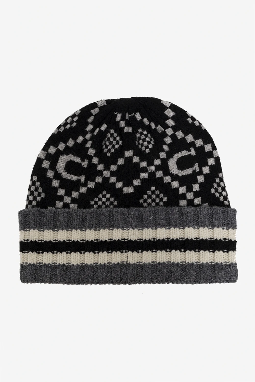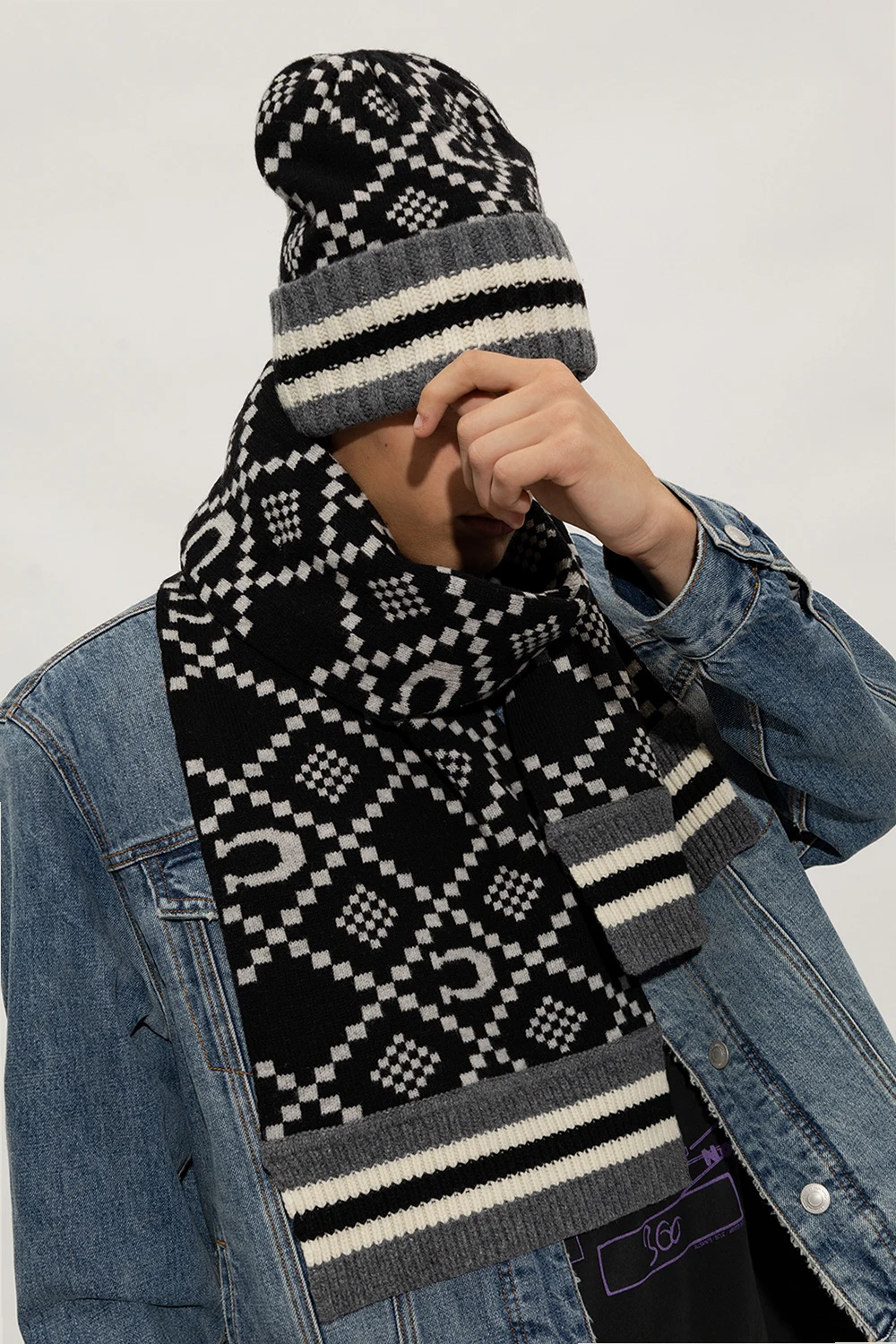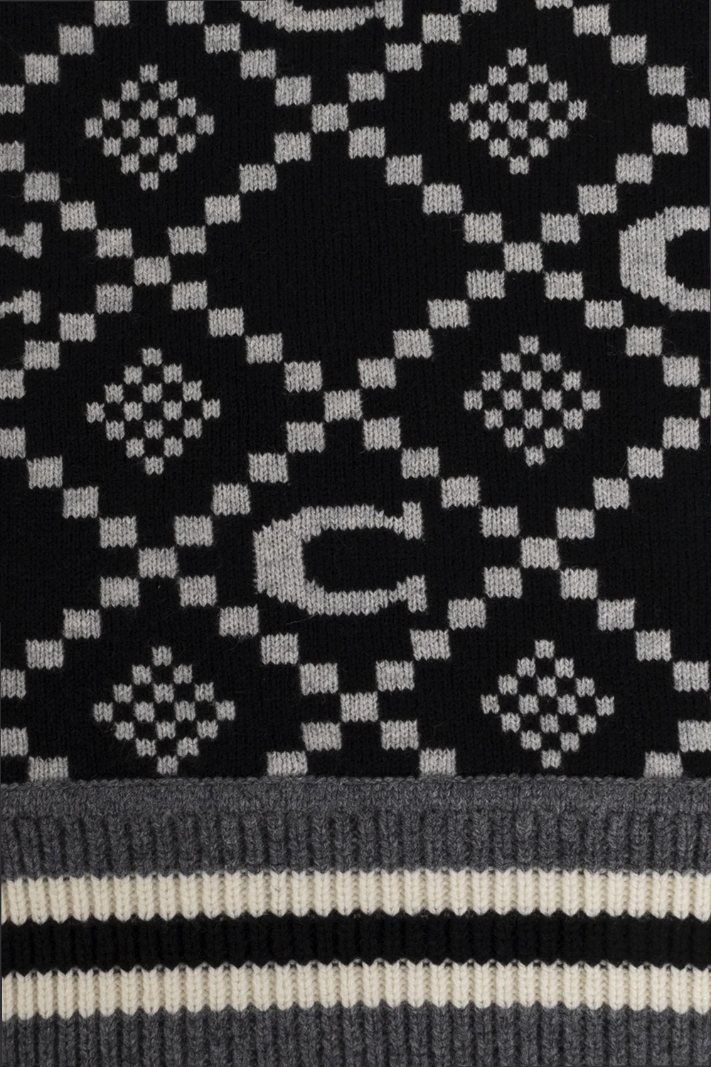 Grey, black and cream beanie & scarf set from Coach. Crafted from wool, it showcases a monogram pattern.