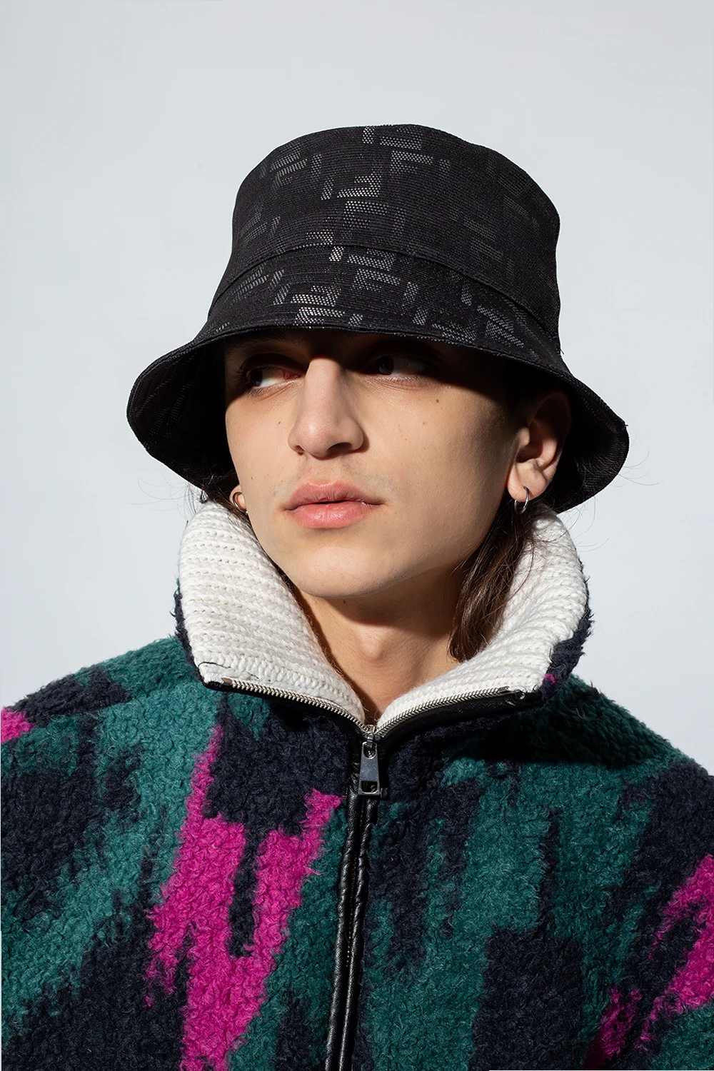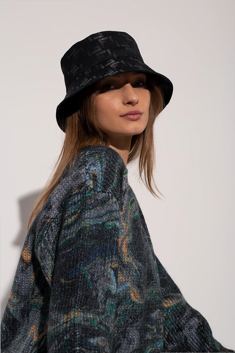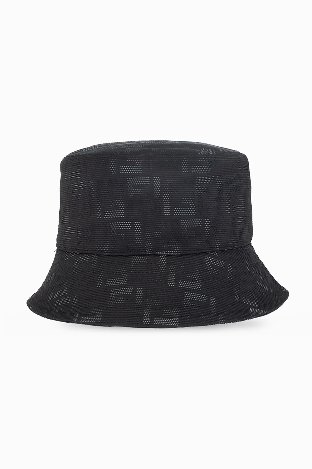 Black bucket hat from Fendi. This item features black and silver-tone logo embroideries and cotton lining.