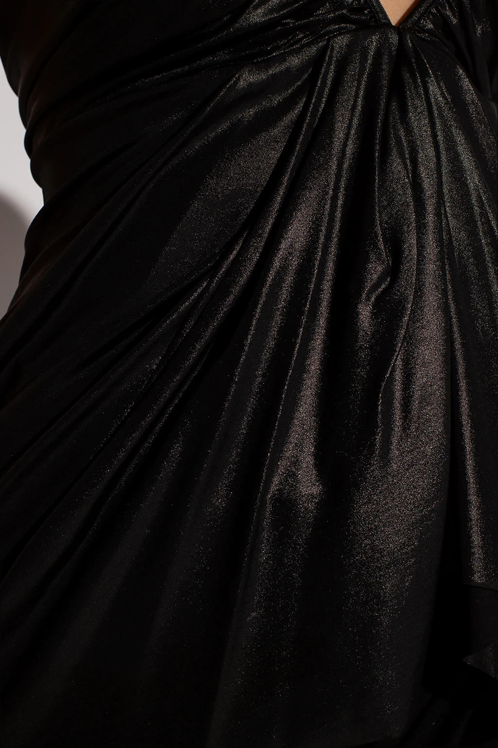Black ‘Scarlett’ top from Rick Owens Lilies. Crafted from FSC-certified material with a metallic finish, this style features a plunging V-neckline, denuded shoulders, gathered details and a draped front panel that creates an asymmetrical ruffle.