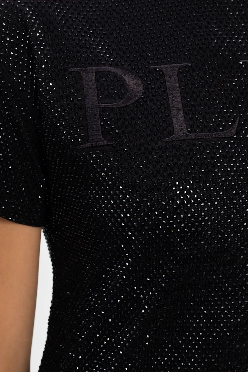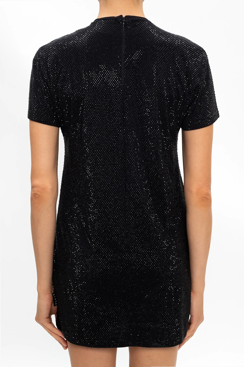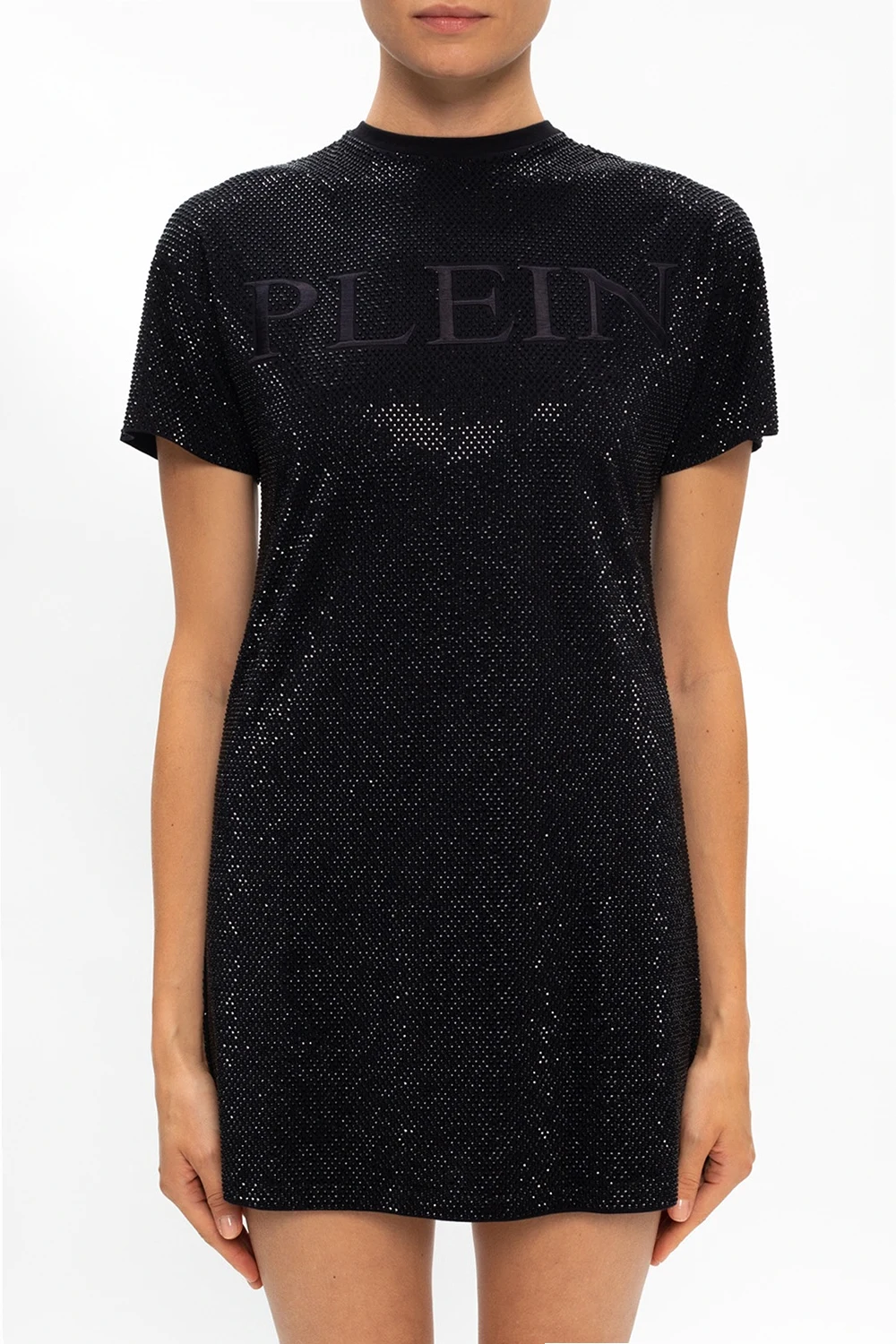 Black dress with a round neck from Philipp Plein. Crafted from cotton, this short sleeve design fastens at the back with a concealed zip and is embellished with crystals and a logo embroidery.
