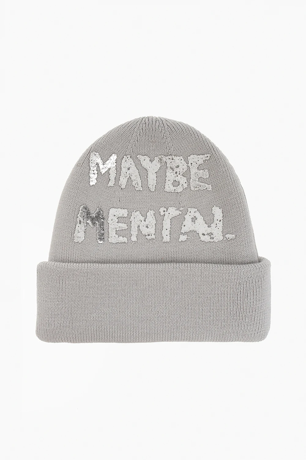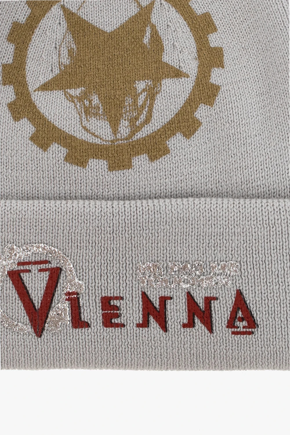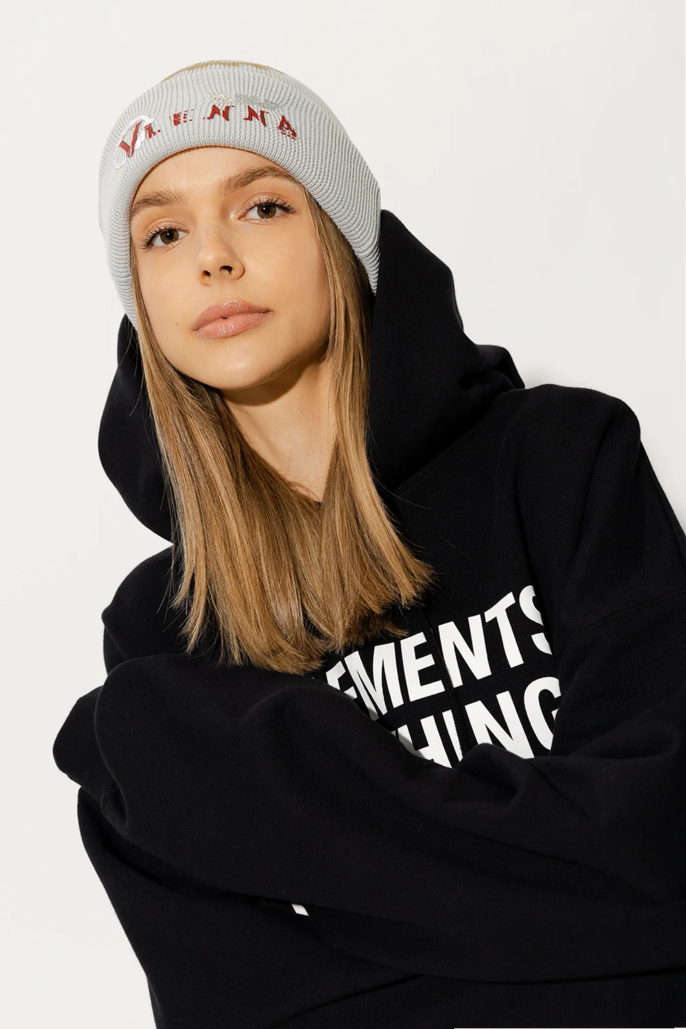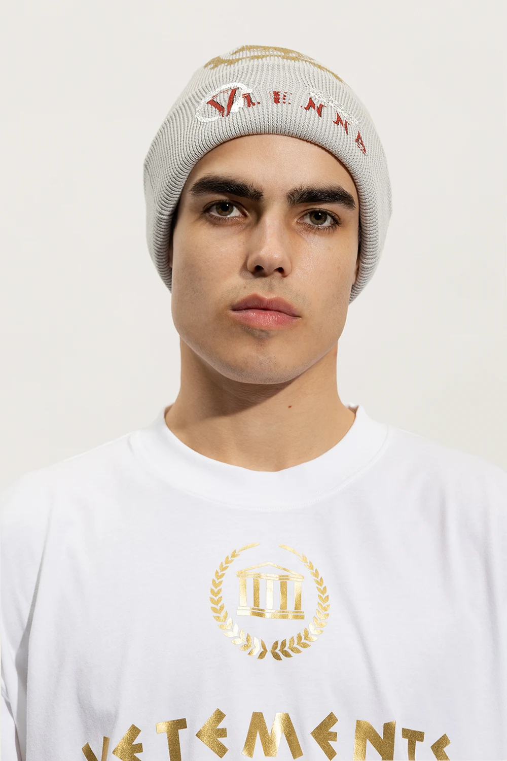 Light grey beanie from Vetements. Crafted from merino wool, this item is decorated with a printed pattern in silver-tone, beige and red.
