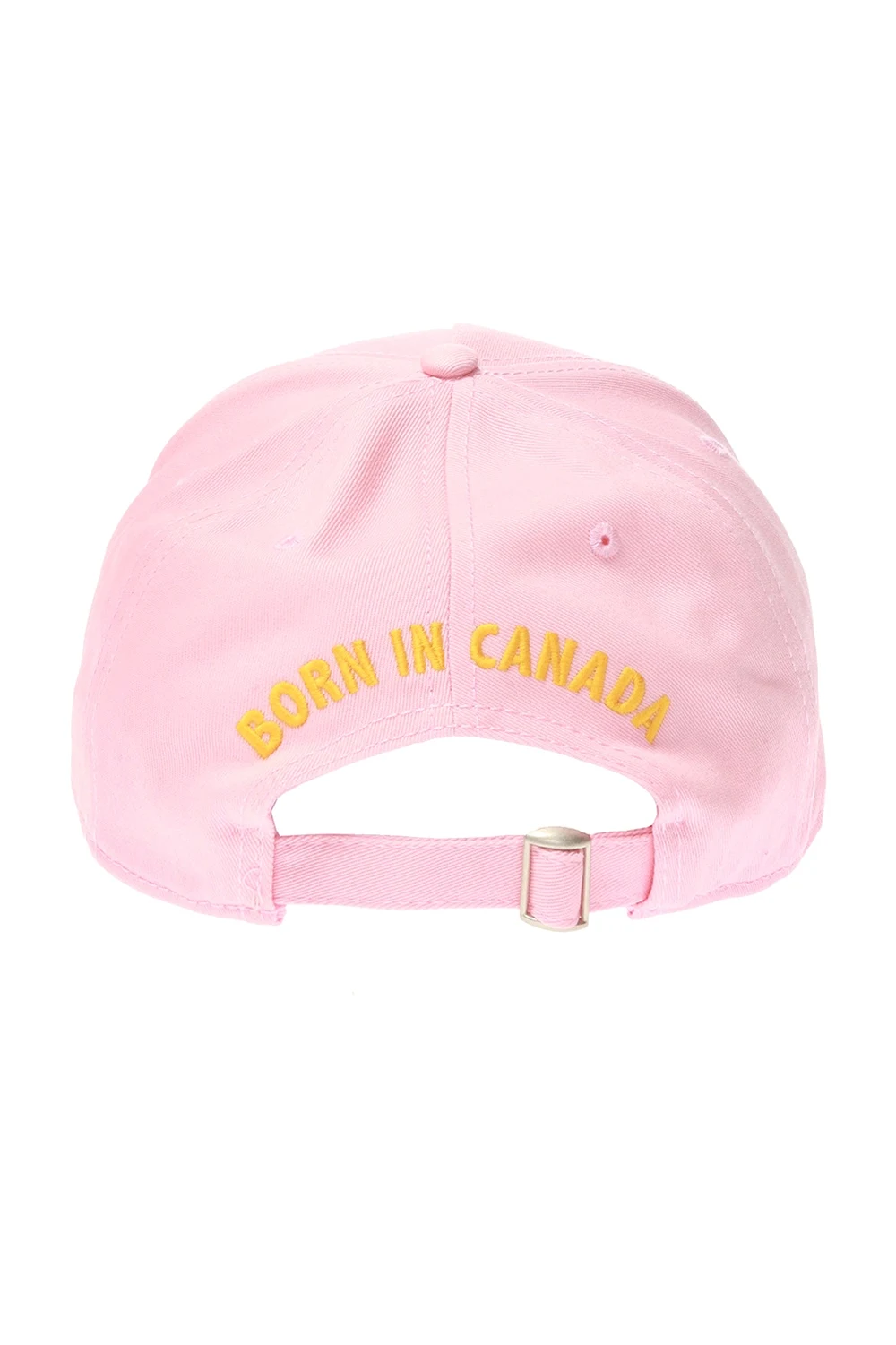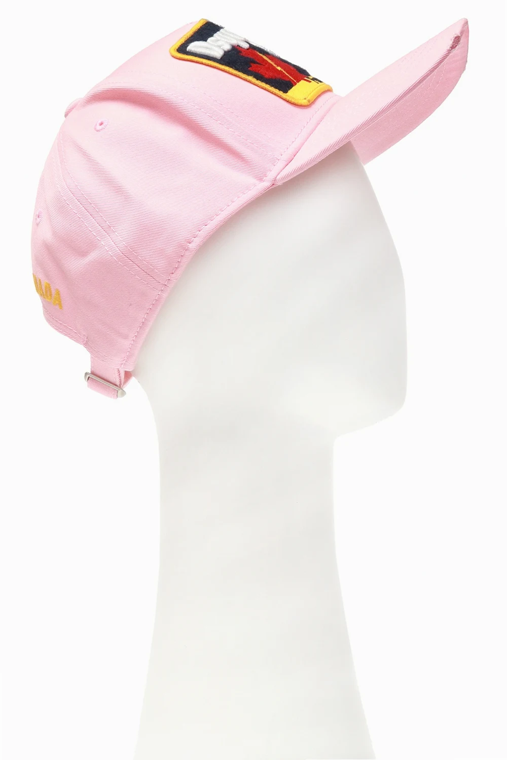 Pink baseball cap with a raw trim from Dsquared2. Made of cotton. Decorated with a colorful logo patch. Adjustable strap at the back.
