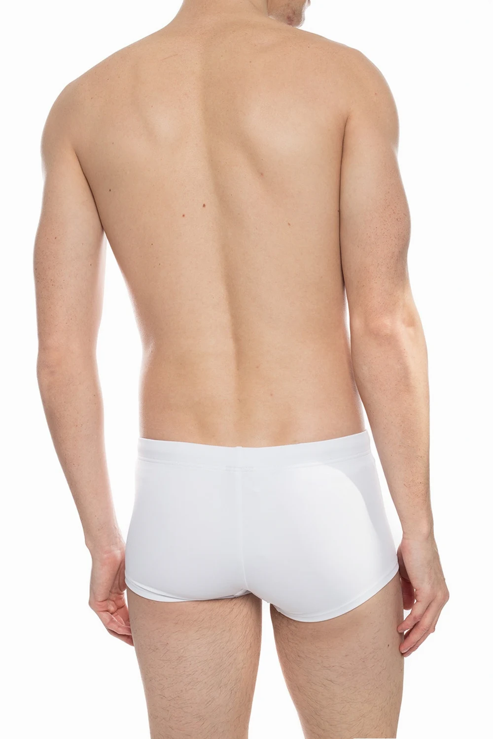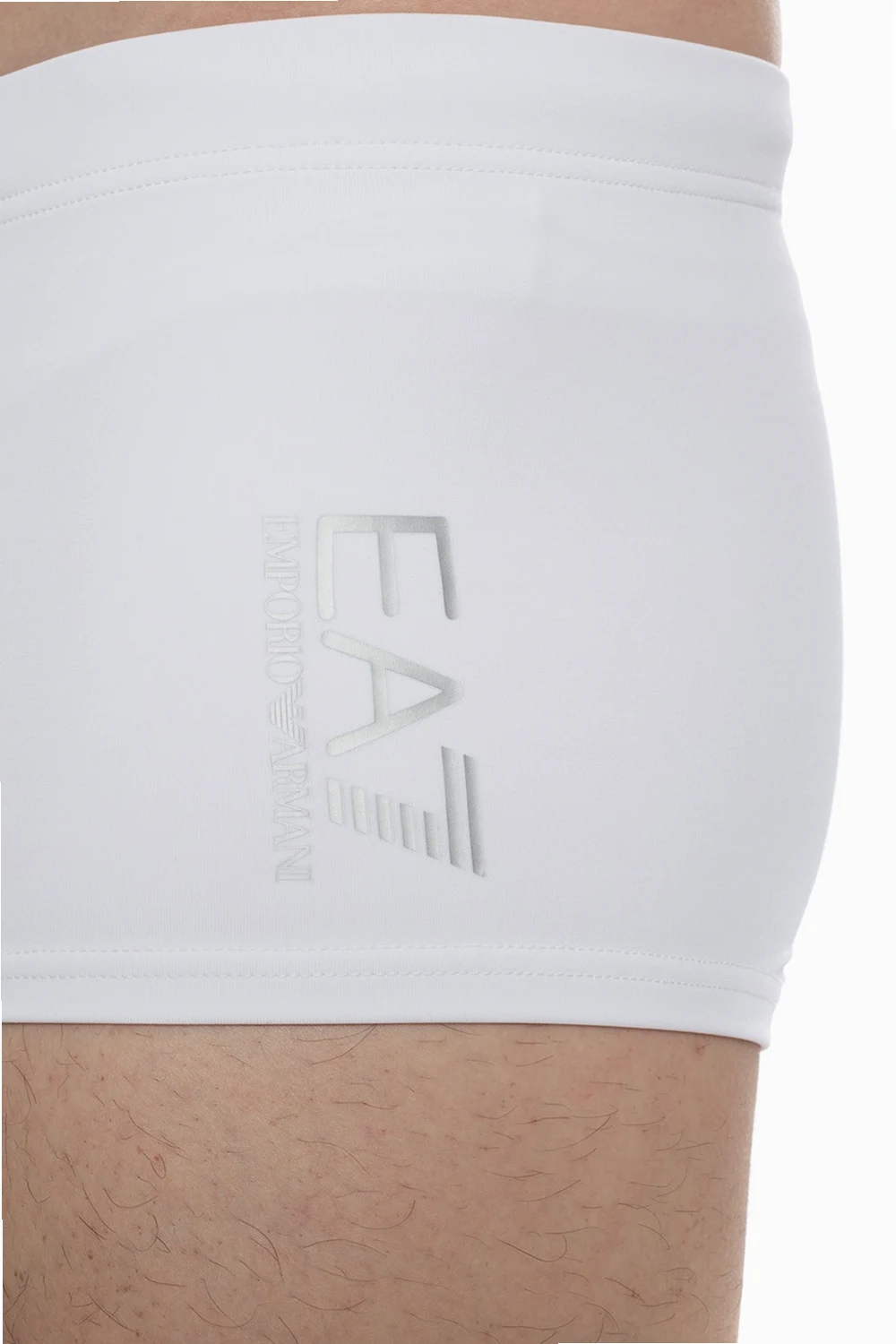 White swim shorts from EA7 Emporio Armani. Drawstring waist. Decorated with a grey logo print.