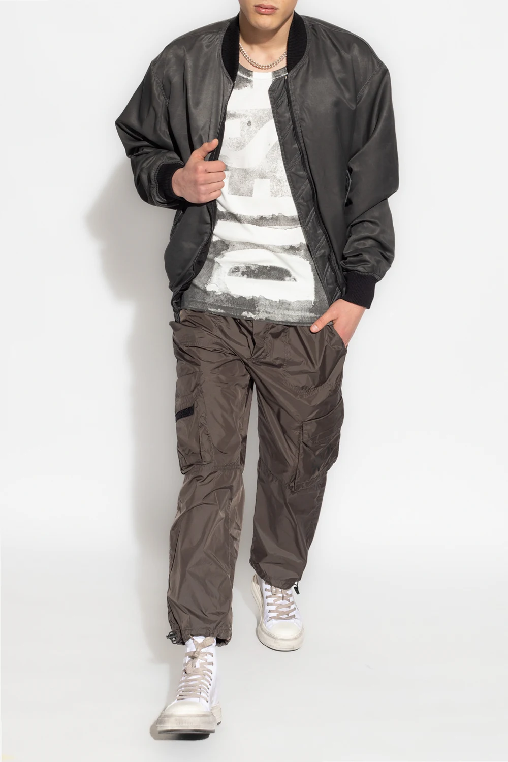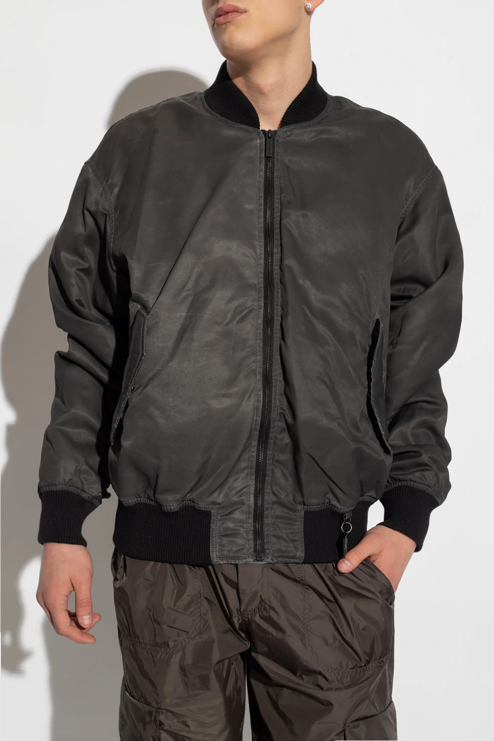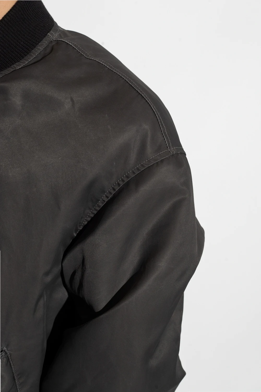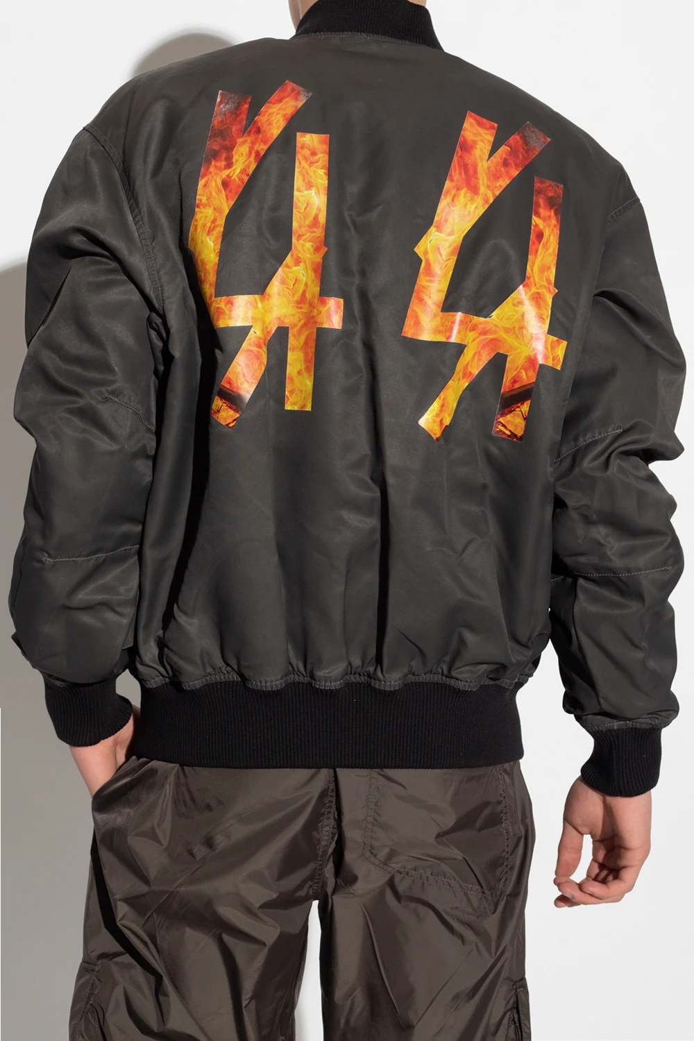Dark grey bomber jacket from 44 Label Group. Embellished with an orange and red flames logo print at the back, this style features a zip fastening, two flapped pockets with snaps, a logo-engraved charm at the hem and elasticized trims on the edges.