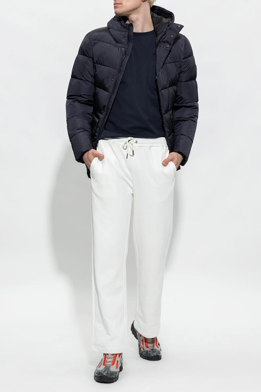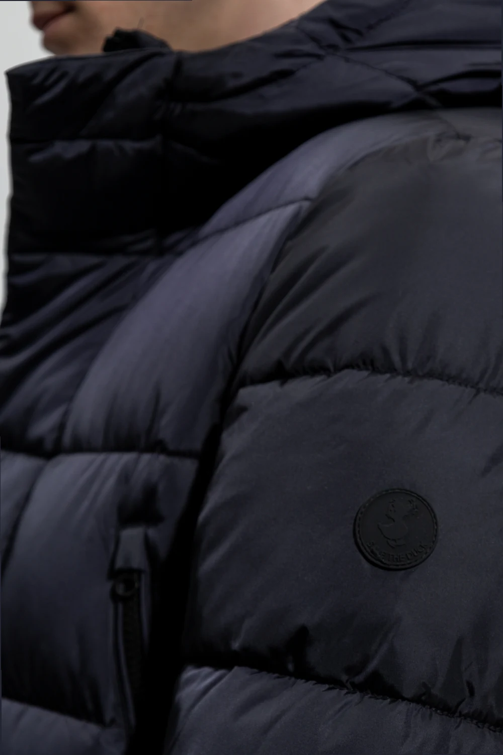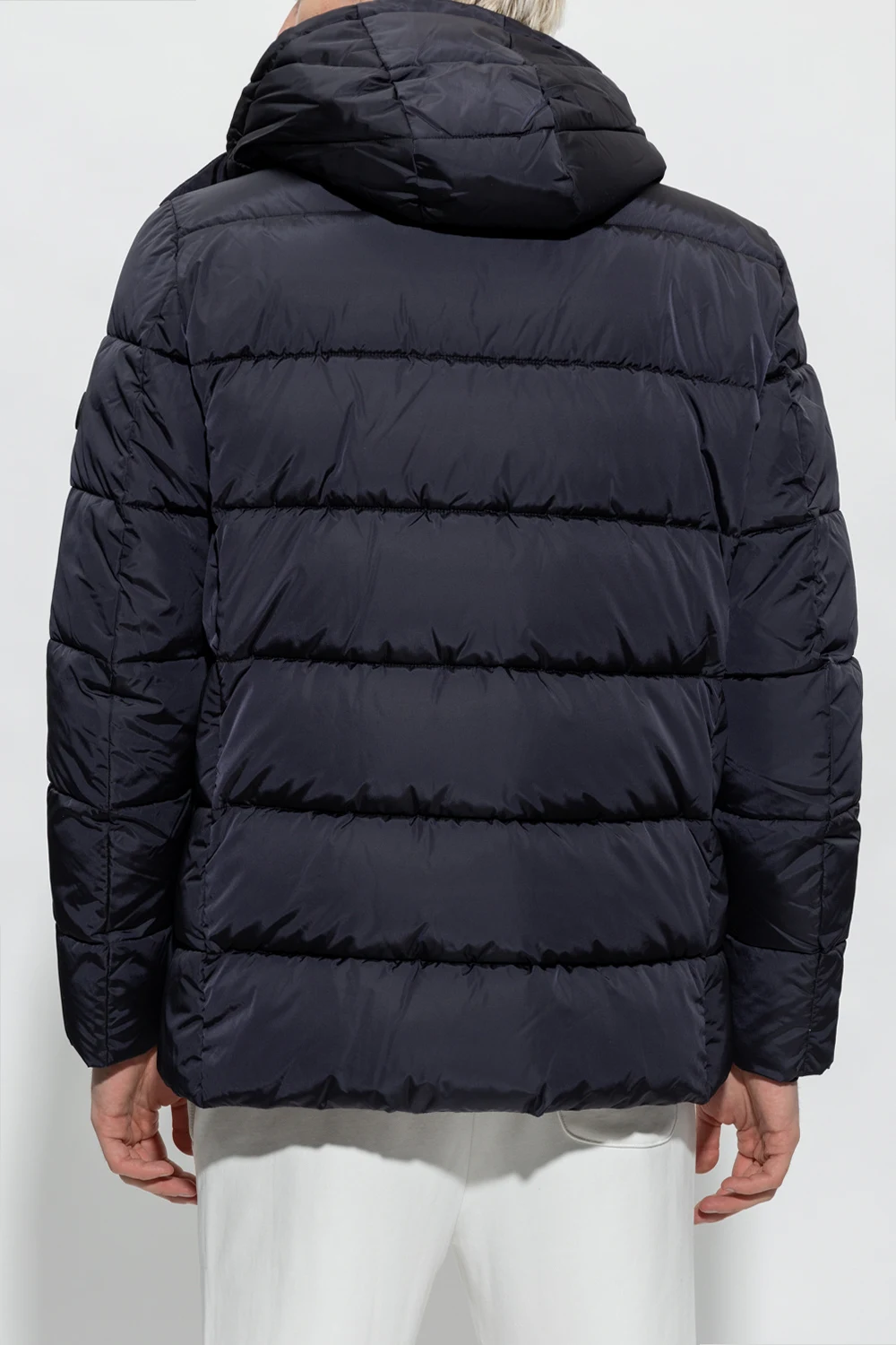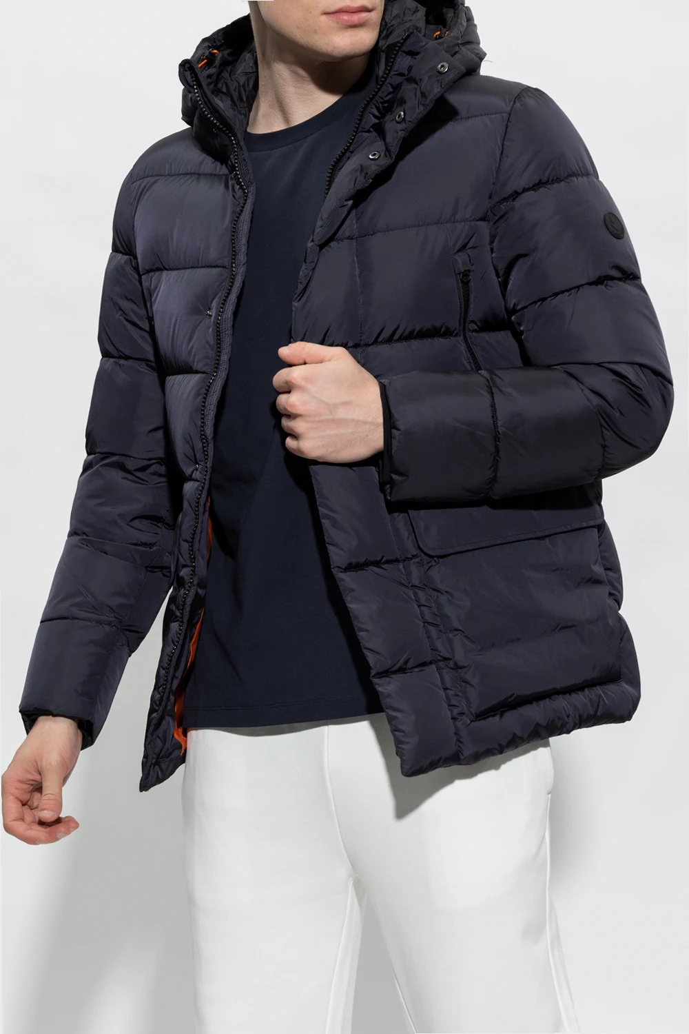 Navy blue ‘Cliff’ quilted jacket with a drawstring hood from Save The Duck. Padded with synthetic down Plumtech®, this style offers waterproof and windproof properties, secures with a two-way zipper and snaps and features two zip pockets and two snap-fastened flap pockets on the front, long sleeves and a branded sleeve patch. Temperature range: from -5°C up to +10°C.