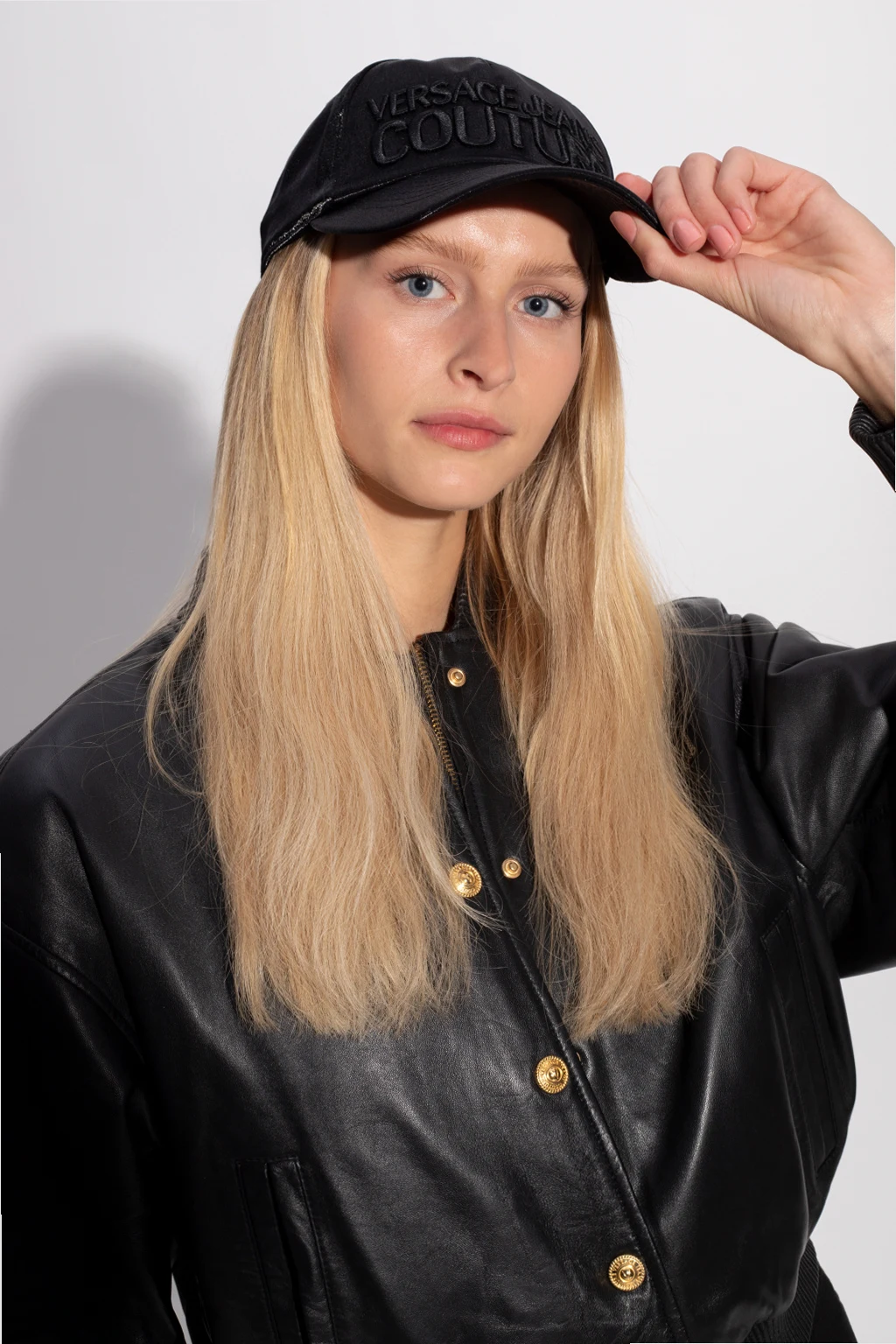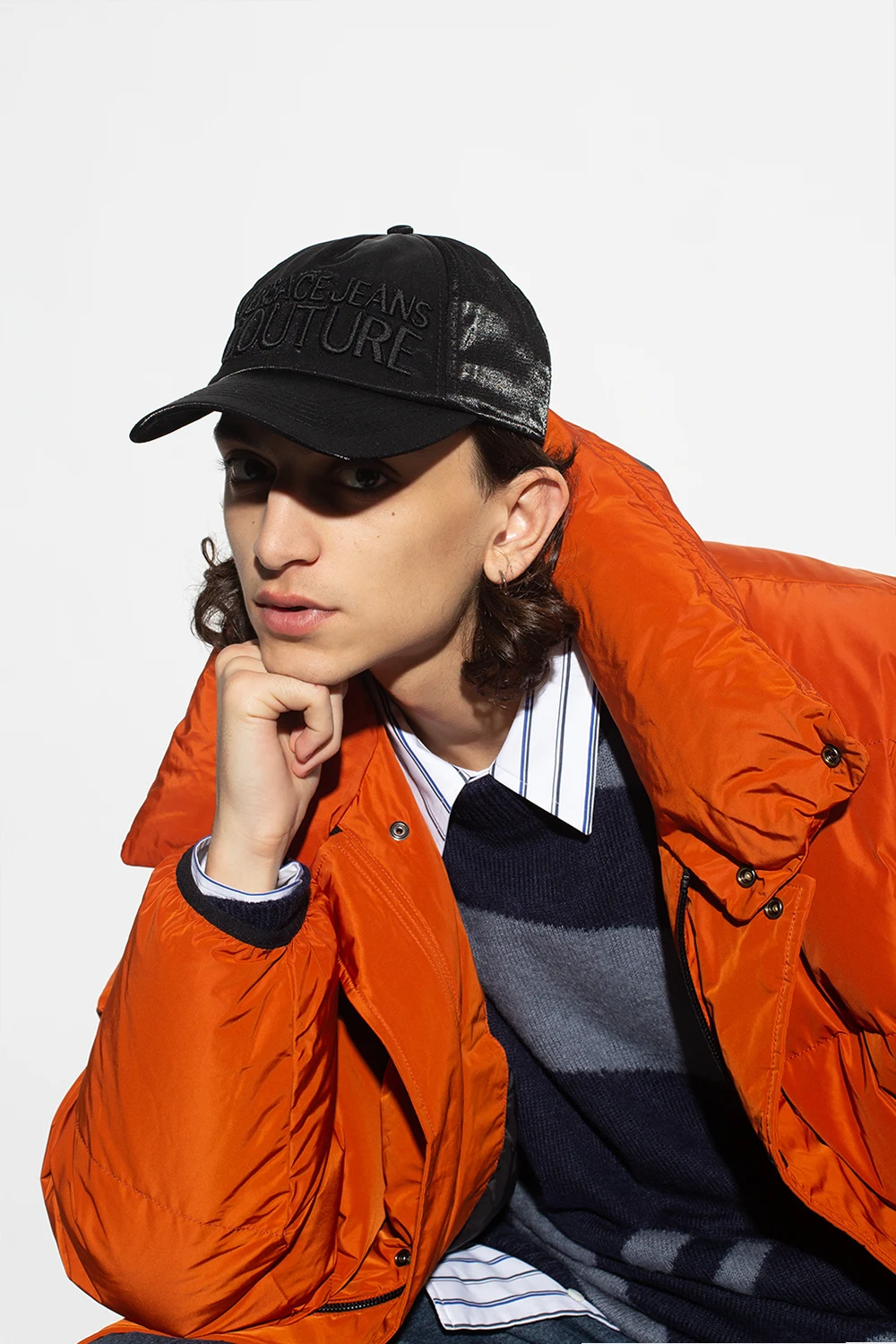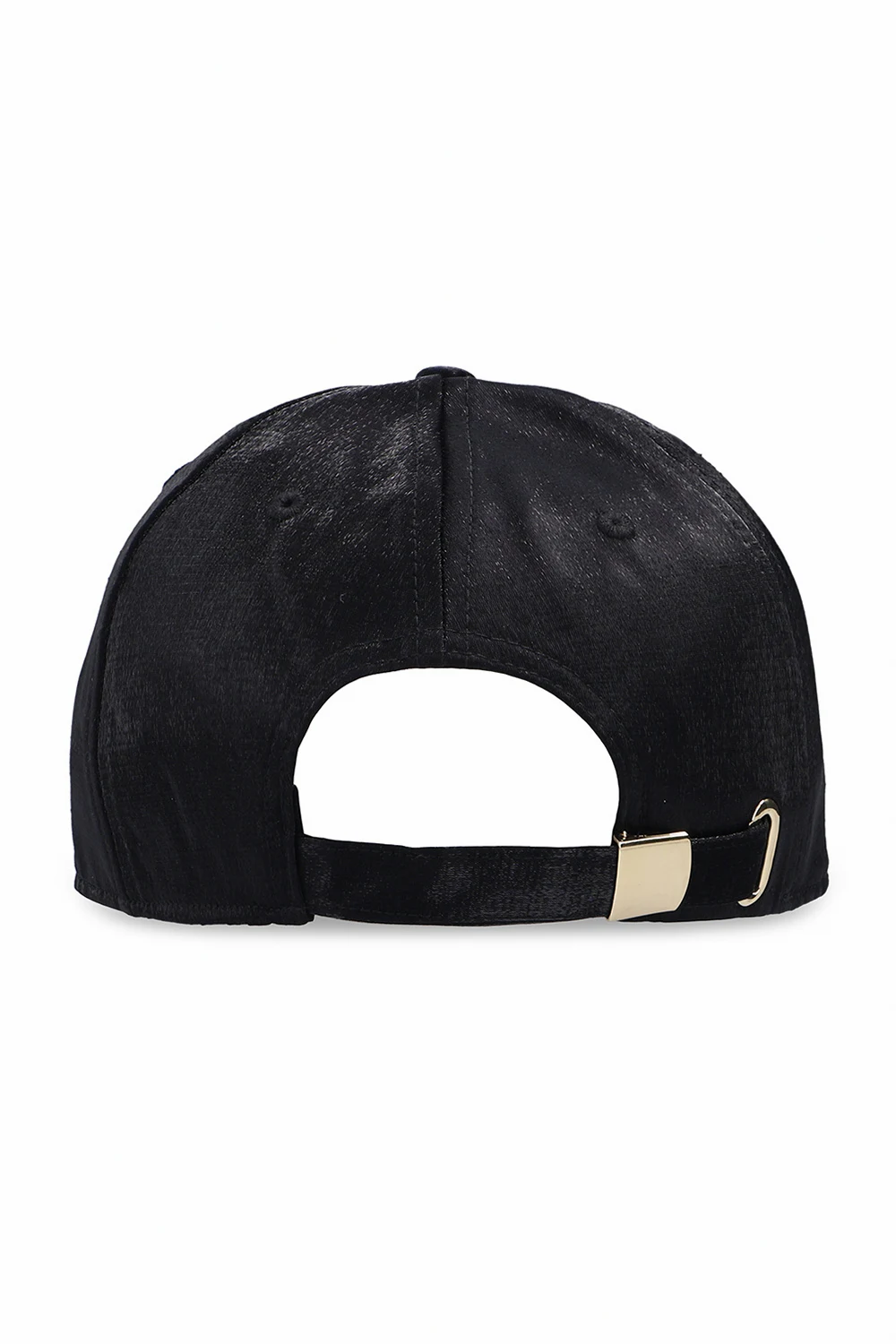 Black baseball cap from Versace Jeans Couture. Crafted from a glistening fabric, this item showcases the brand's logo embroidered on the front and a buckle adjuster on the back.