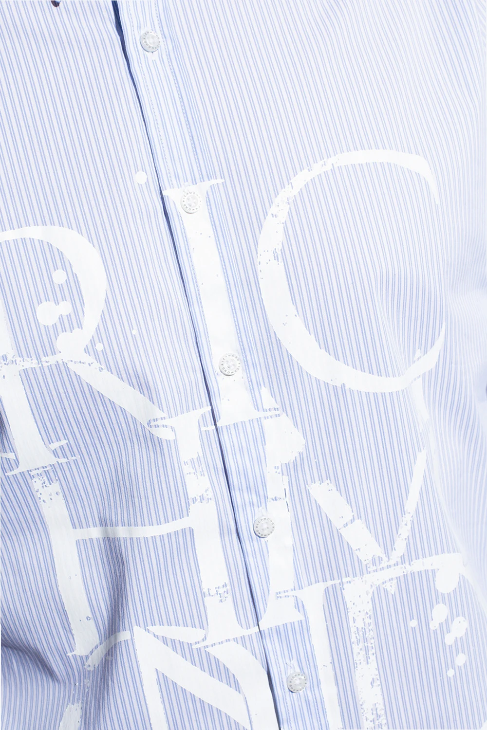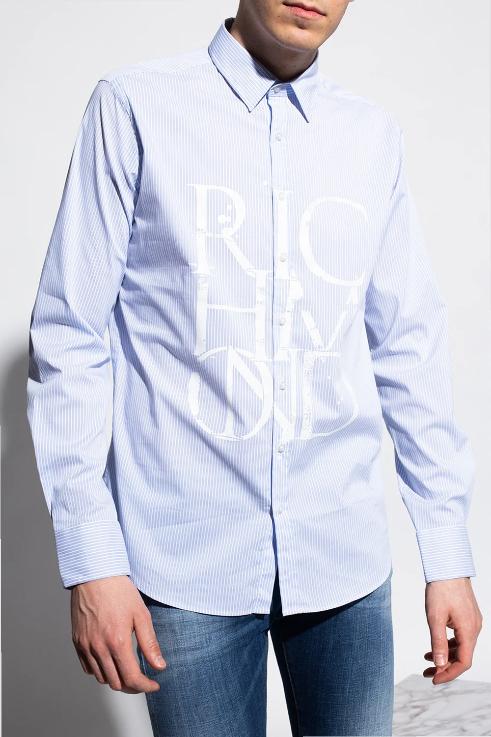 Blue and white shirt from John Richmond. Fastened with buttons, this design features a stripe pattern and a white logo print.