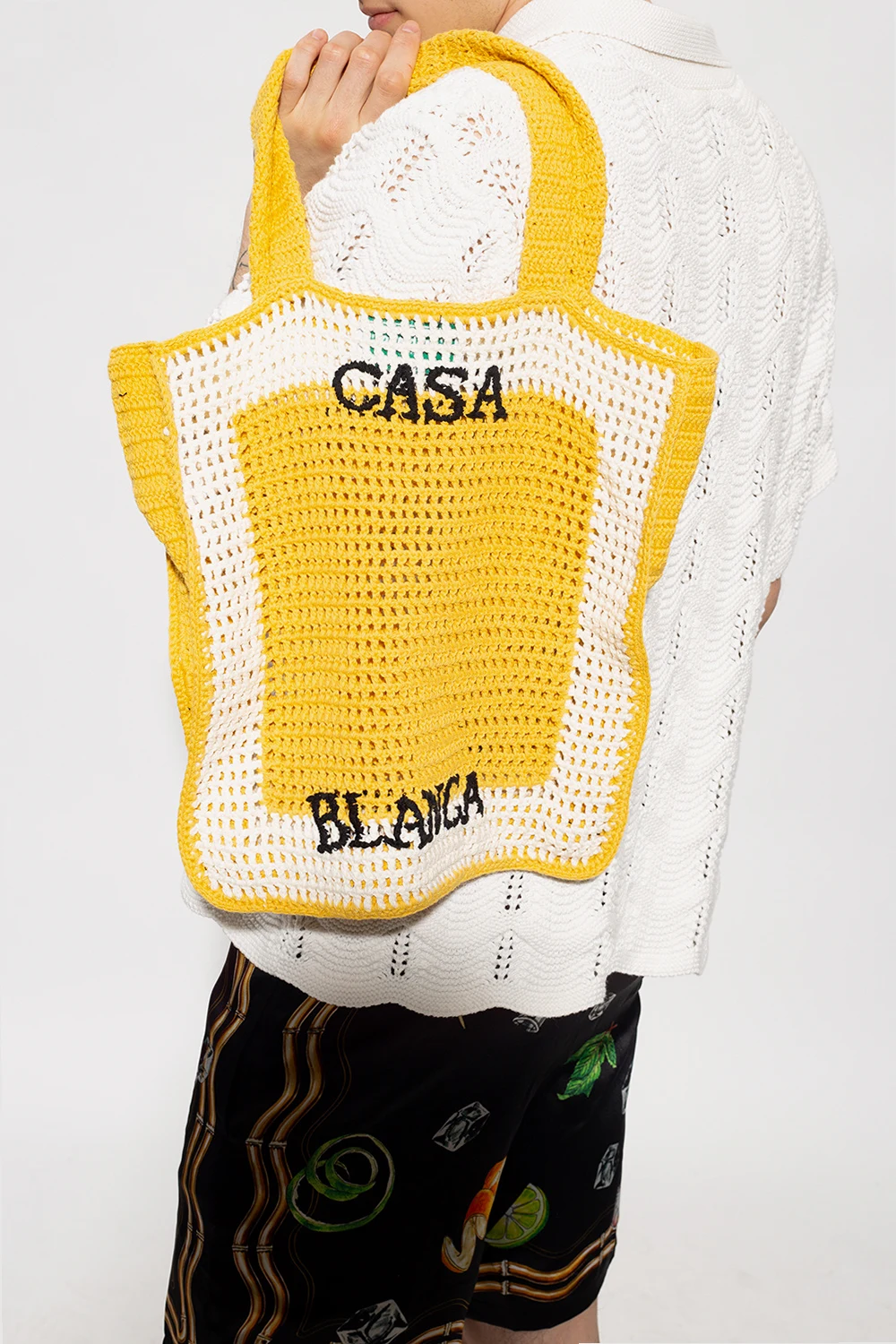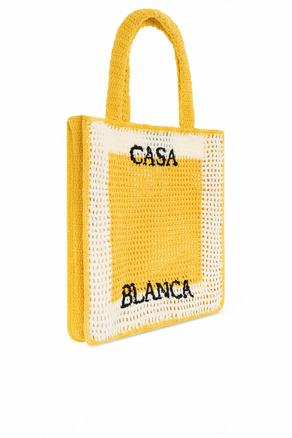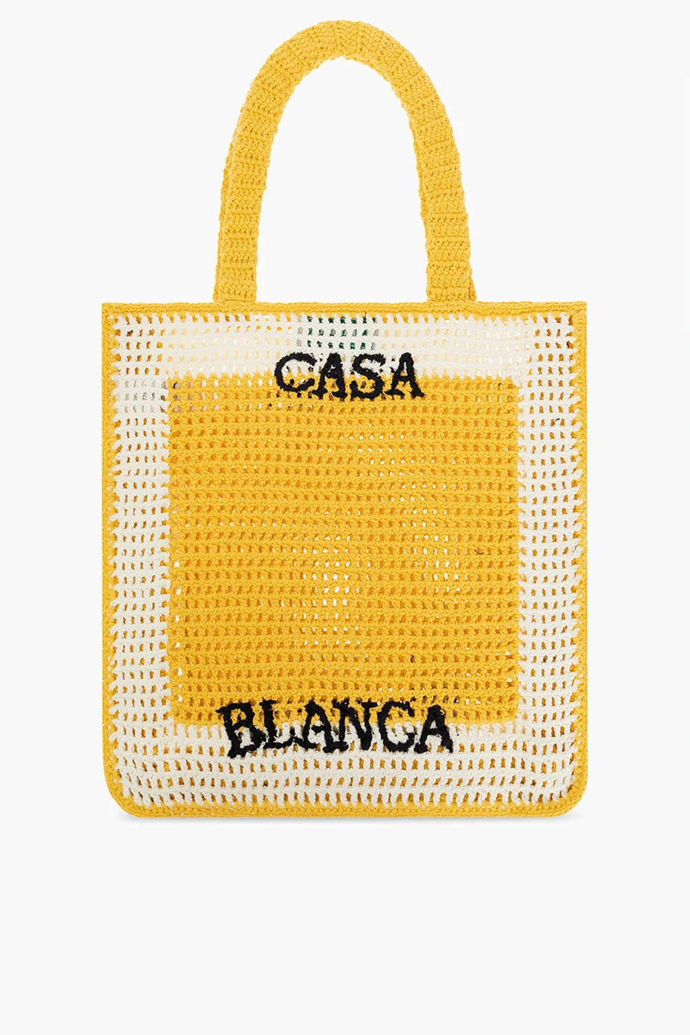 Yellow and cream shopper bag from Casablanca. Crafted from cotton with a crochet finish, this design features two half-round handles and an embroidered black logo.